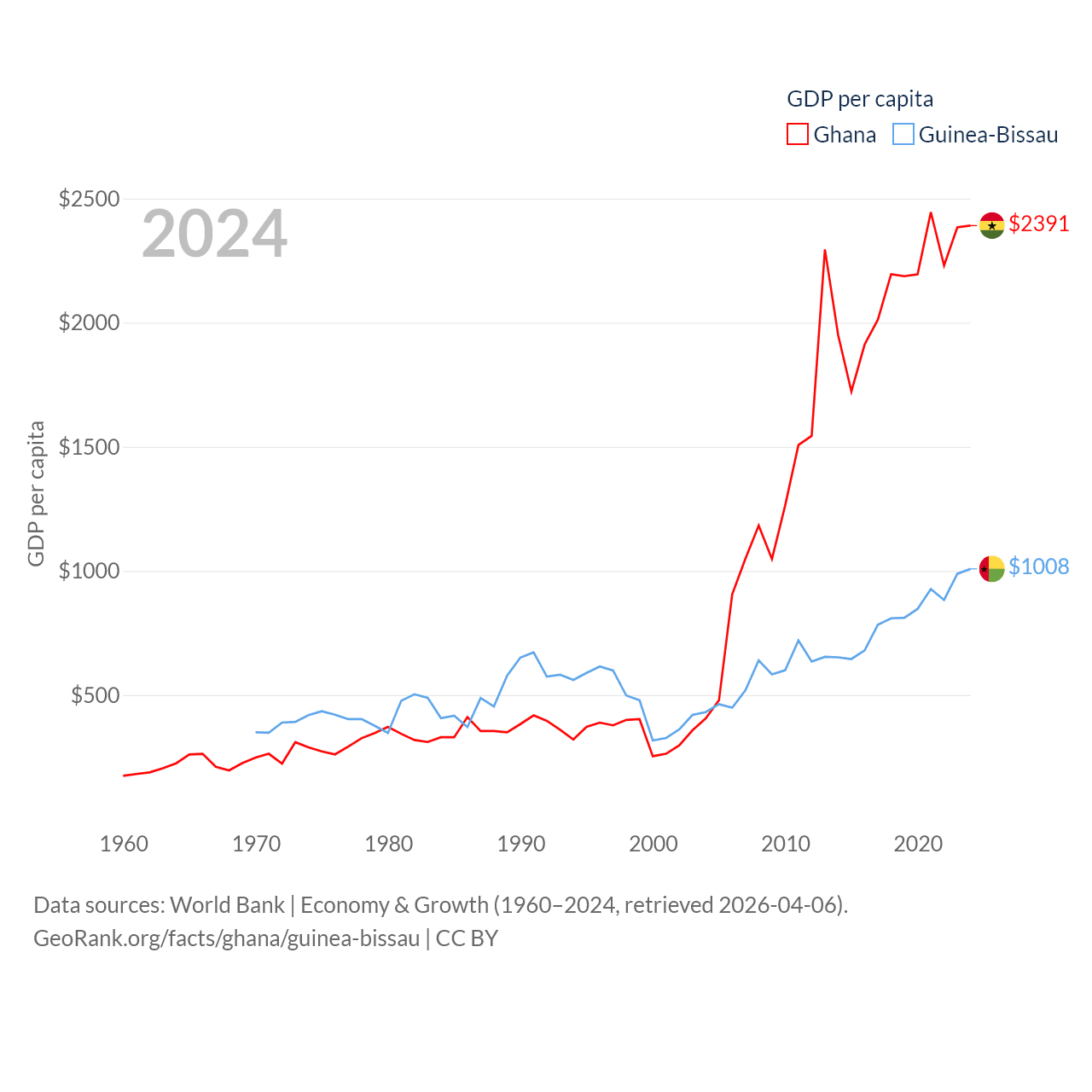 By GDP, Ghana ranks 80/197 ($82.3B) and Guinea-Bissau ranks 176/197 ($2.22B). By GDP per capita, Ghana ranks 151/197 ($2,391), while Guinea-Bissau ranks 177/197 ($1,008).