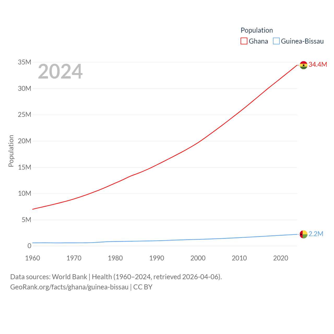 Ghana has a population of 34.4M (ranked 47/197), compared with 2.2M in Guinea-Bissau (ranked 146/197). Ghana's land area is 87,851 sq mi versus 10,857 sq mi for Guinea-Bissau (ranked 81st vs. 139th).