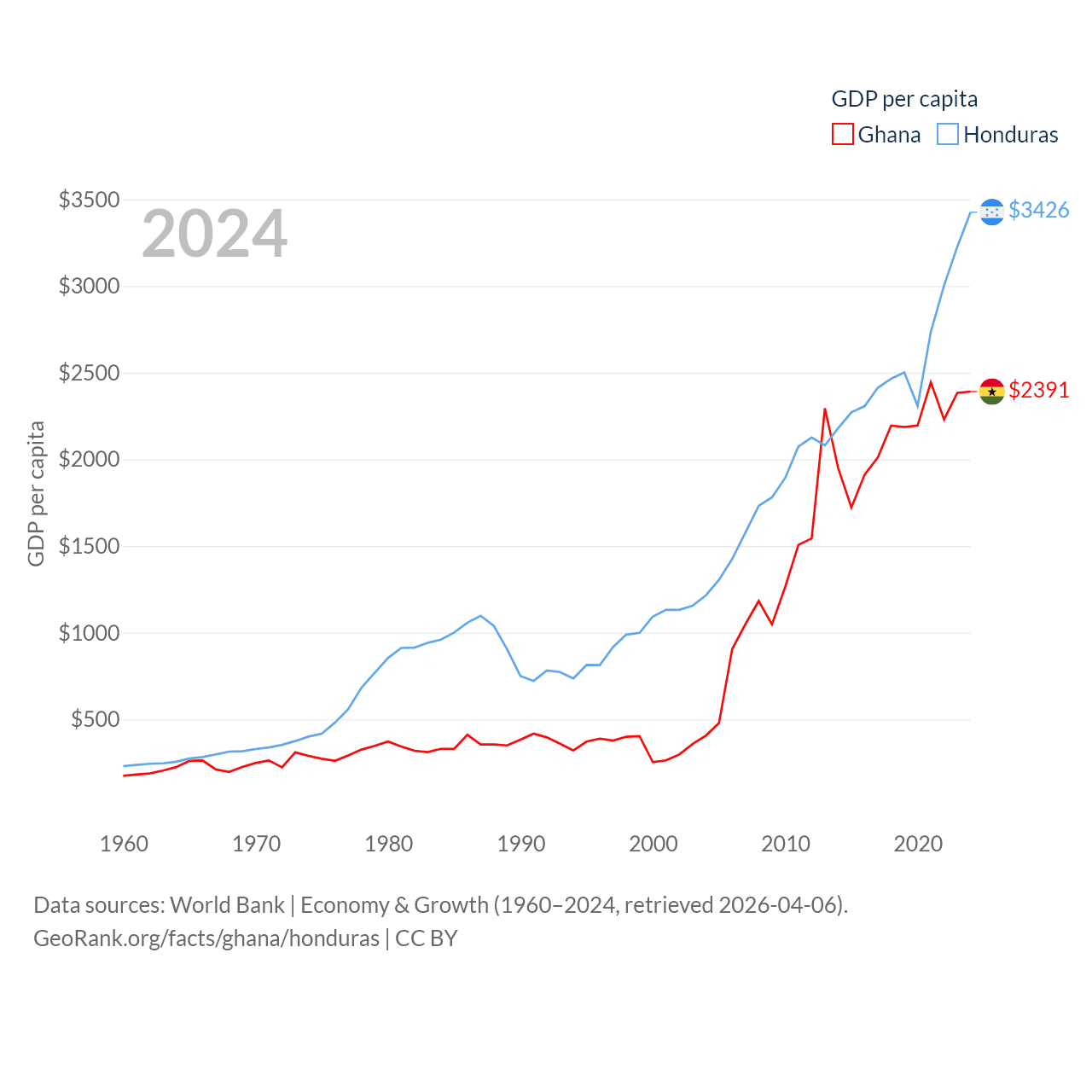 By GDP, Ghana ranks 80/197 ($82.3B) and Honduras ranks 104/197 ($37.1B). By GDP per capita, Ghana ranks 151/197 ($2,391), while Honduras ranks 136/197 ($3,426).