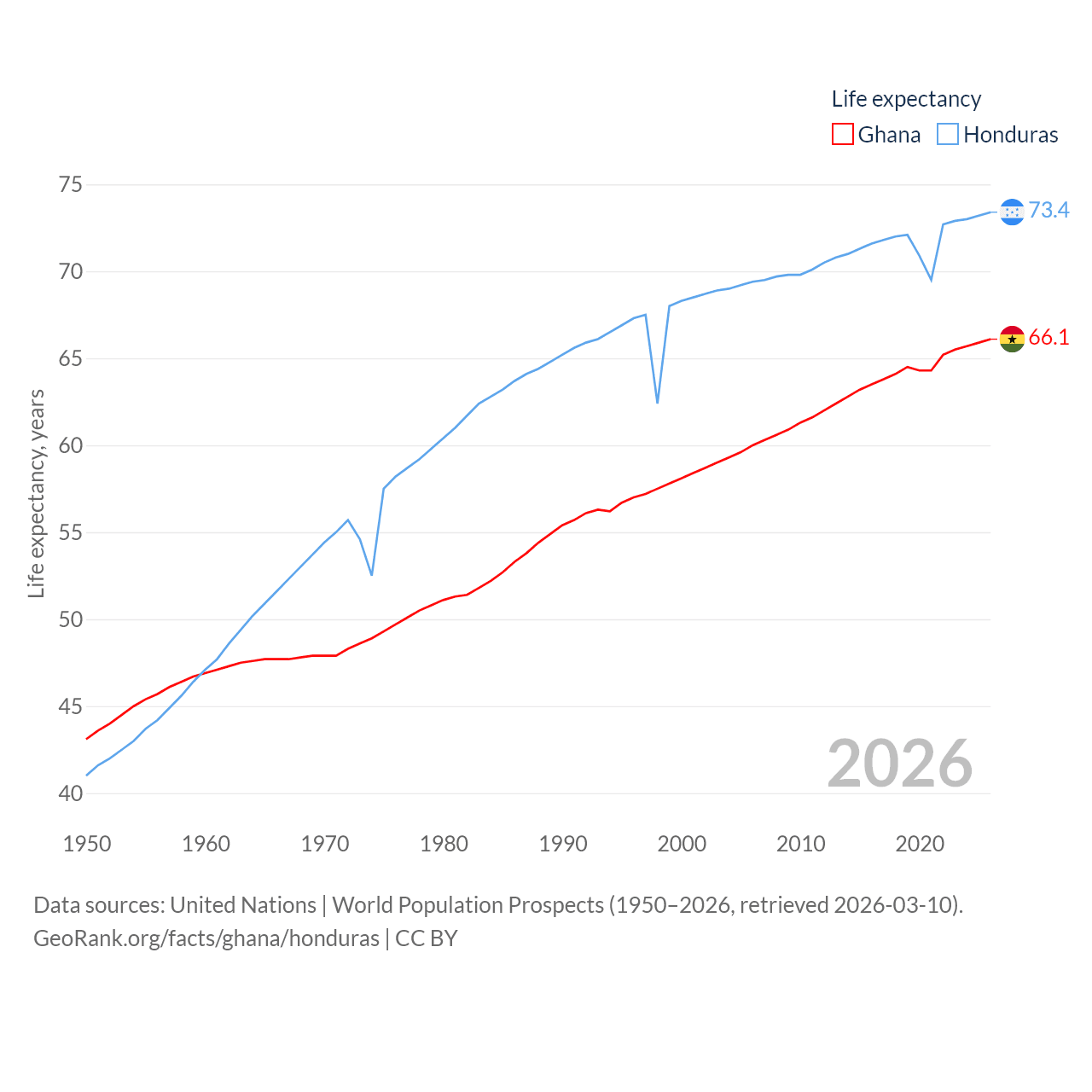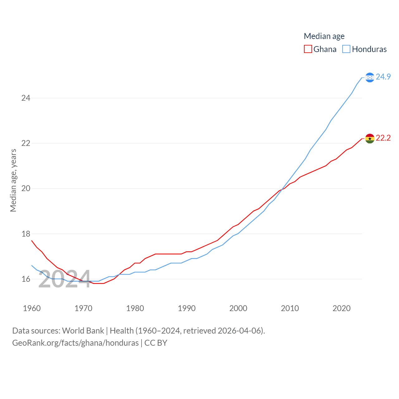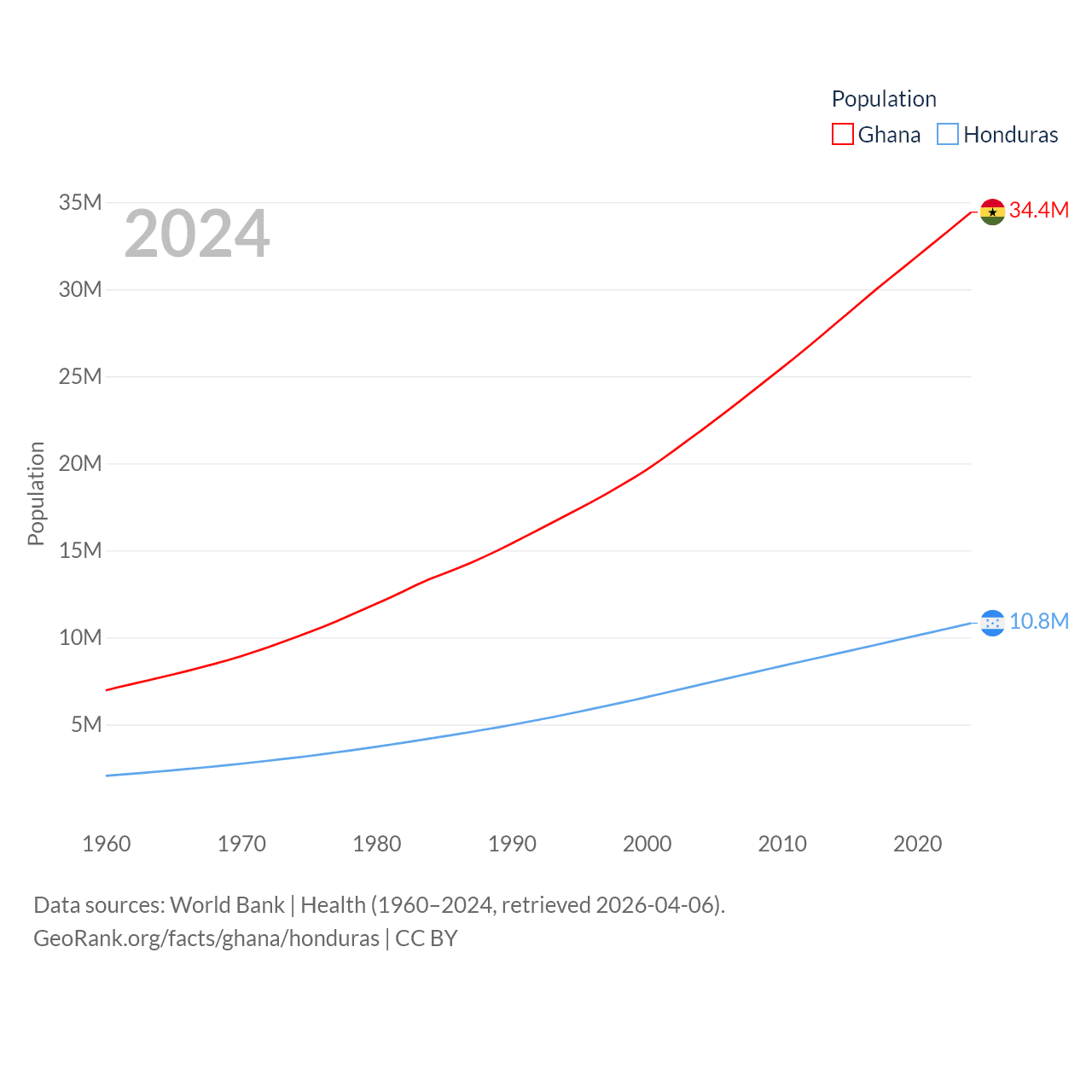 Ghana has a population of 34.4M (ranked 47/197), compared with 10.8M in Honduras (ranked 89/197). Ghana's land area is 87,851 sq mi versus 43,201 sq mi for Honduras (ranked 81st vs. 100th).