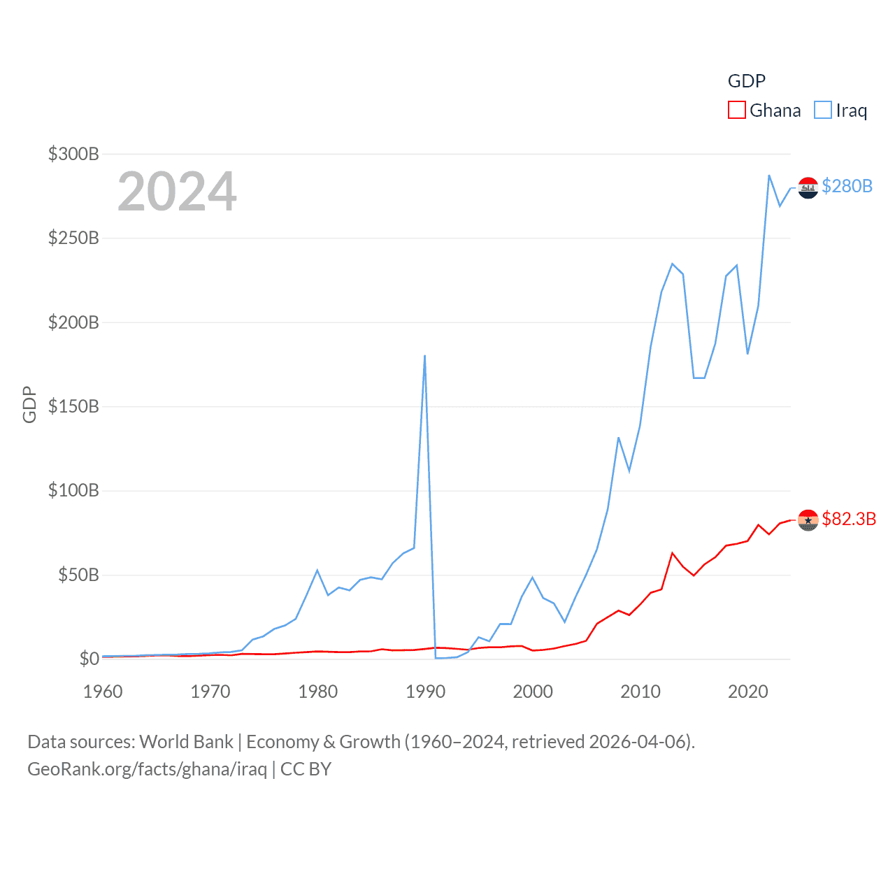 By GDP, Ghana ranks 80/197 ($82.3B) and Iraq ranks 50/197 ($280B). By GDP per capita, Ghana ranks 151/197 ($2,391), while Iraq ranks 113/197 ($6,074).