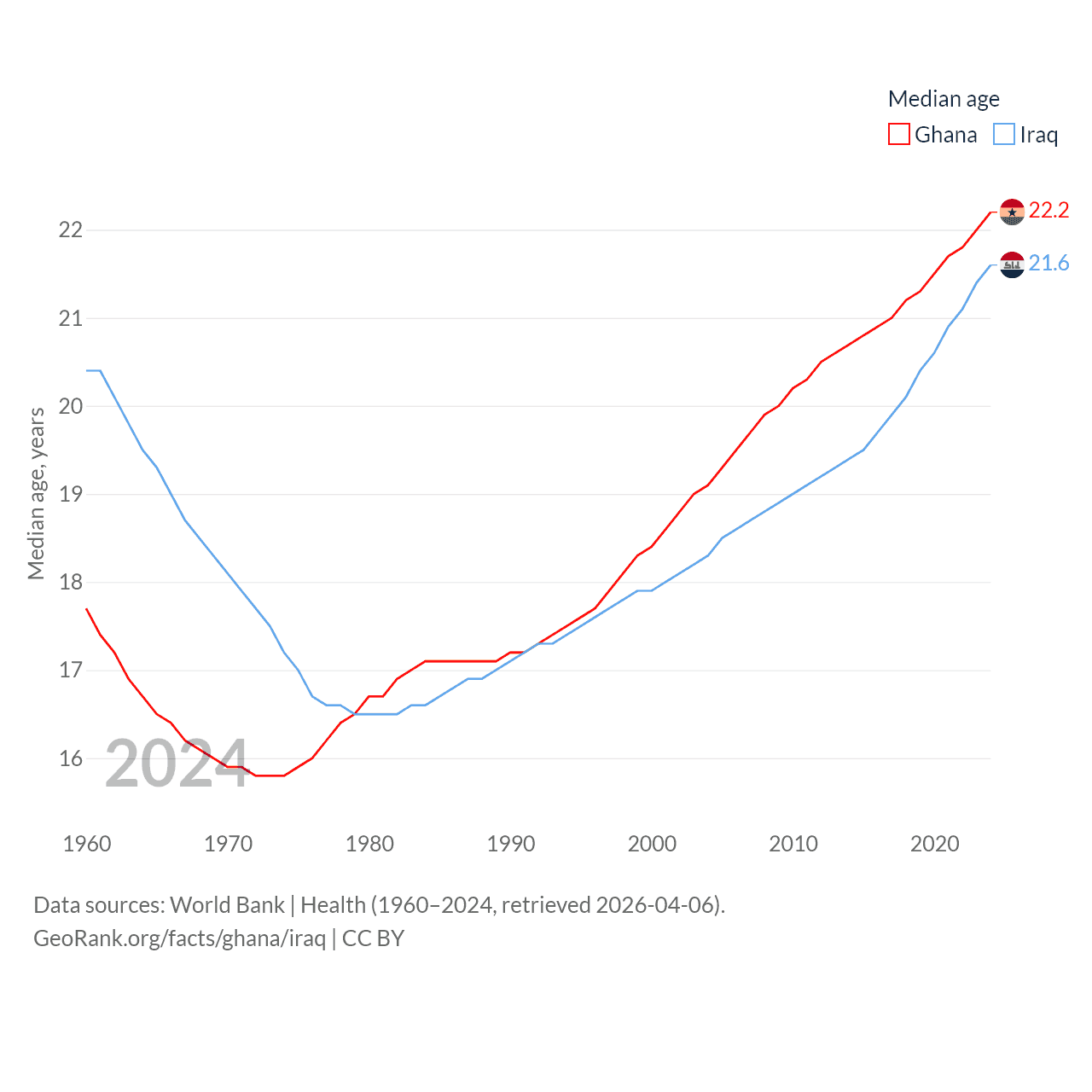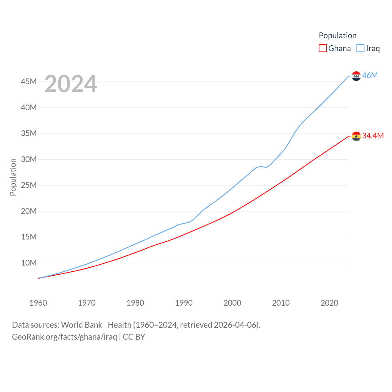 Ghana has a population of 34.4M (ranked 47/197), compared with 46M in Iraq (ranked 34/197). Ghana's land area is 87,851 sq mi versus 167,619 sq mi for Iraq (ranked 81st vs. 57th).