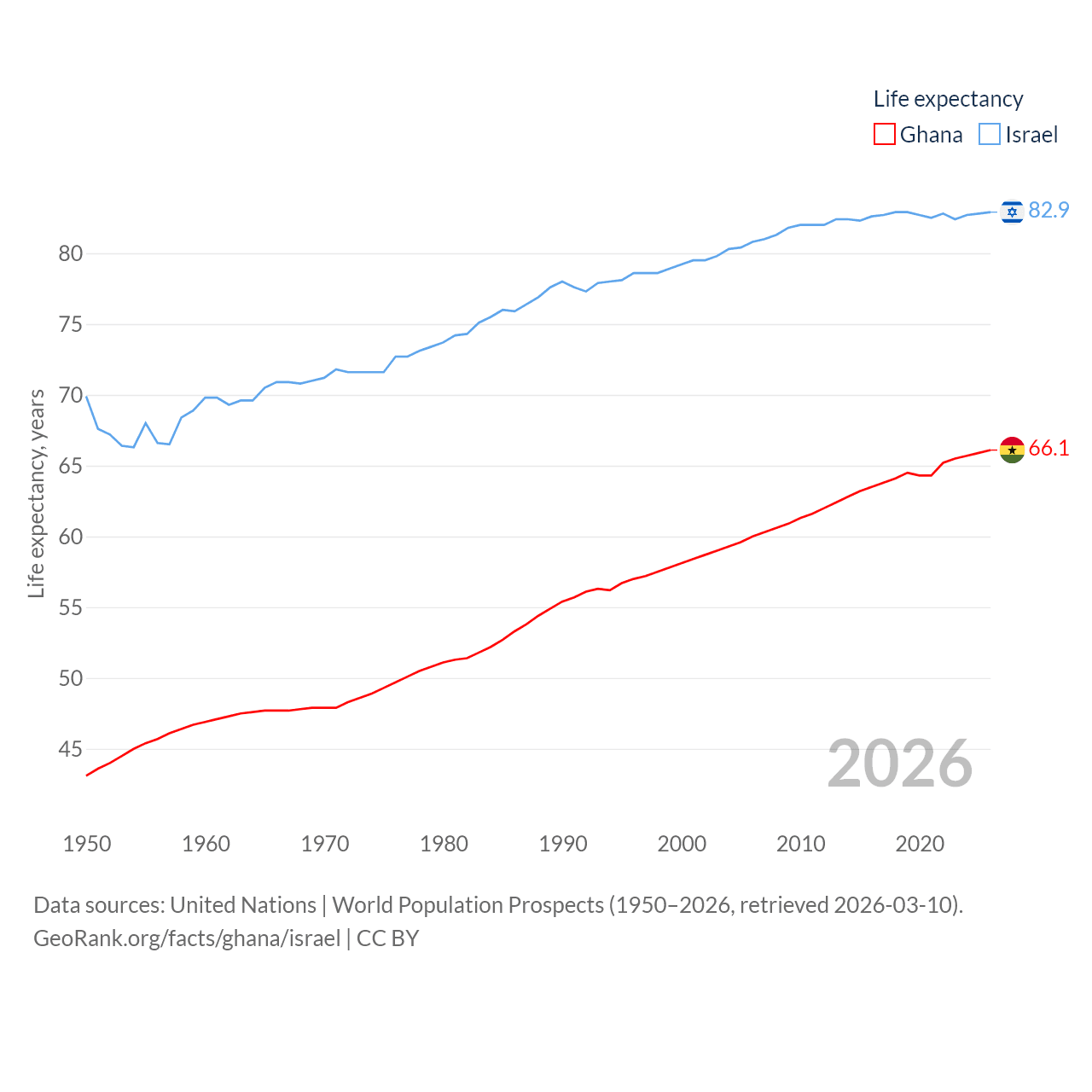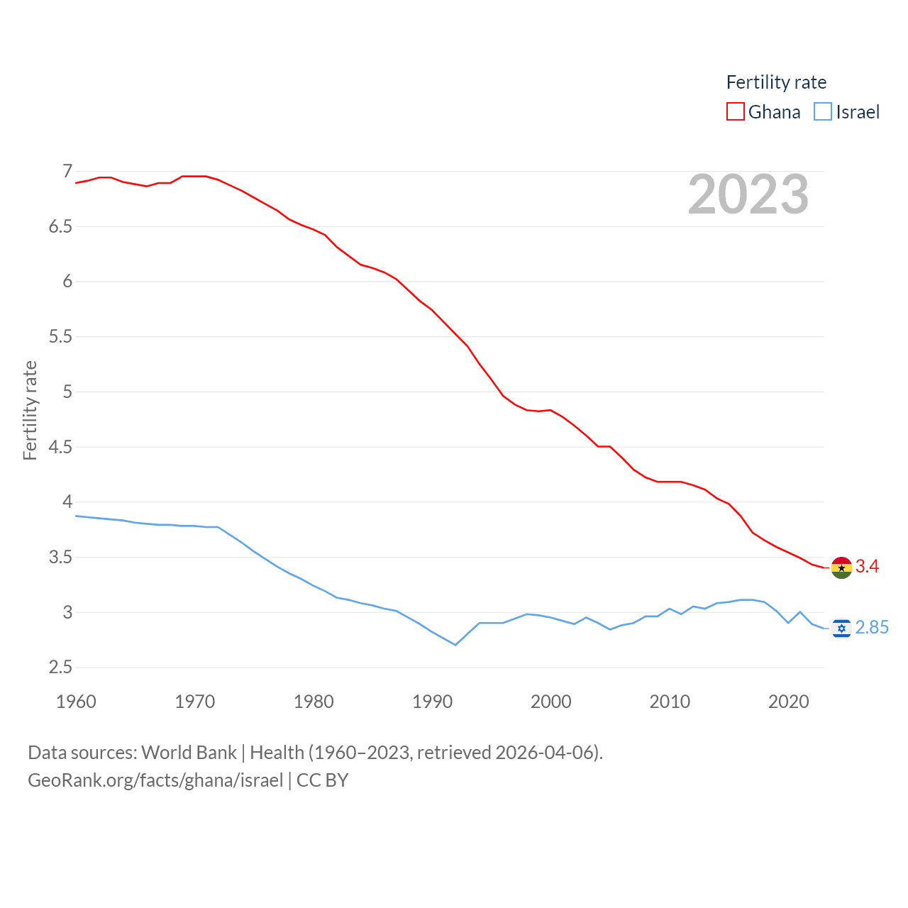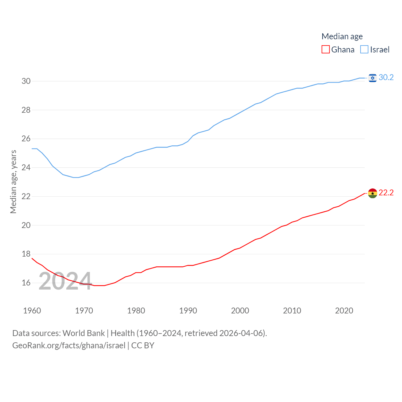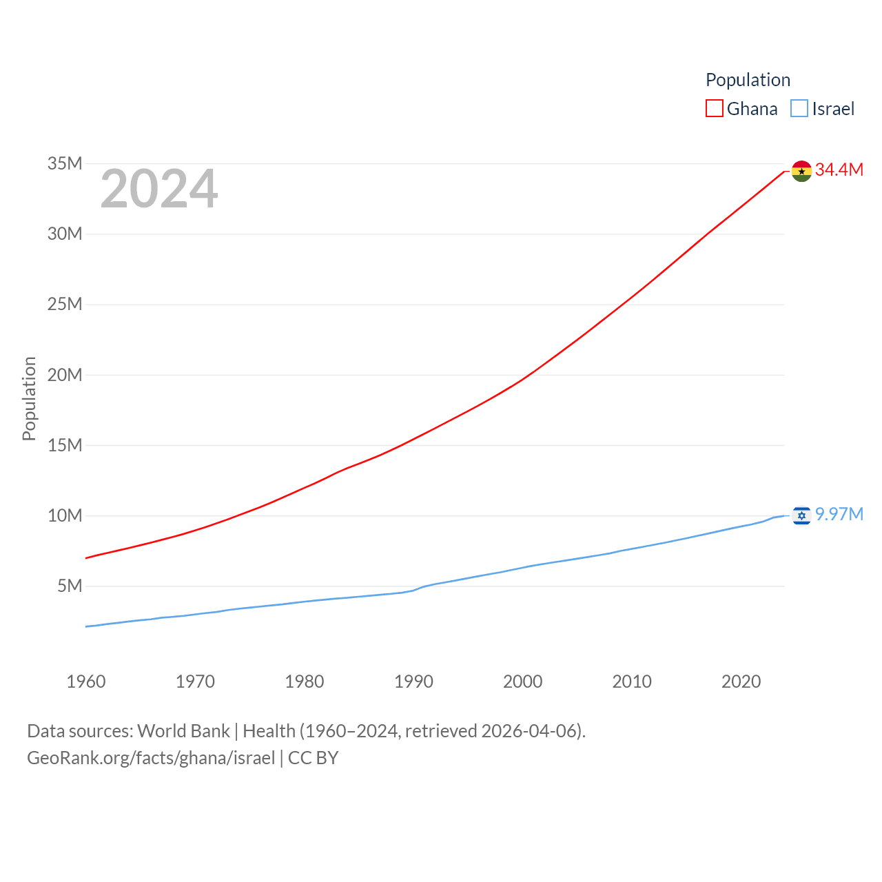 Ghana has a population of 34.4M (ranked 47/197), compared with 9.97M in Israel (ranked 96/197). Ghana's land area is 87,851 sq mi versus 8,355 sq mi for Israel (ranked 81st vs. 149th).