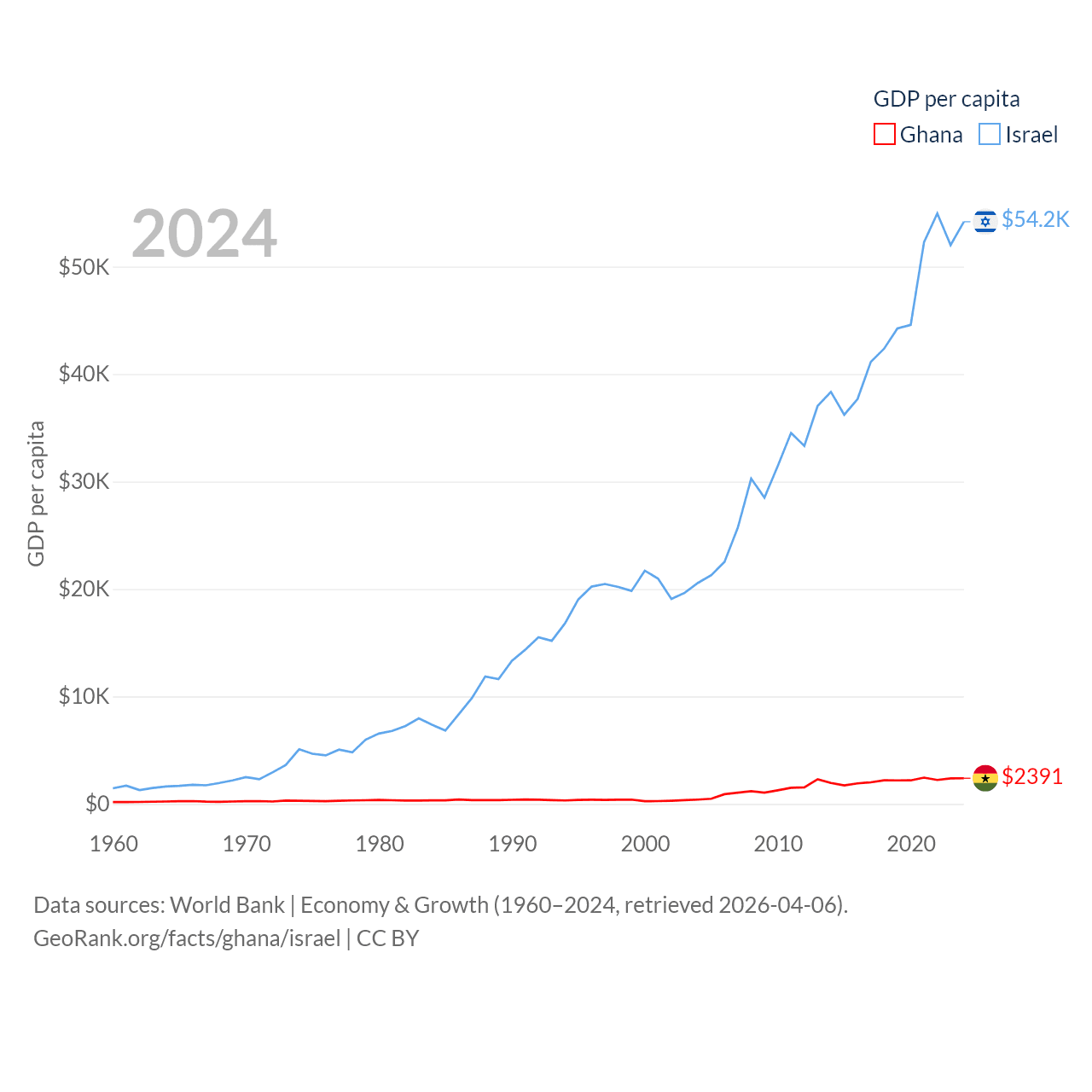 By GDP, Ghana ranks 80/197 ($82.3B) and Israel ranks 29/197 ($540B). By GDP per capita, Ghana ranks 151/197 ($2,391), while Israel ranks 21/197 ($54,177).