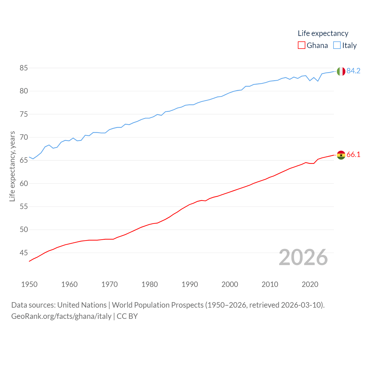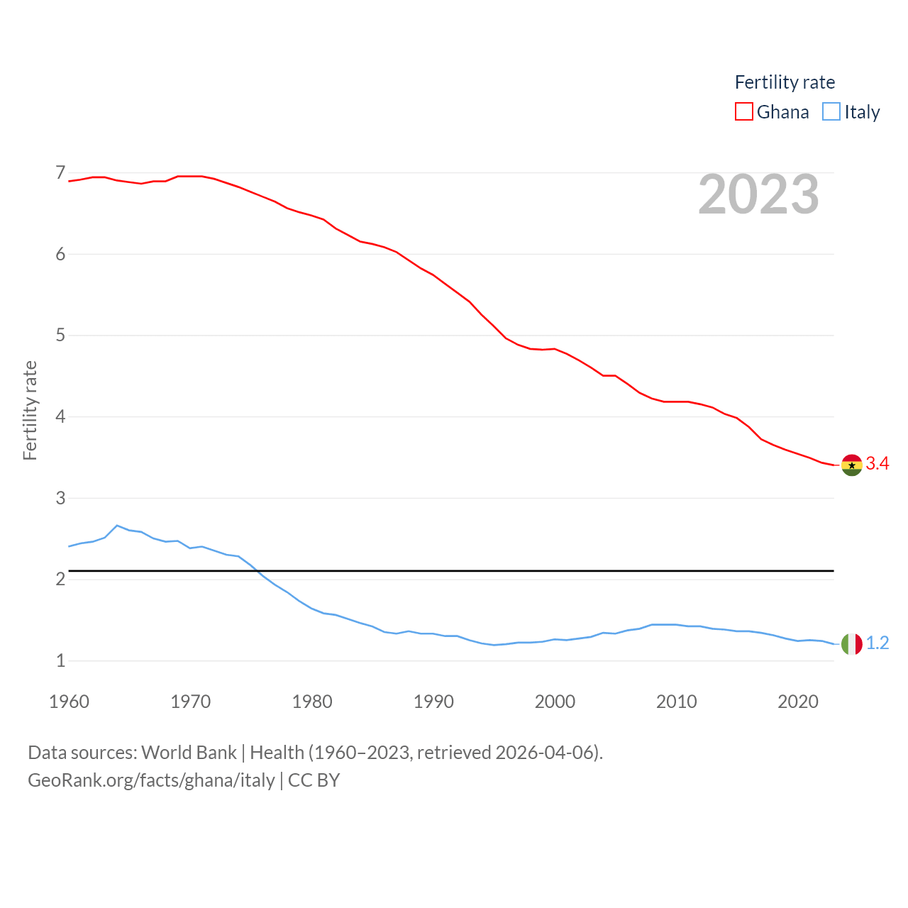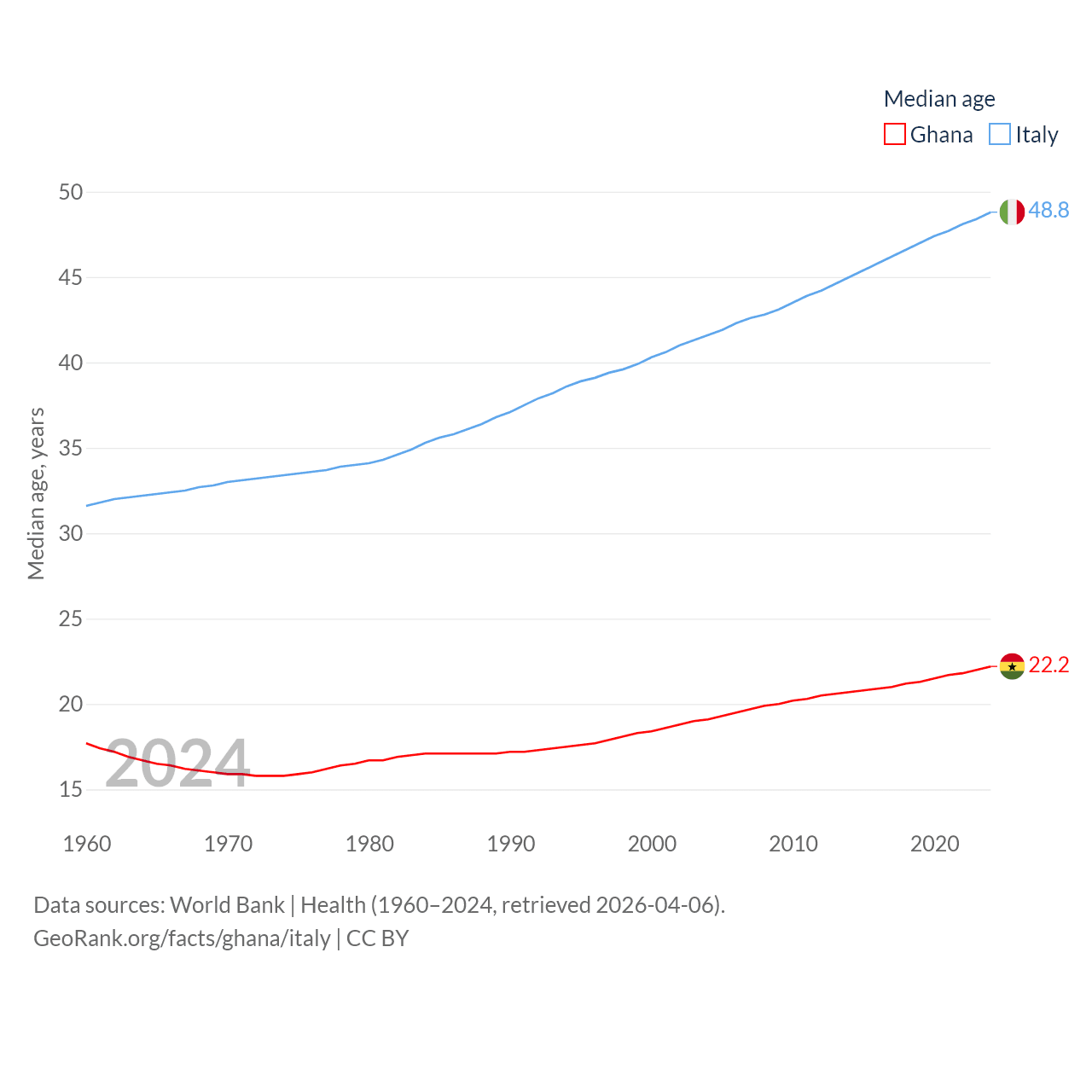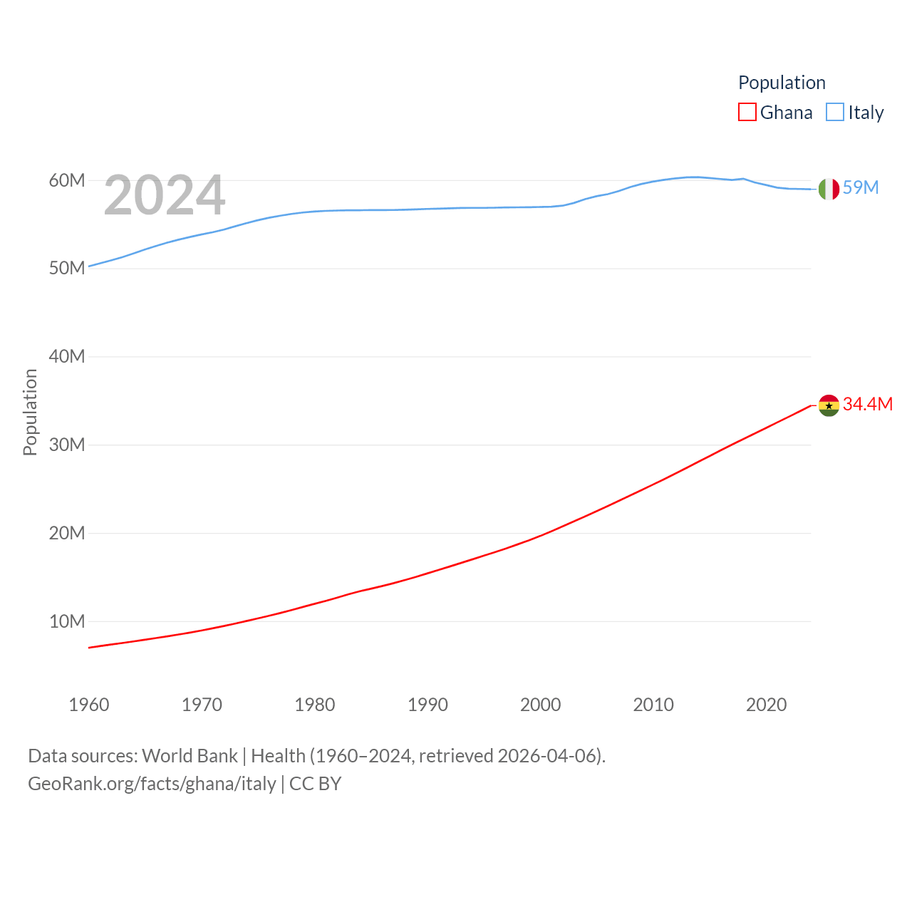 Ghana has a population of 34.4M (ranked 47/197), compared with 59M in Italy (ranked 25/197). Ghana's land area is 87,851 sq mi versus 114,178 sq mi for Italy (ranked 81st vs. 72nd).