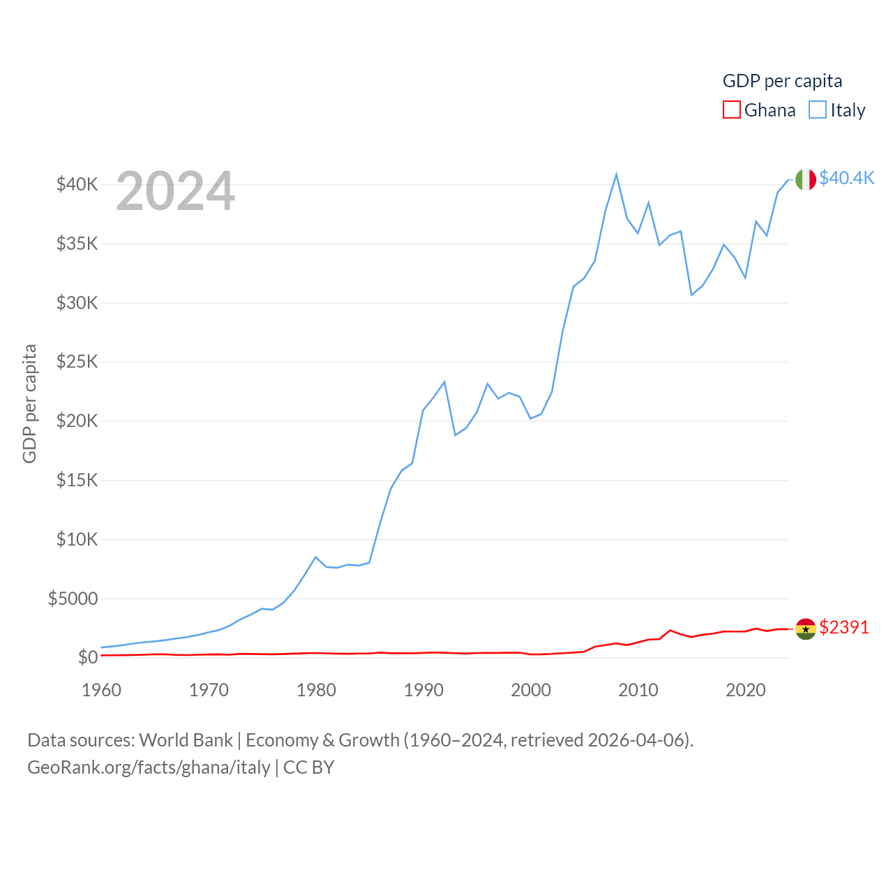 By GDP, Ghana ranks 80/197 ($82.3B) and Italy ranks 8/197 ($2.38T). By GDP per capita, Ghana ranks 151/197 ($2,391), while Italy ranks 29/197 ($40,385).