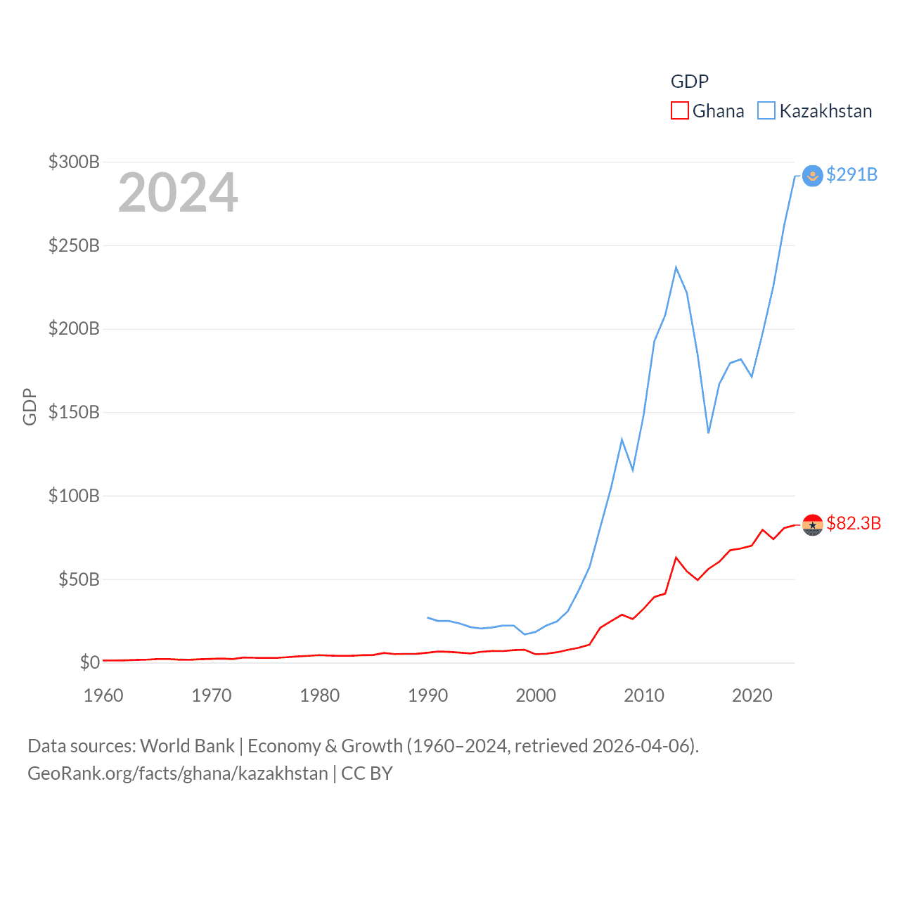 By GDP, Ghana ranks 80/197 ($82.3B) and Kazakhstan ranks 48/197 ($291B). By GDP per capita, Ghana ranks 151/197 ($2,391), while Kazakhstan ranks 71/197 ($14,155).