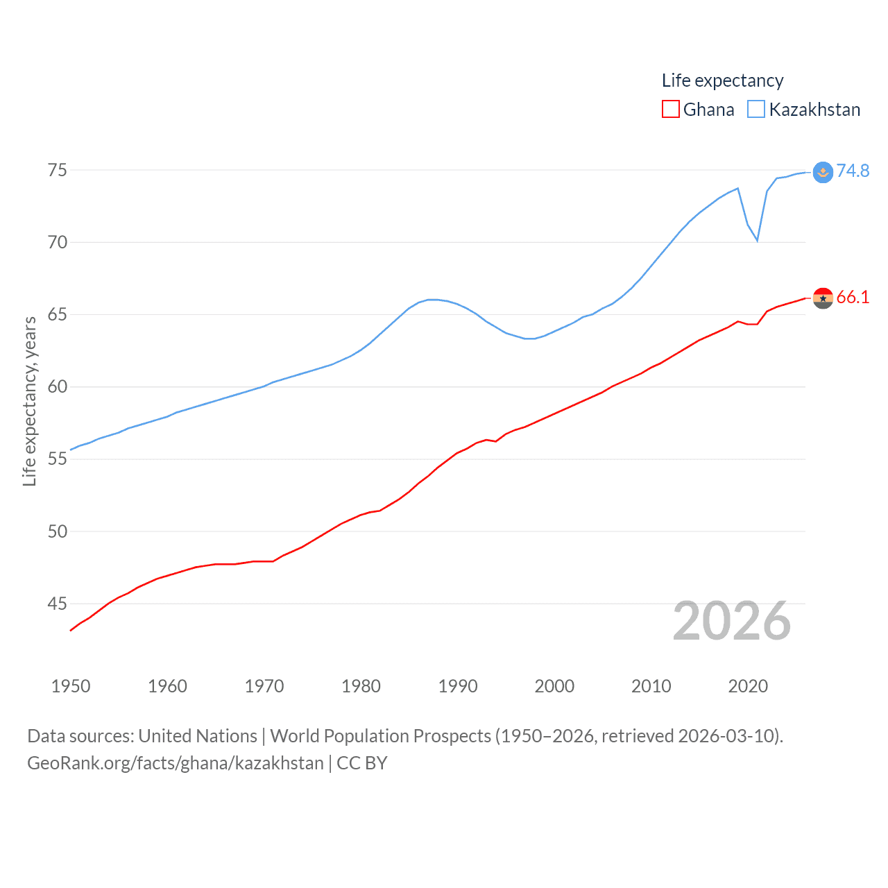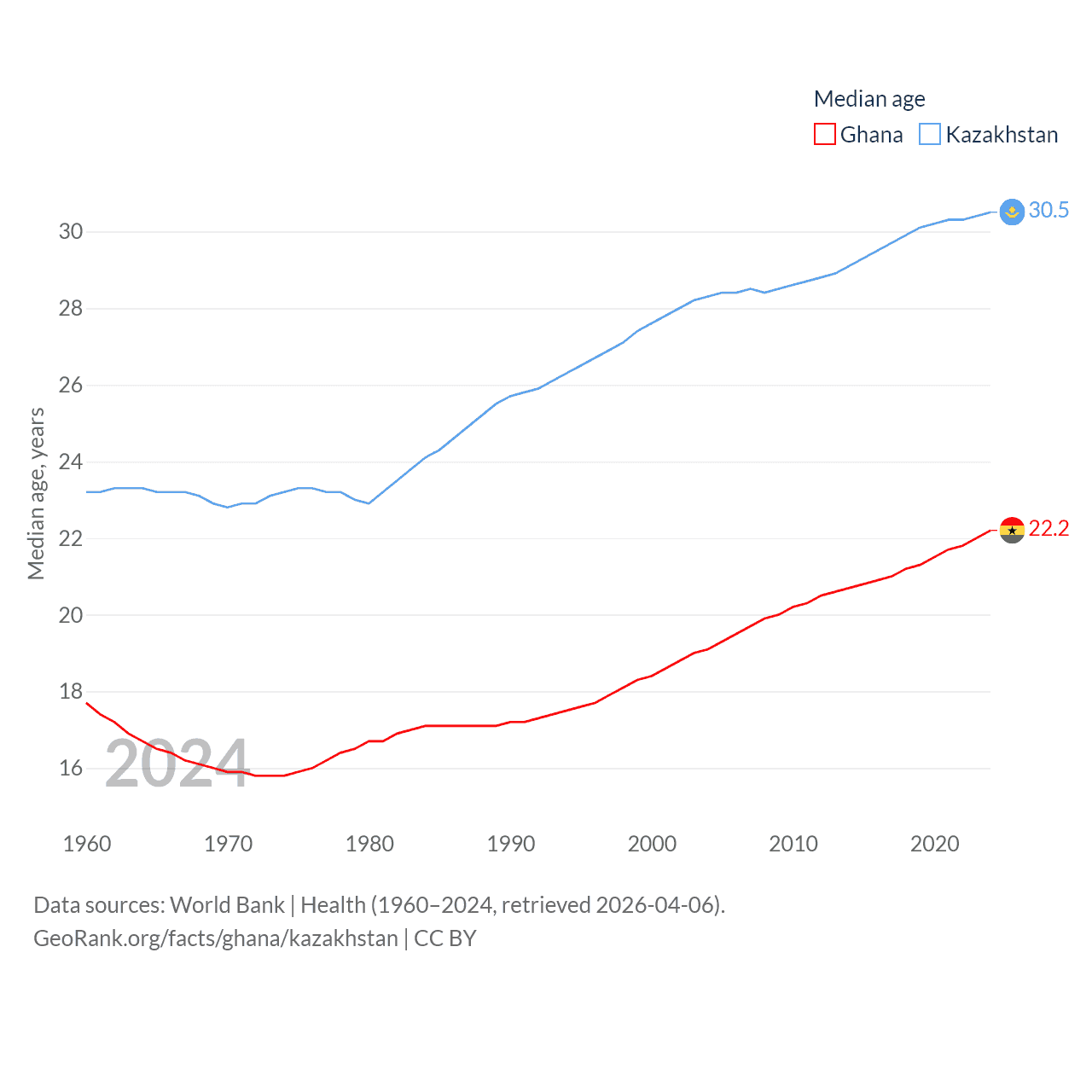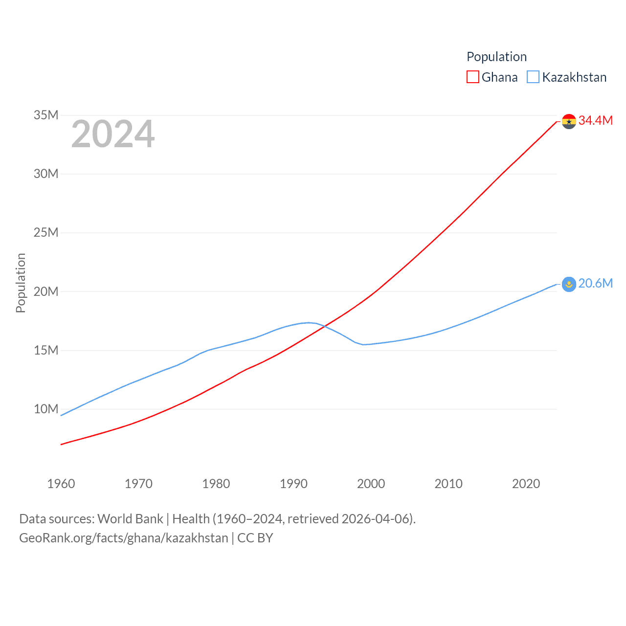 Ghana has a population of 34.4M (ranked 47/197), compared with 20.6M in Kazakhstan (ranked 64/197). Ghana's land area is 87,851 sq mi versus 1,042,360 sq mi for Kazakhstan (ranked 81st vs. 9th).