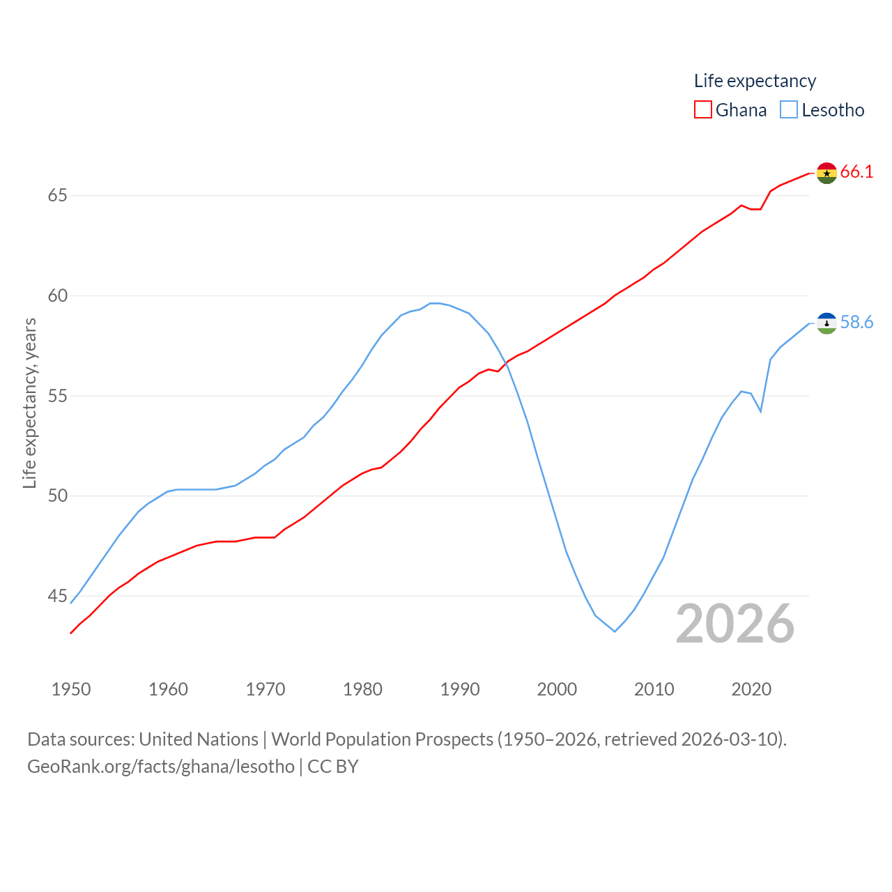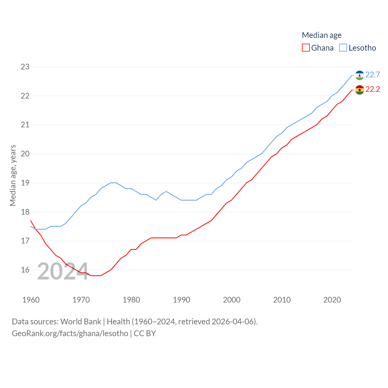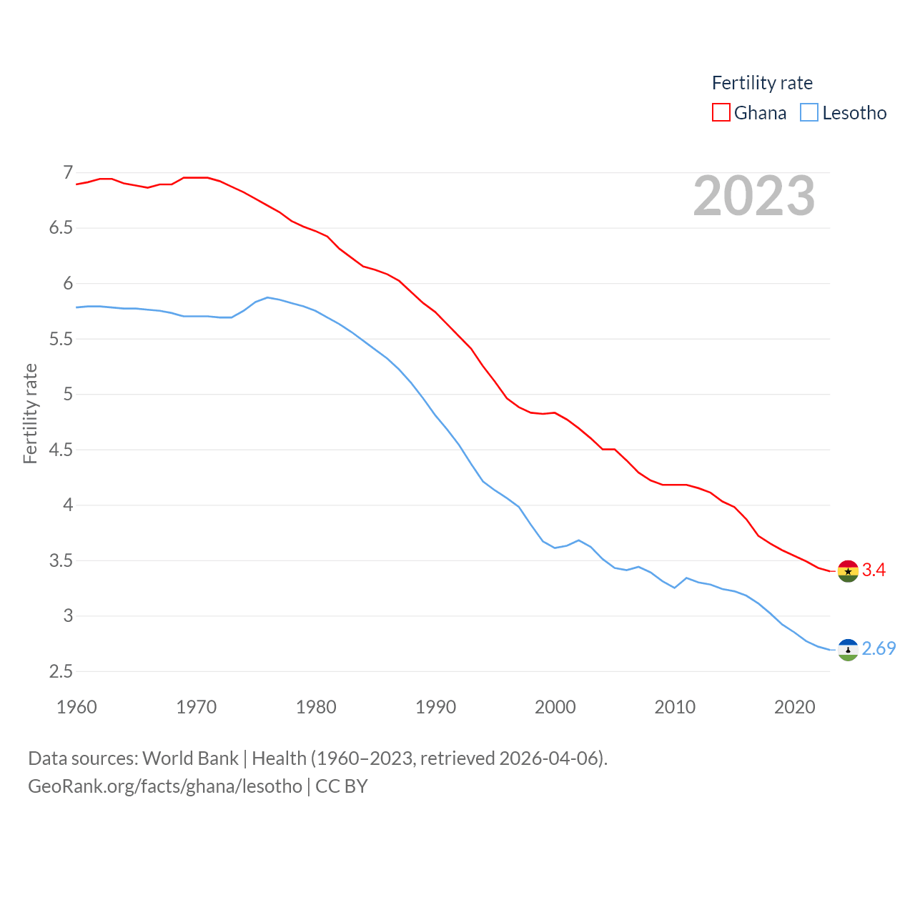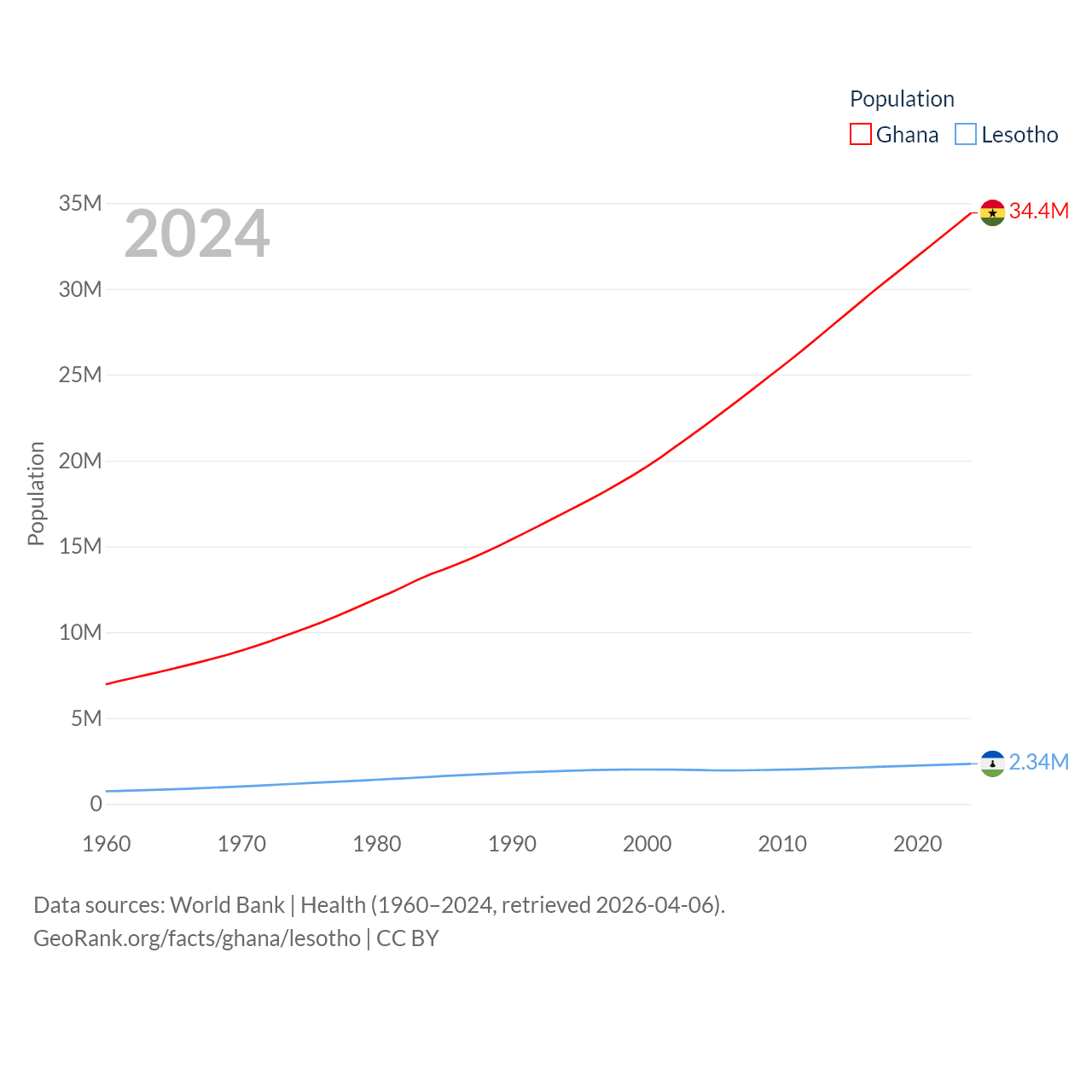 Ghana has a population of 34.4M (ranked 47/197), compared with 2.34M in Lesotho (ranked 145/197). Ghana's land area is 87,851 sq mi versus 11,722 sq mi for Lesotho (ranked 81st vs. 137th).
