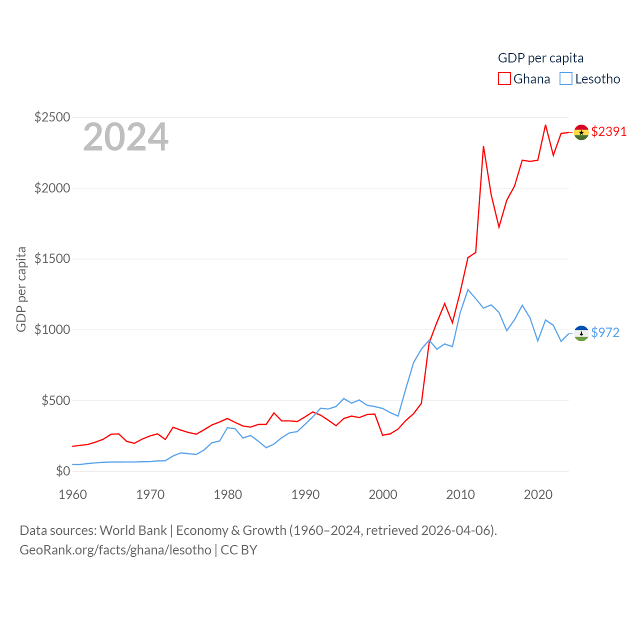 By GDP, Ghana ranks 80/197 ($82.3B) and Lesotho ranks 175/197 ($2.27B). By GDP per capita, Ghana ranks 151/197 ($2,391), while Lesotho ranks 181/197 ($972).
