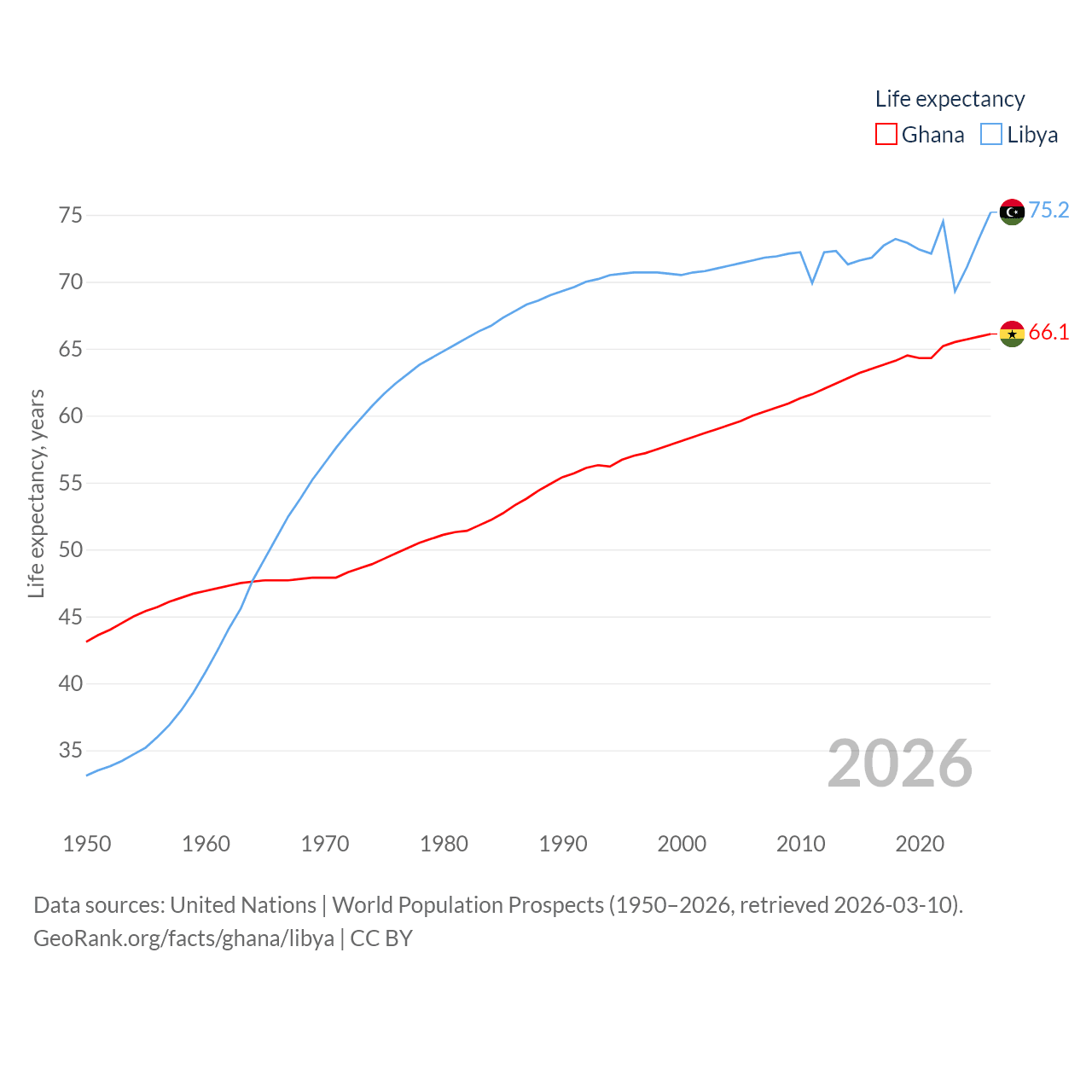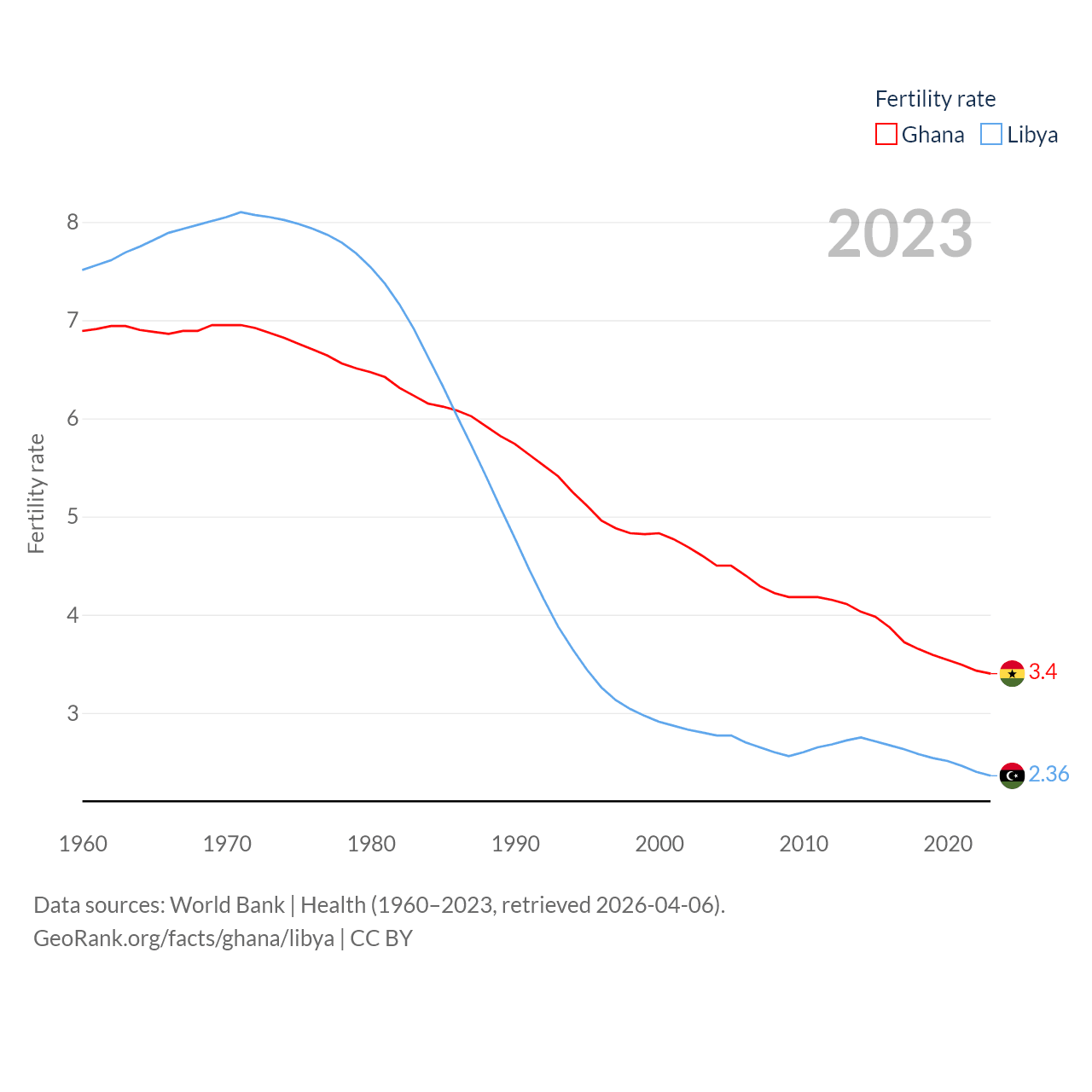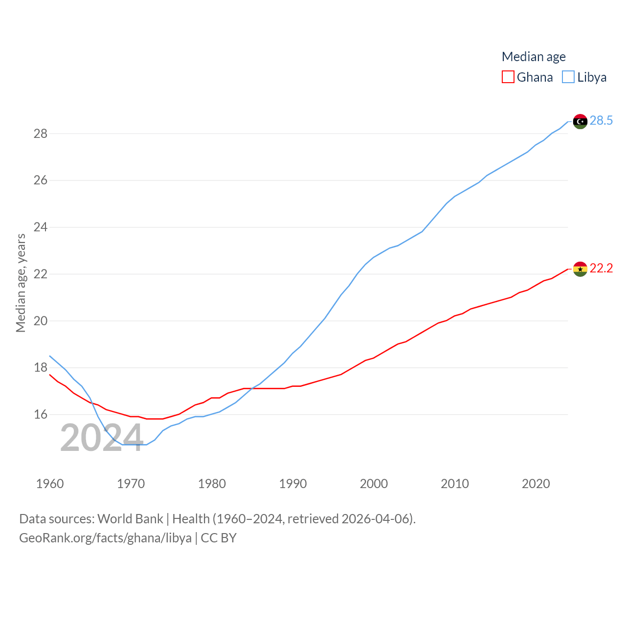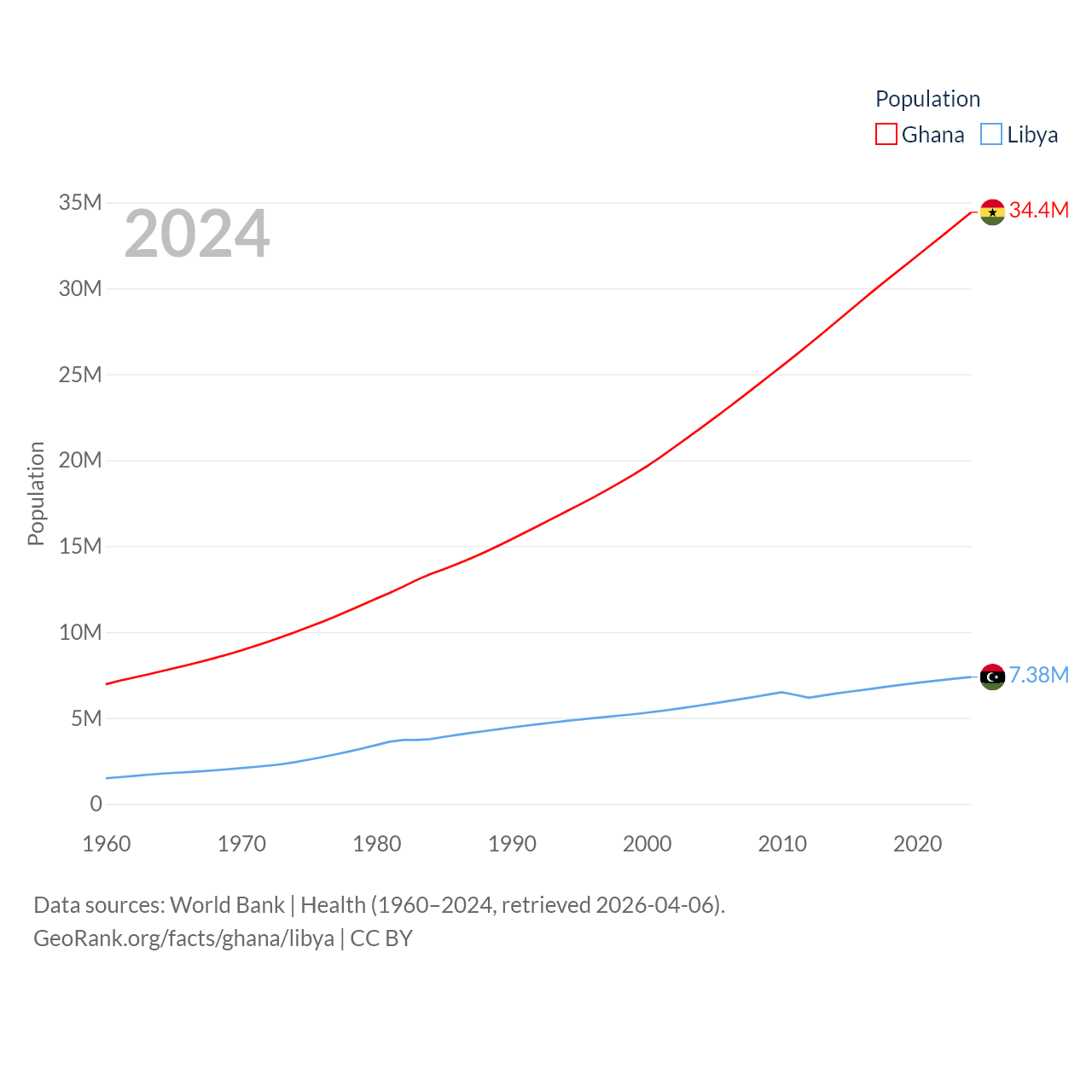 Ghana has a population of 34.4M (ranked 47/197), compared with 7.38M in Libya (ranked 105/197). Ghana's land area is 87,851 sq mi versus 679,362 sq mi for Libya (ranked 81st vs. 16th).