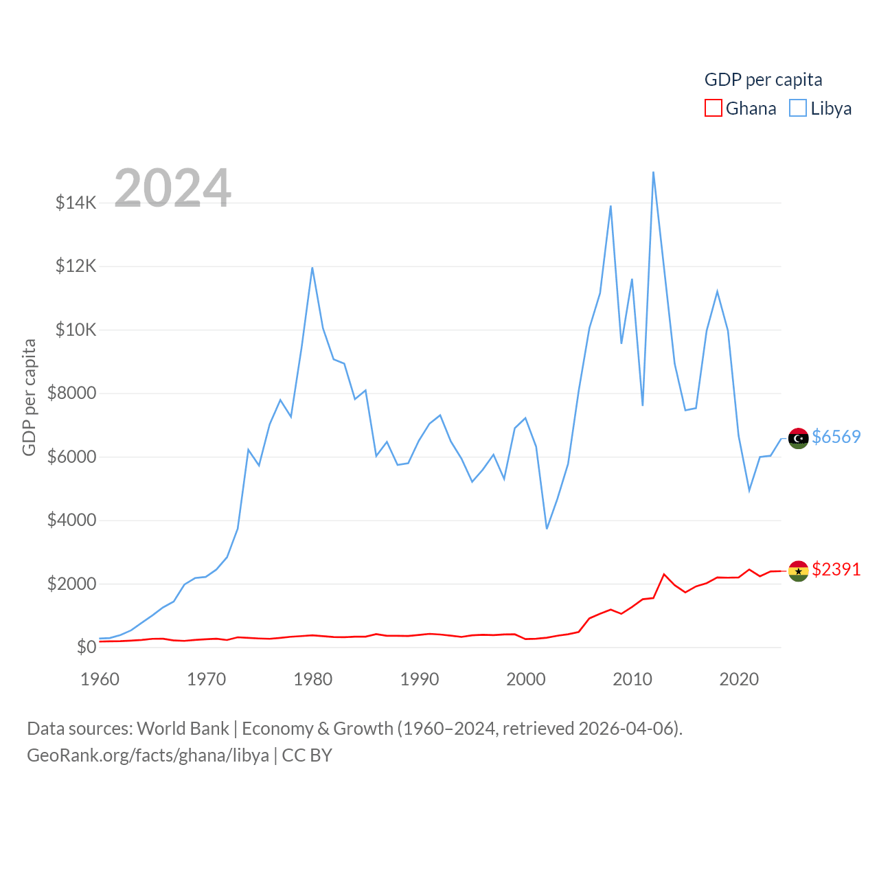 By GDP, Ghana ranks 80/197 ($82.3B) and Libya ranks 95/197 ($48.5B). By GDP per capita, Ghana ranks 151/197 ($2,391), while Libya ranks 107/197 ($6,569).