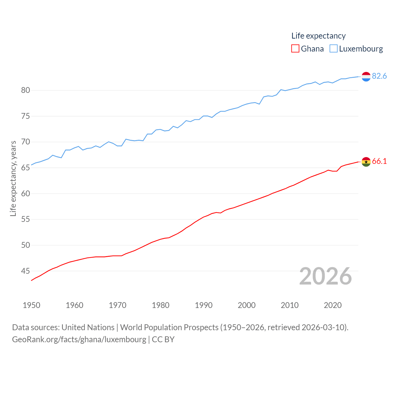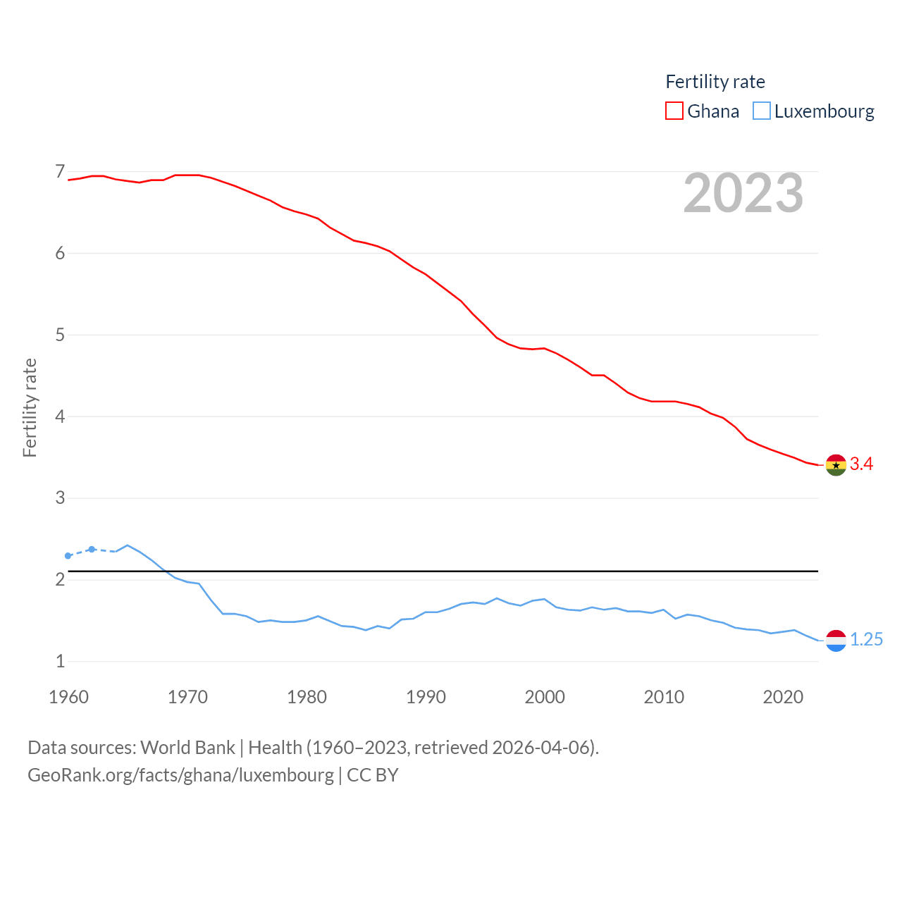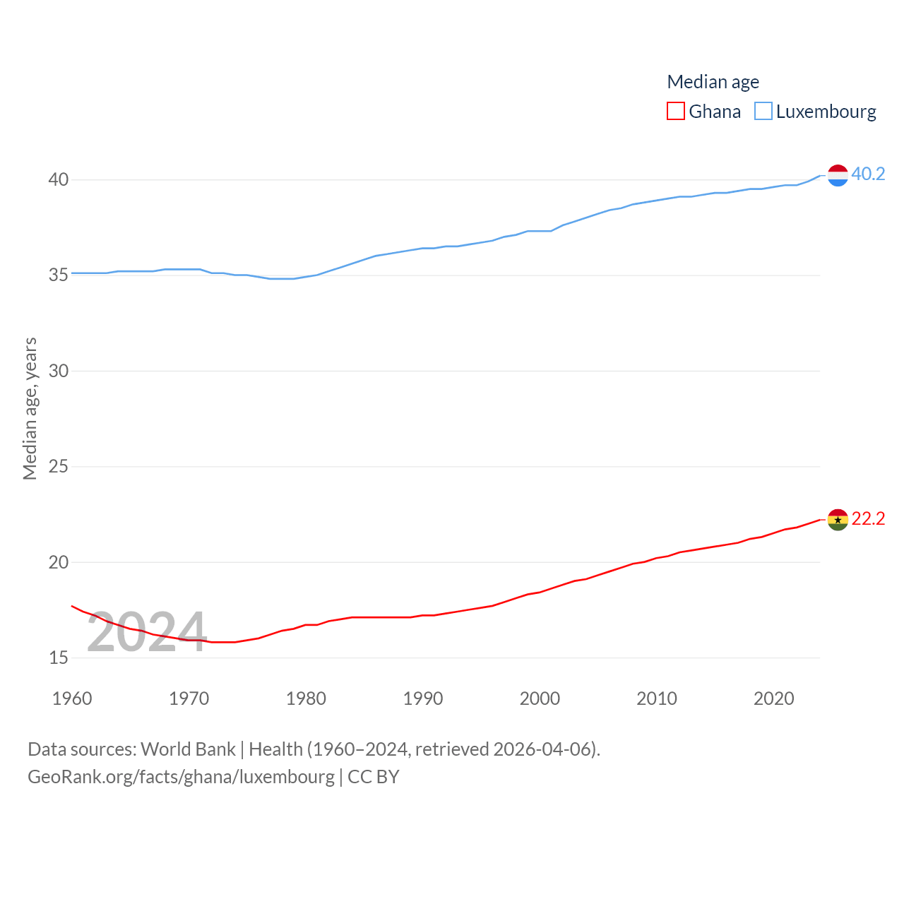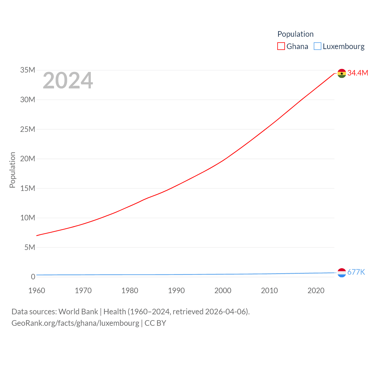 Ghana has a population of 34.4M (ranked 47/197), compared with 677K in Luxembourg (ranked 164/197). Ghana's land area is 87,851 sq mi versus 994 sq mi for Luxembourg (ranked 81st vs. 169th).