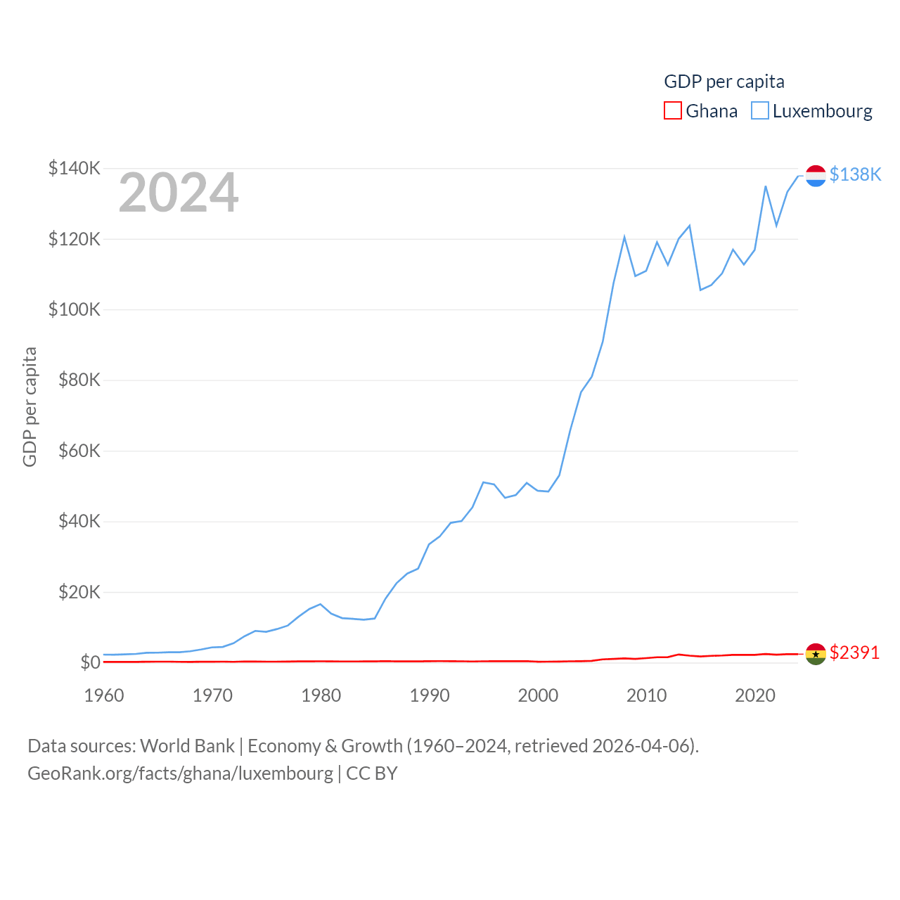 By GDP, Ghana ranks 80/197 ($82.3B) and Luxembourg ranks 74/197 ($93.3B). By GDP per capita, Ghana ranks 151/197 ($2,391), while Luxembourg ranks 3/197 ($137,782).