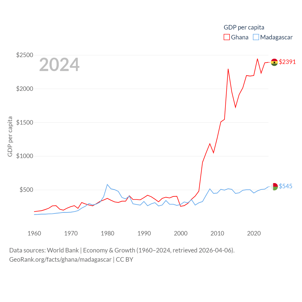 By GDP, Ghana ranks 80/197 ($82.3B) and Madagascar ranks 136/197 ($17.4B). By GDP per capita, Ghana ranks 151/197 ($2,391), while Madagascar ranks 193/197 ($545).