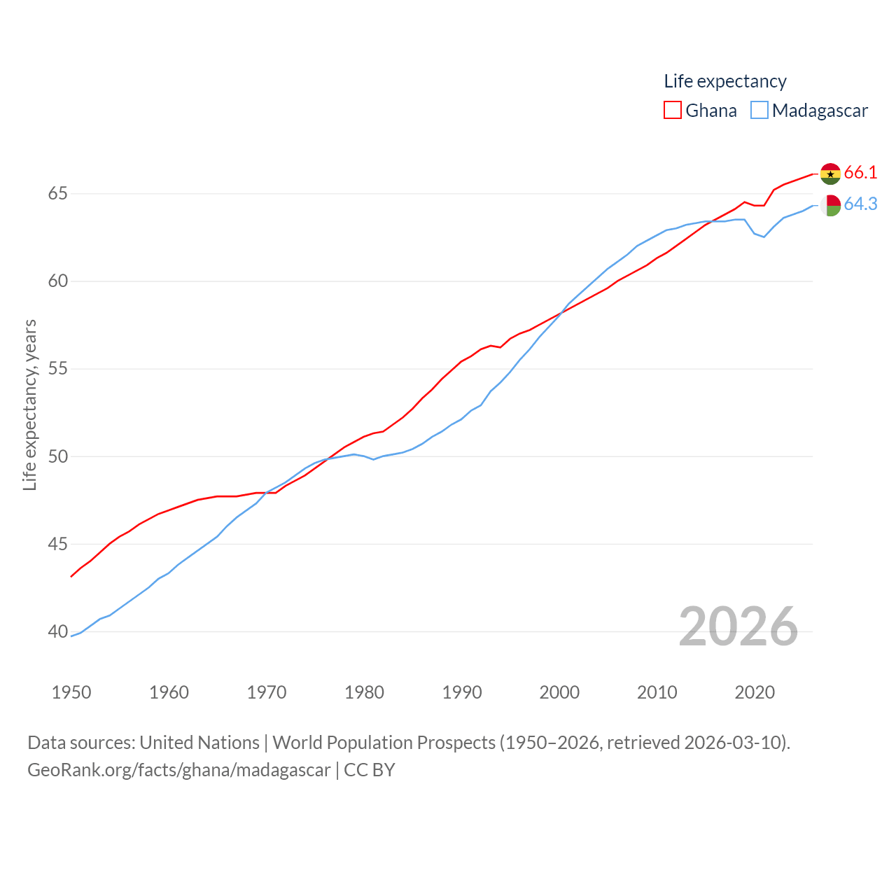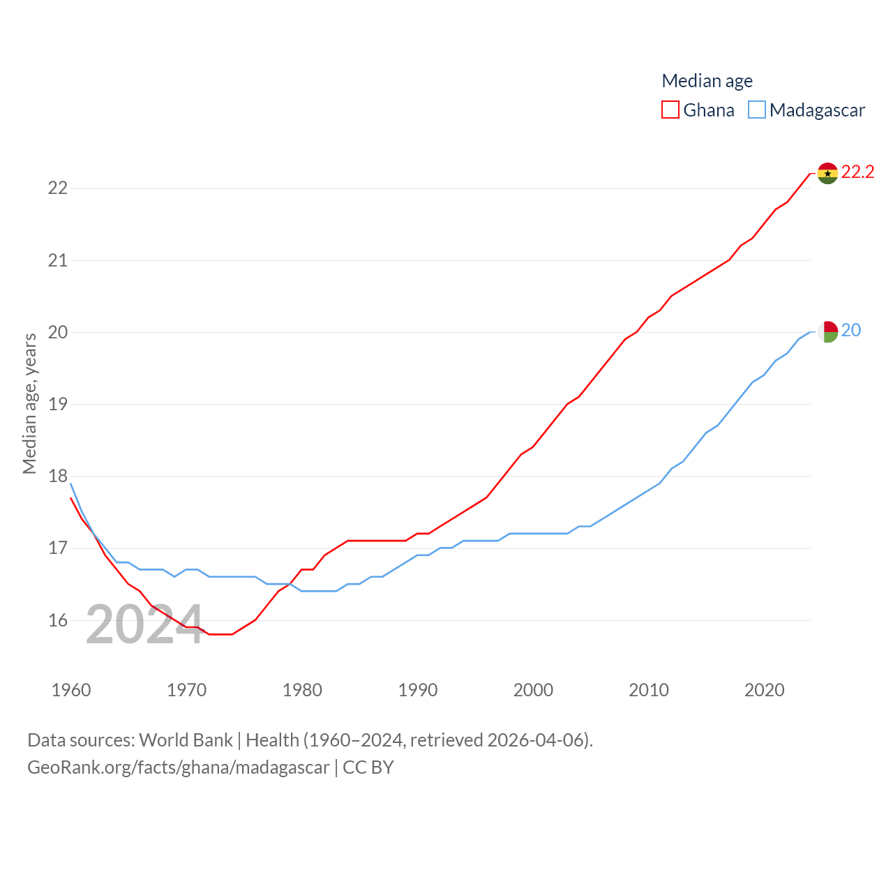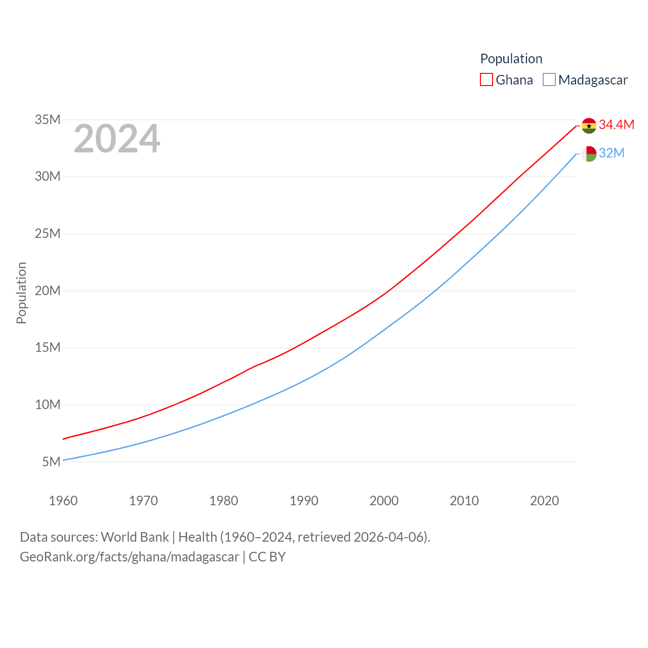 Ghana has a population of 34.4M (ranked 47/197), compared with 32M in Madagascar (ranked 49/197). Ghana's land area is 87,851 sq mi versus 224,634 sq mi for Madagascar (ranked 81st vs. 44th).