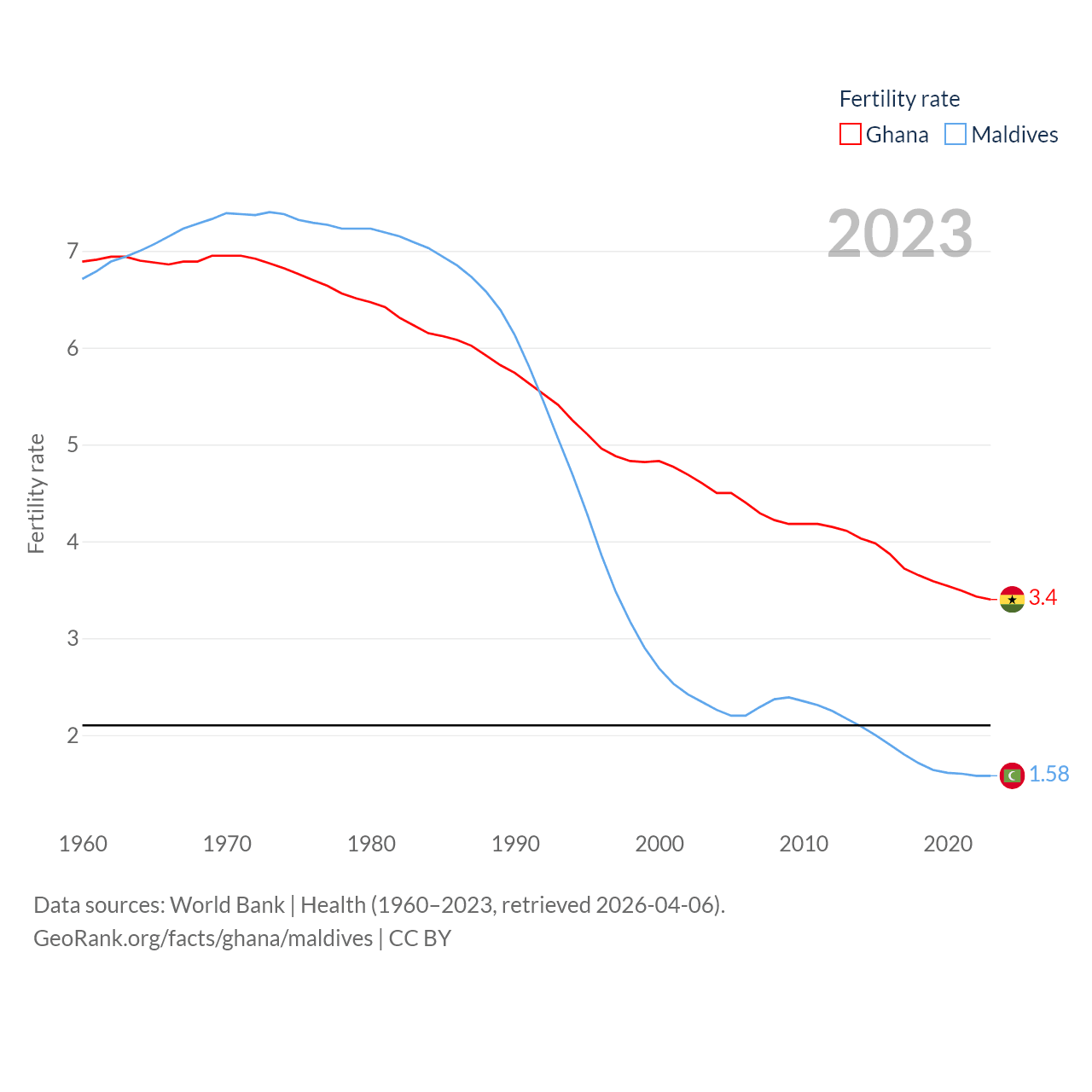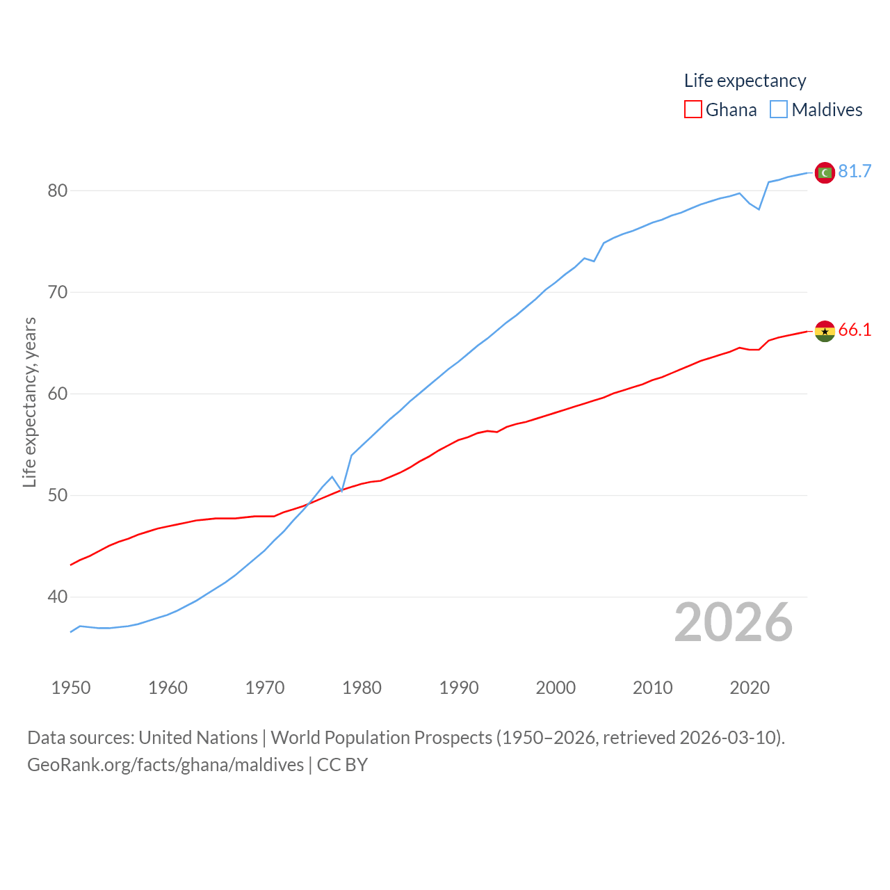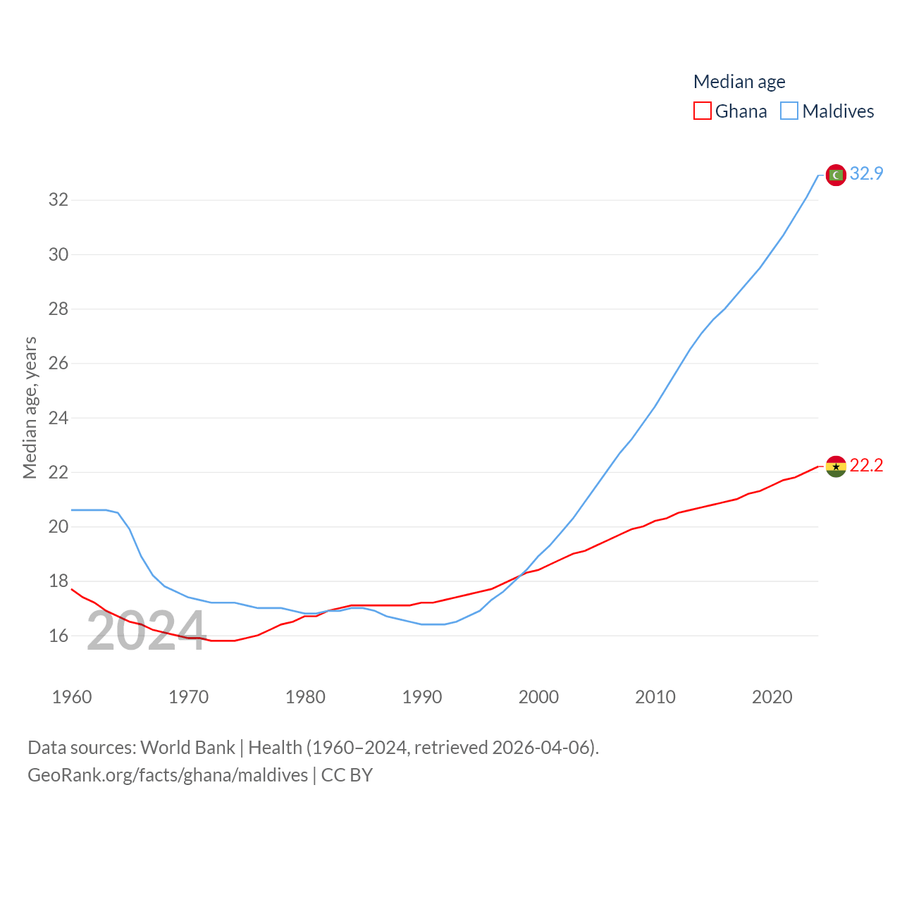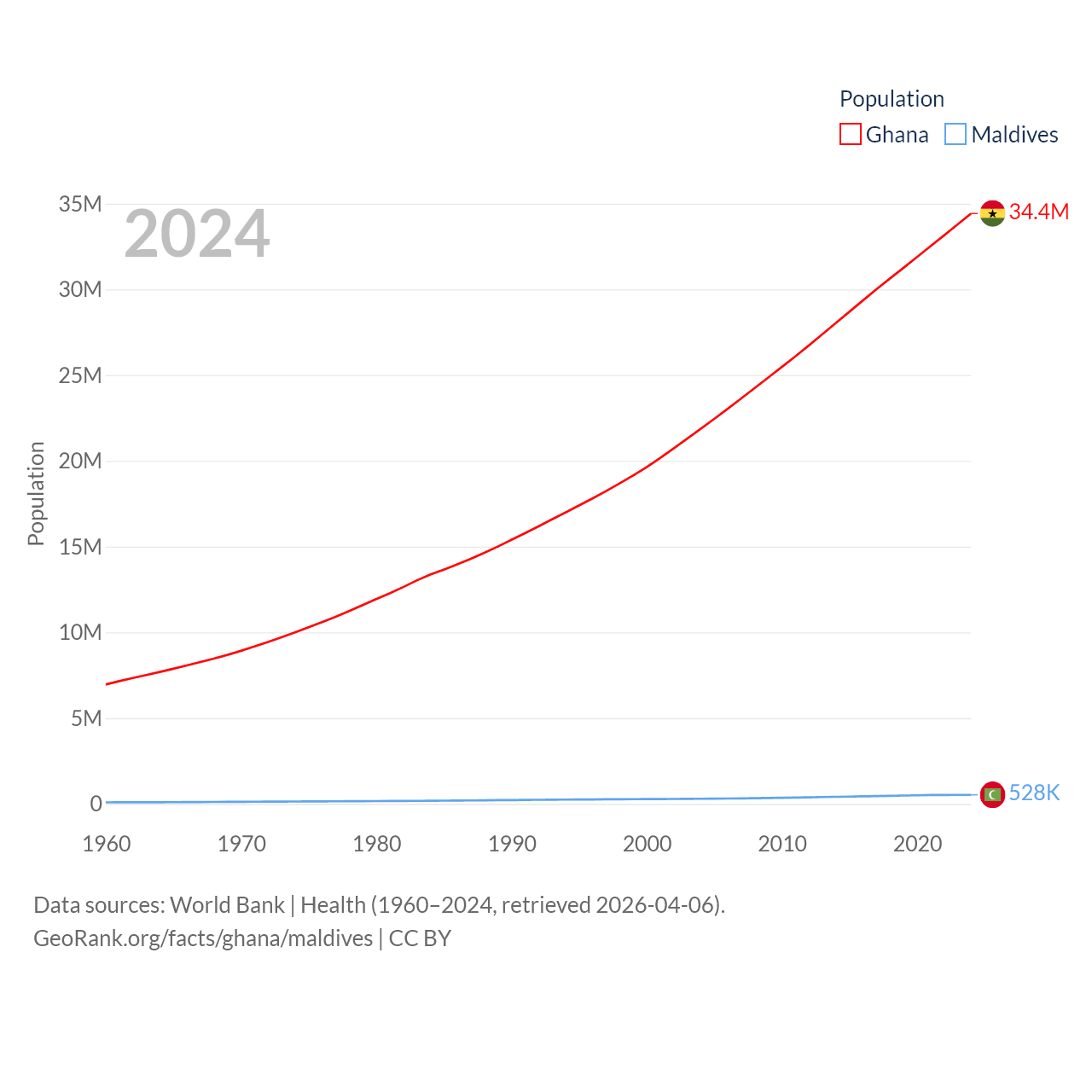 Ghana has a population of 34.4M (ranked 47/197), compared with 528K in Maldives (ranked 168/197). Ghana's land area is 87,851 sq mi versus 115.1 sq mi for Maldives (ranked 81st vs. 188th).