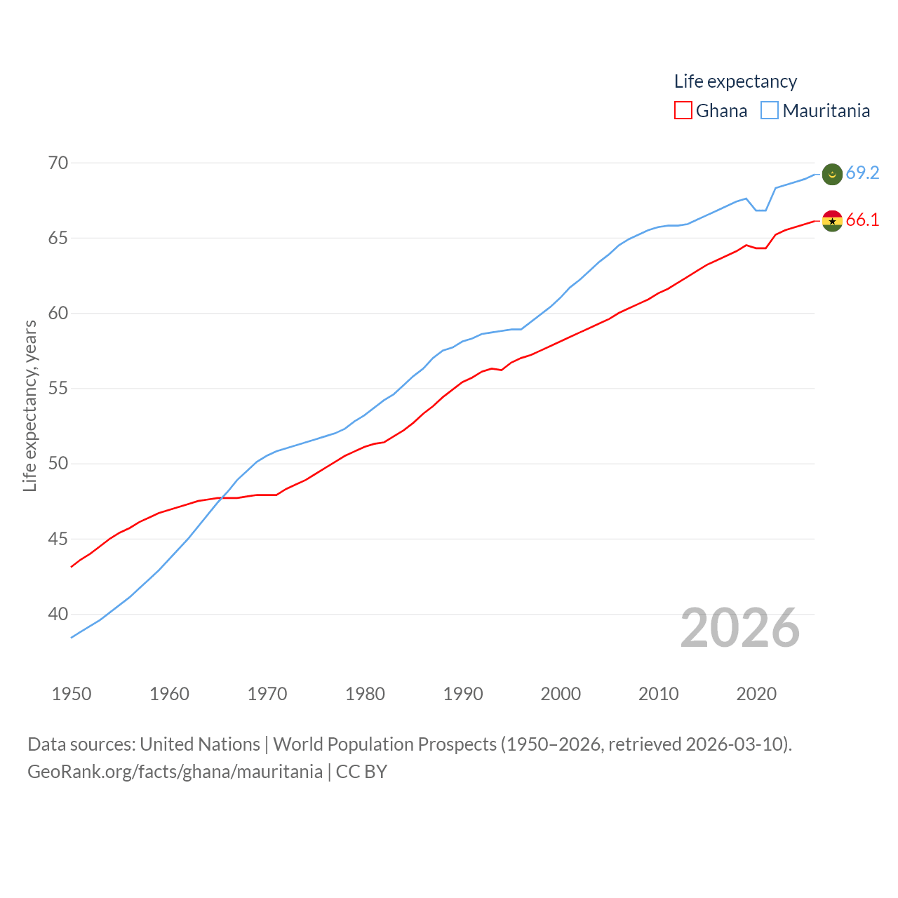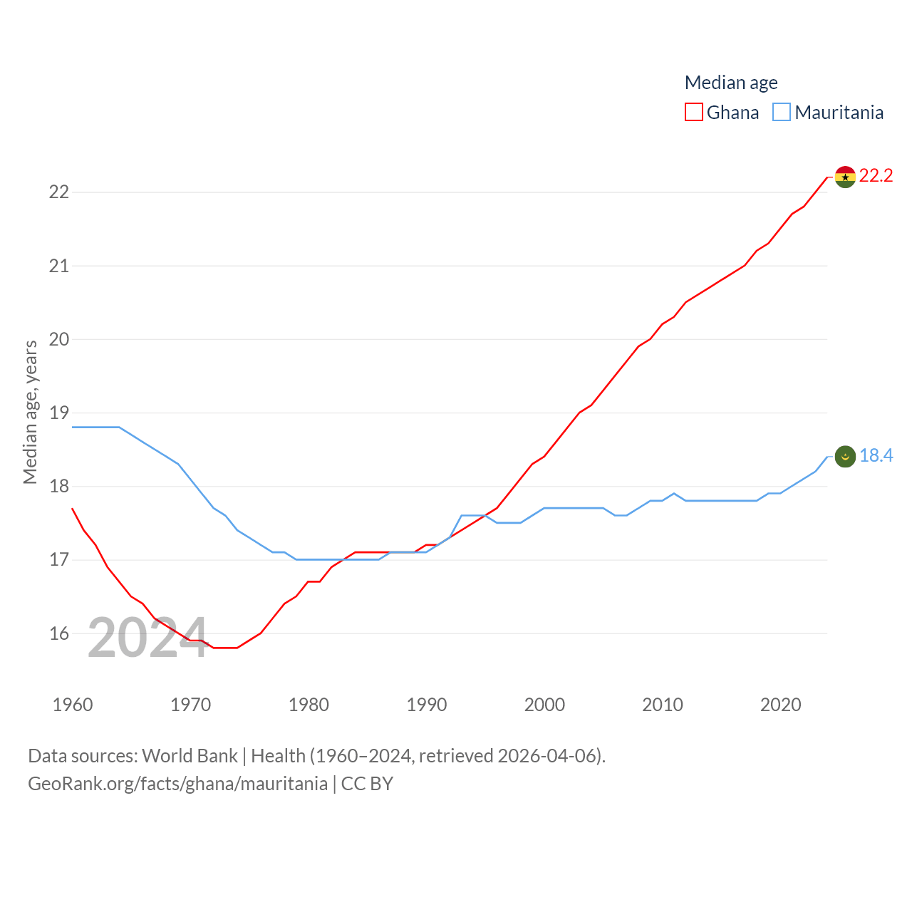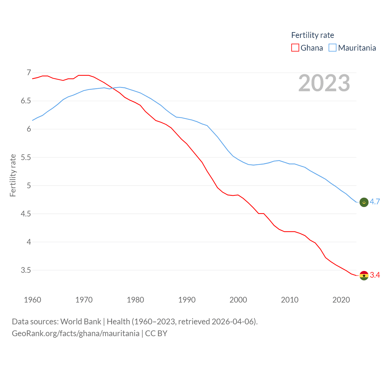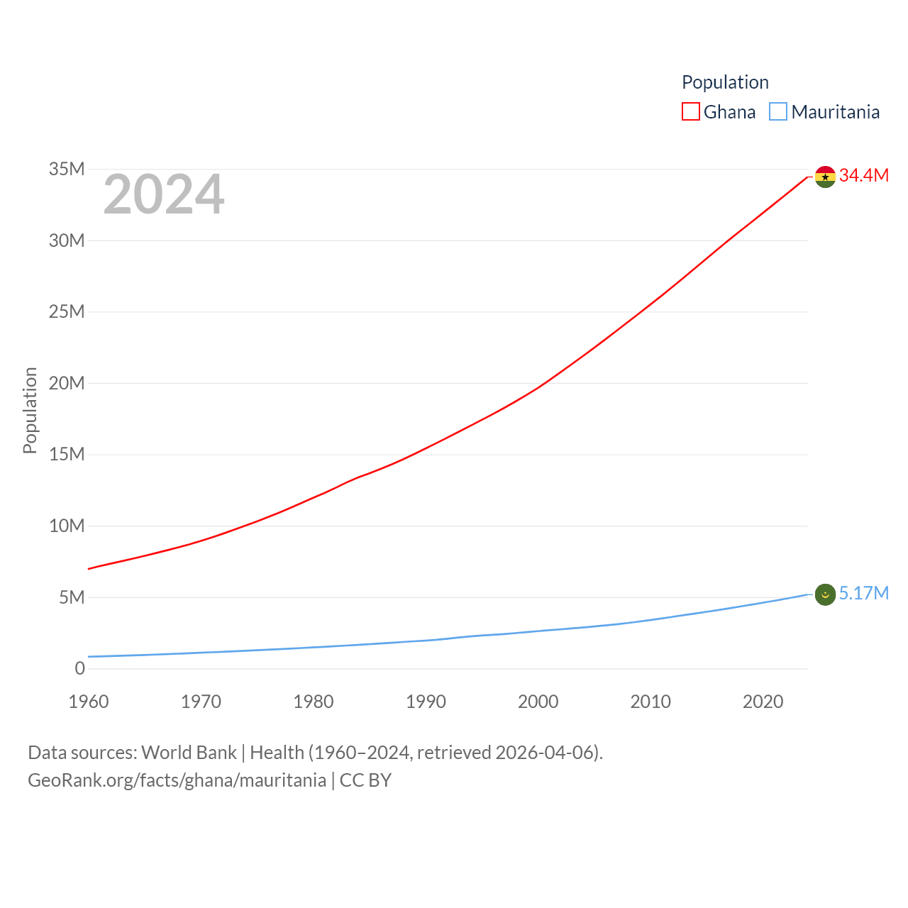 Ghana has a population of 34.4M (ranked 47/197), compared with 5.17M in Mauritania (ranked 125/197). Ghana's land area is 87,851 sq mi versus 397,955 sq mi for Mauritania (ranked 81st vs. 28th).