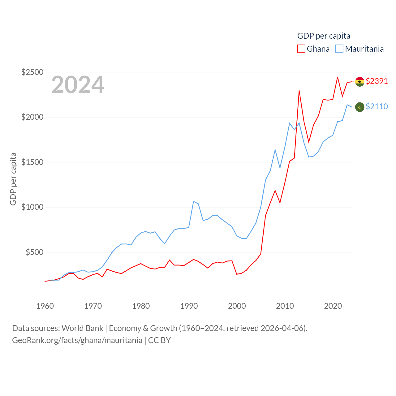 By GDP, Ghana ranks 80/197 ($82.3B) and Mauritania ranks 153/197 ($10.9B). By GDP per capita, Ghana ranks 151/197 ($2,391), while Mauritania ranks 156/197 ($2,110).