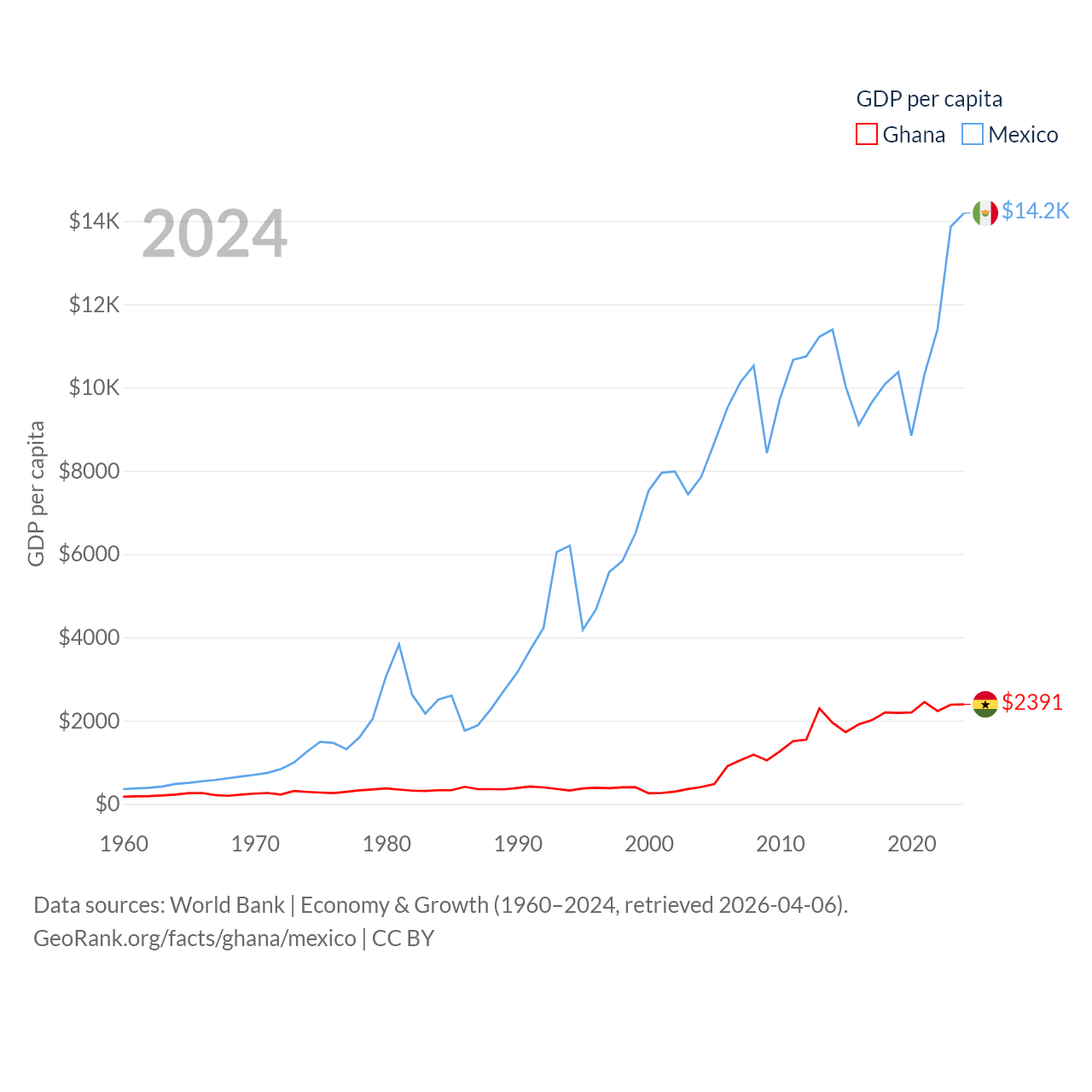By GDP, Ghana ranks 80/197 ($82.3B) and Mexico ranks 13/197 ($1.86T). By GDP per capita, Ghana ranks 151/197 ($2,391), while Mexico ranks 69/197 ($14,186).