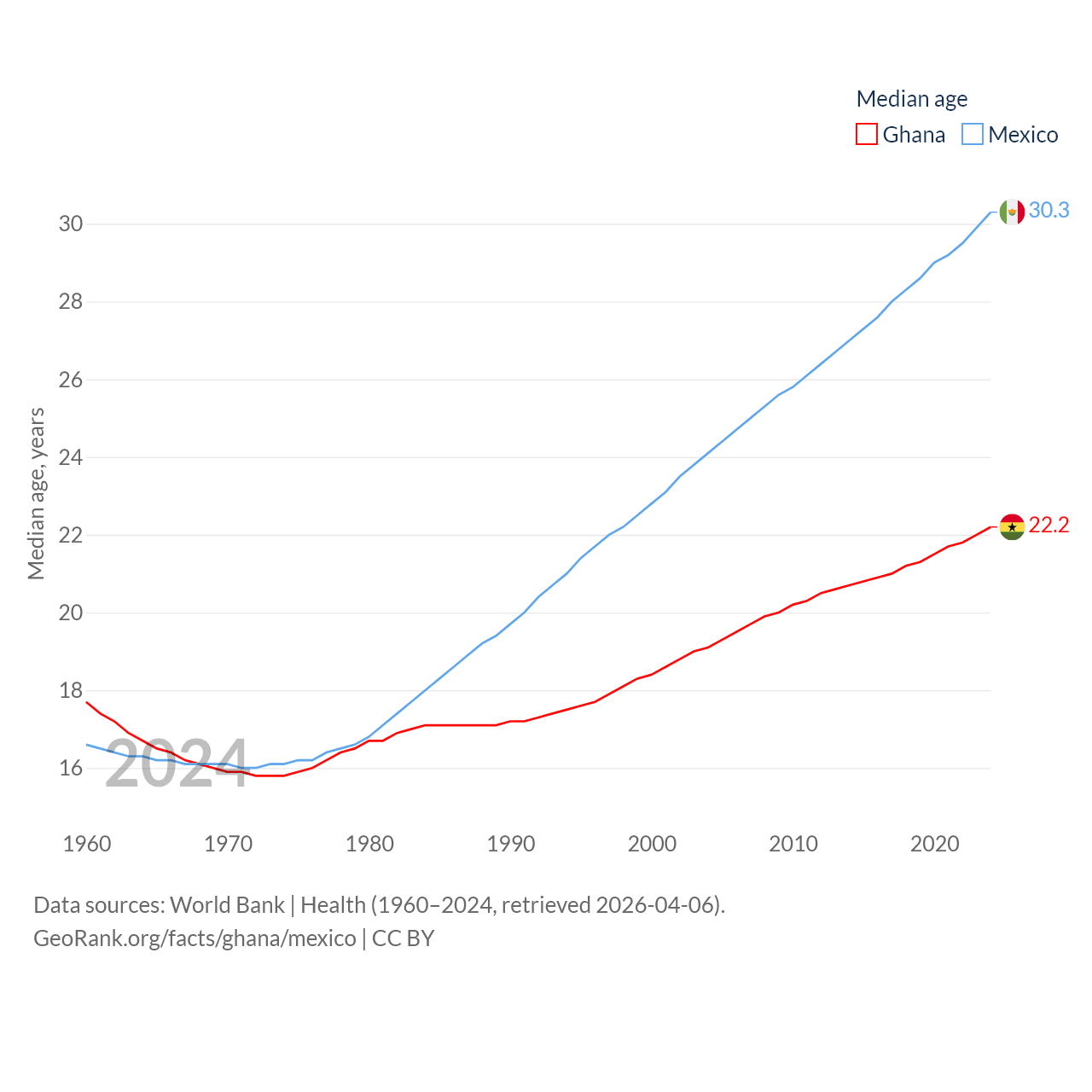 Ghana has a population of 34.4M (ranked 47/197), compared with 131M in Mexico (ranked 11/197). Ghana's land area is 87,851 sq mi versus 750,563 sq mi for Mexico (ranked 81st vs. 13th).