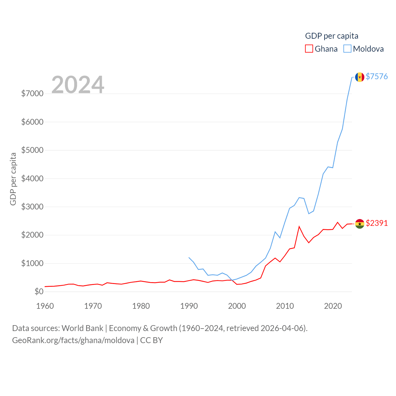 By GDP, Ghana ranks 80/197 ($82.3B) and Moldova ranks 134/197 ($18.2B). By GDP per capita, Ghana ranks 151/197 ($2,391), while Moldova ranks 99/197 ($7,576).