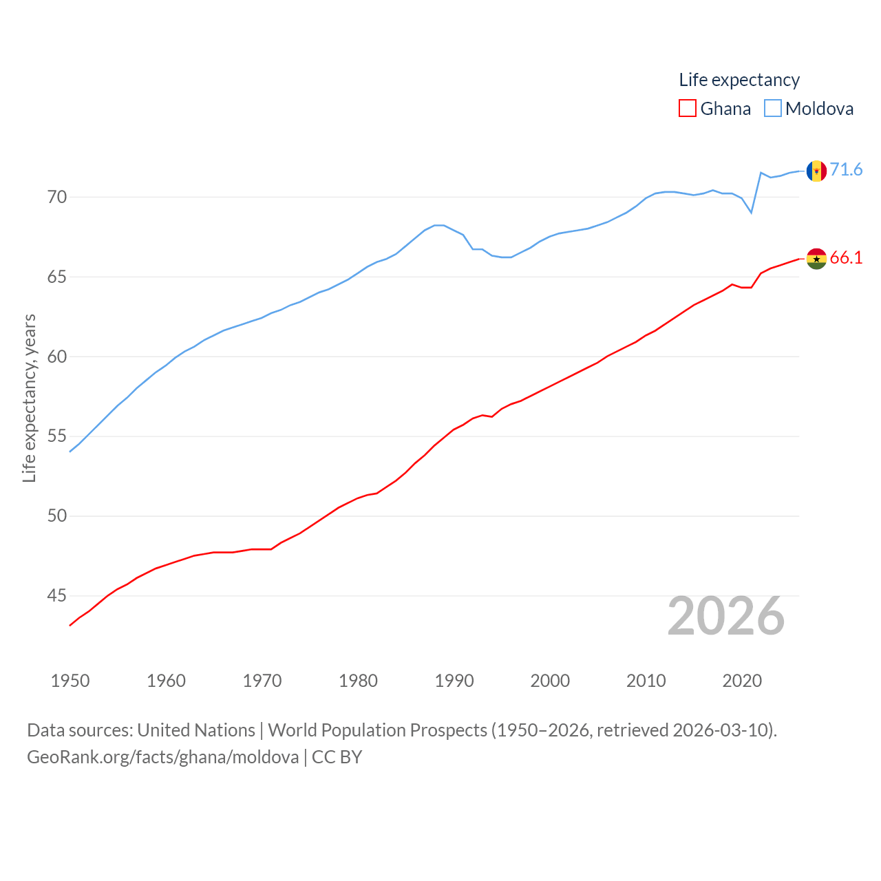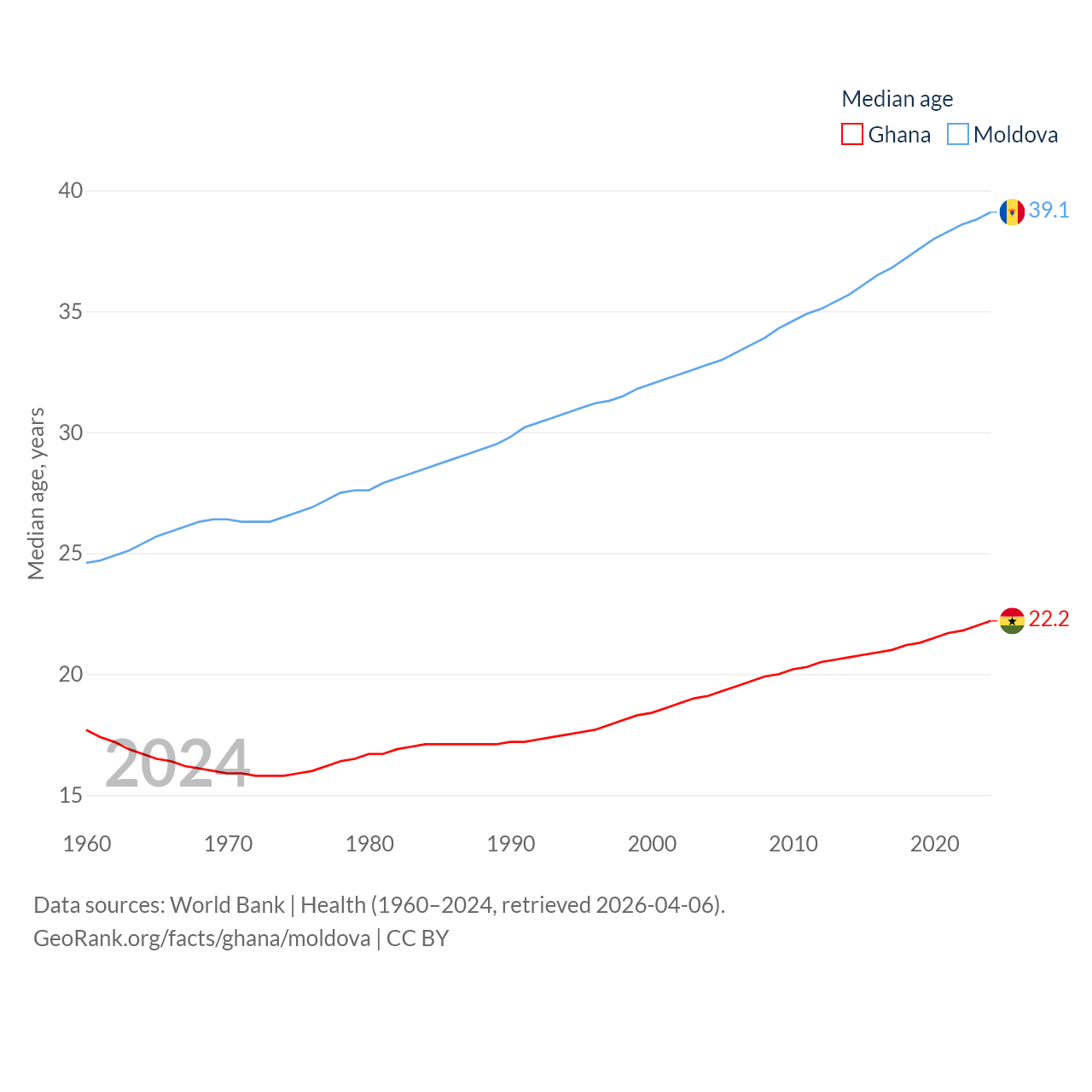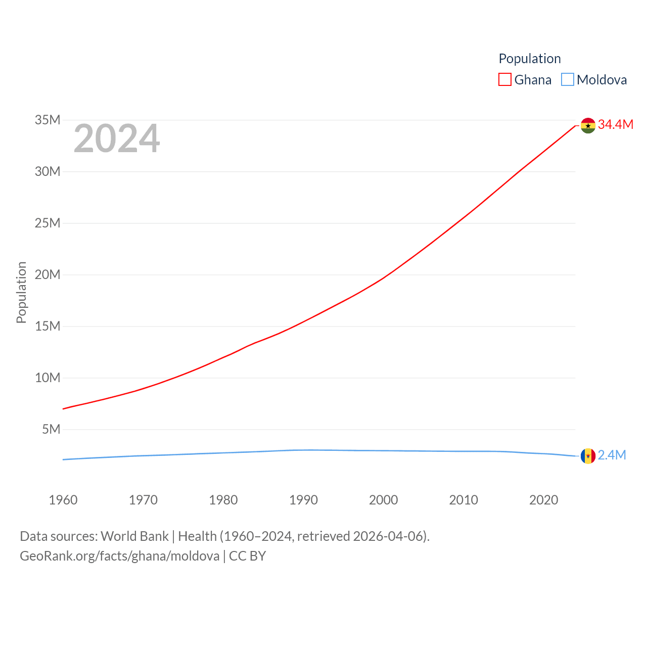 Ghana has a population of 34.4M (ranked 47/197), compared with 2.4M in Moldova (ranked 143/197). Ghana's land area is 87,851 sq mi versus 12,714 sq mi for Moldova (ranked 81st vs. 135th).