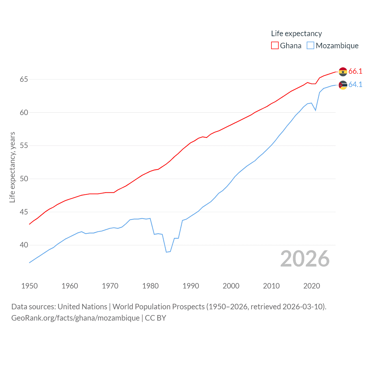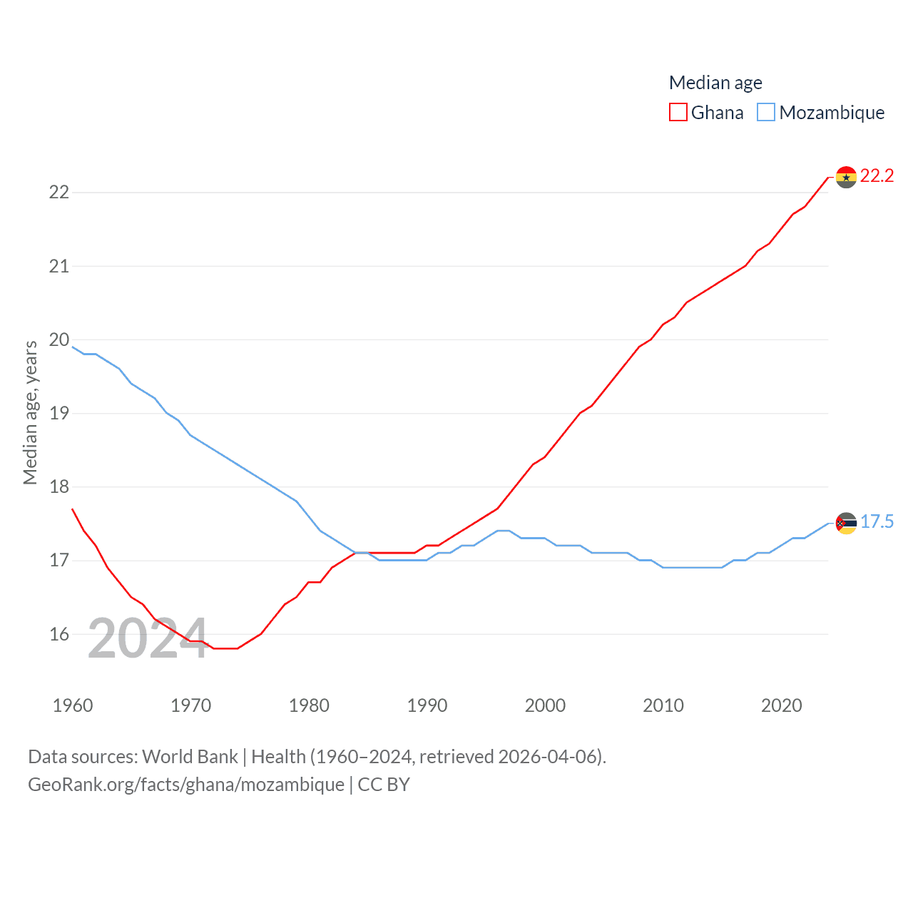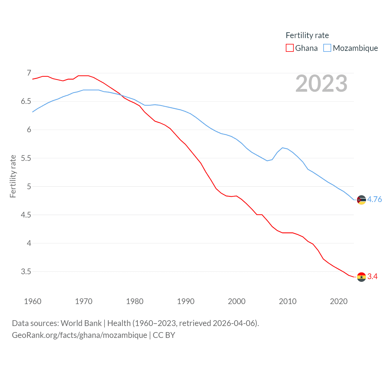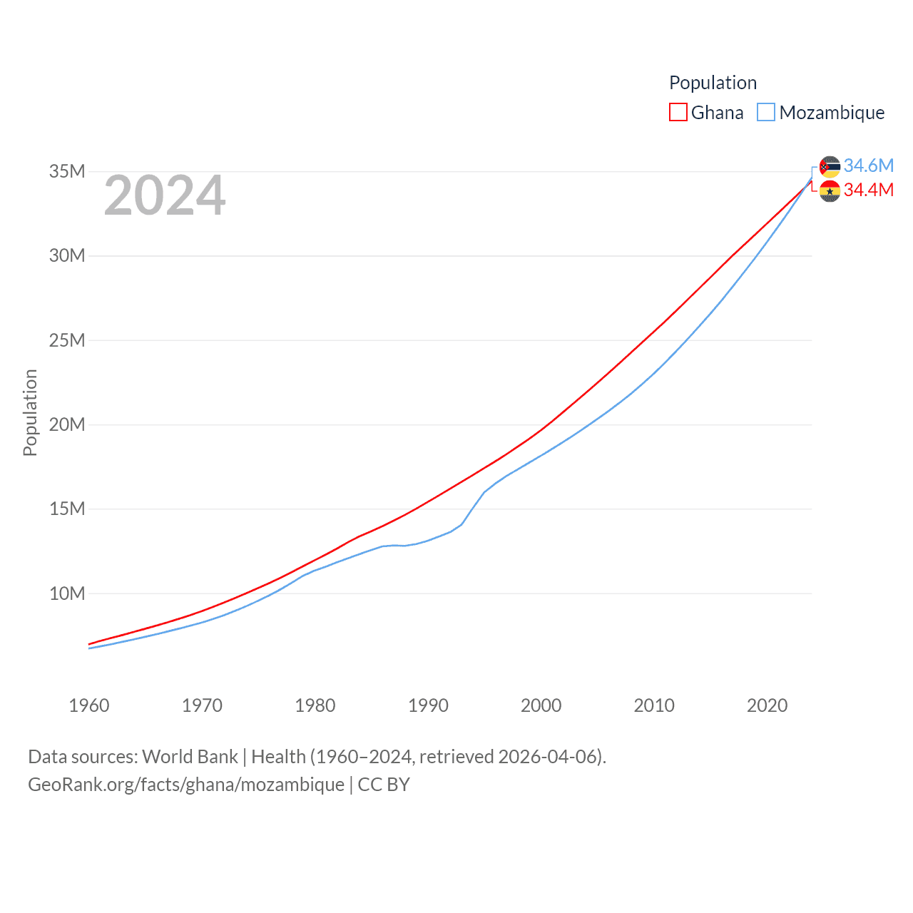 Ghana has a population of 34.4M (ranked 47/197), compared with 34.6M in Mozambique (ranked 46/197). Ghana's land area is 87,851 sq mi versus 303,623 sq mi for Mozambique (ranked 81st vs. 34th).