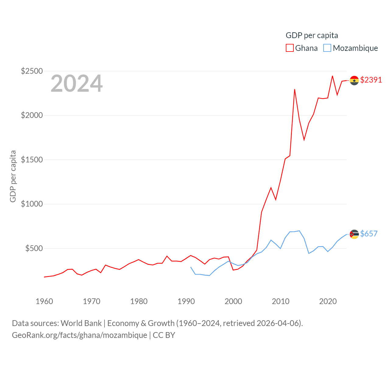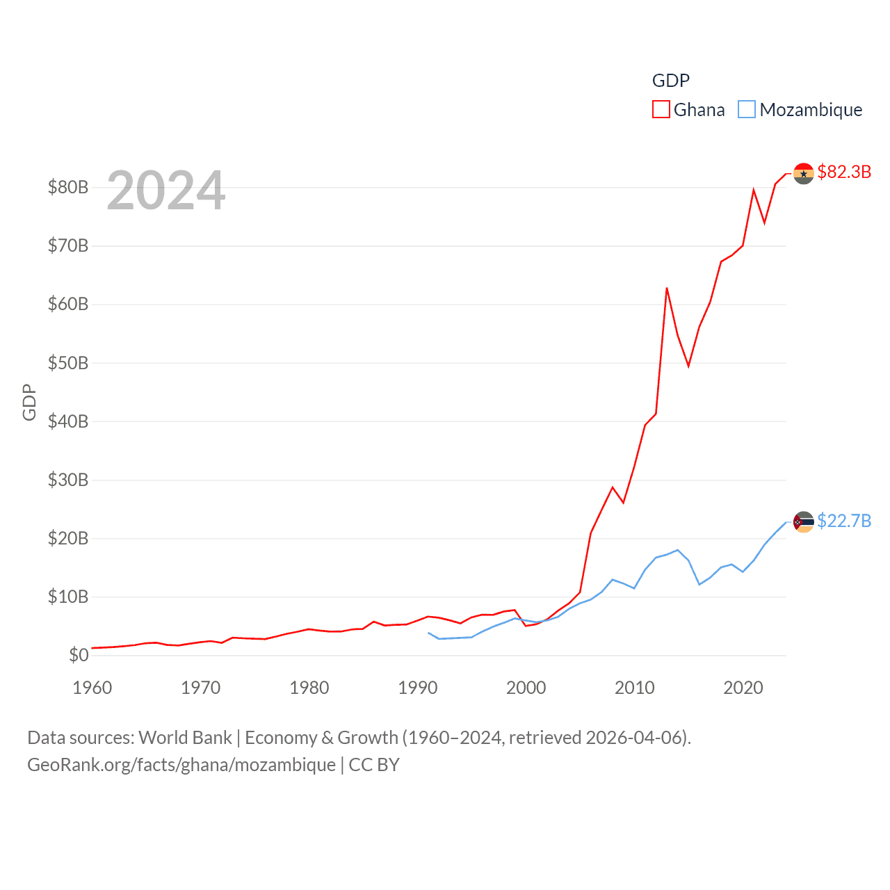 By GDP, Ghana ranks 80/197 ($82.3B) and Mozambique ranks 123/197 ($22.7B). By GDP per capita, Ghana ranks 151/197 ($2,391), while Mozambique ranks 189/197 ($657).