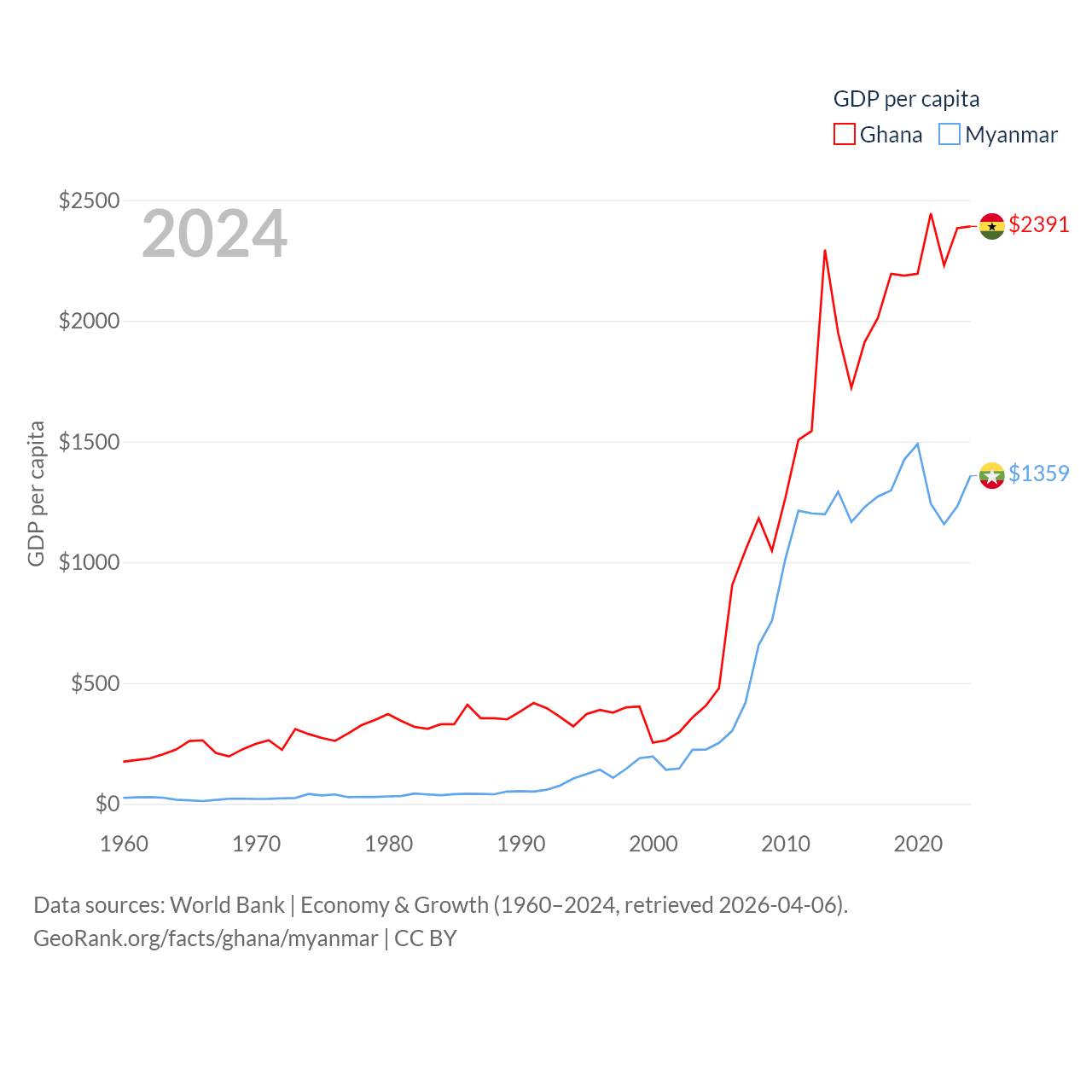 By GDP, Ghana ranks 80/197 ($82.3B) and Myanmar ranks 85/197 ($74.1B). By GDP per capita, Ghana ranks 151/197 ($2,391), while Myanmar ranks 165/197 ($1,359).