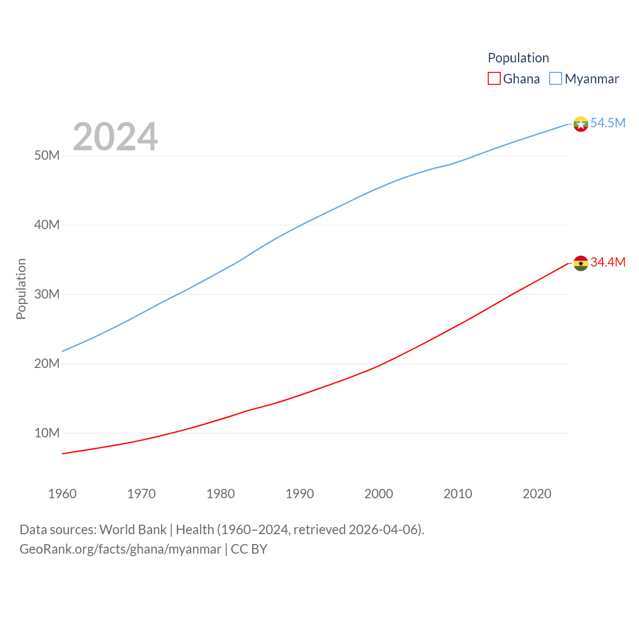 Ghana has a population of 34.4M (ranked 47/197), compared with 54.5M in Myanmar (ranked 27/197). Ghana's land area is 87,851 sq mi versus 251,997 sq mi for Myanmar (ranked 81st vs. 39th).
