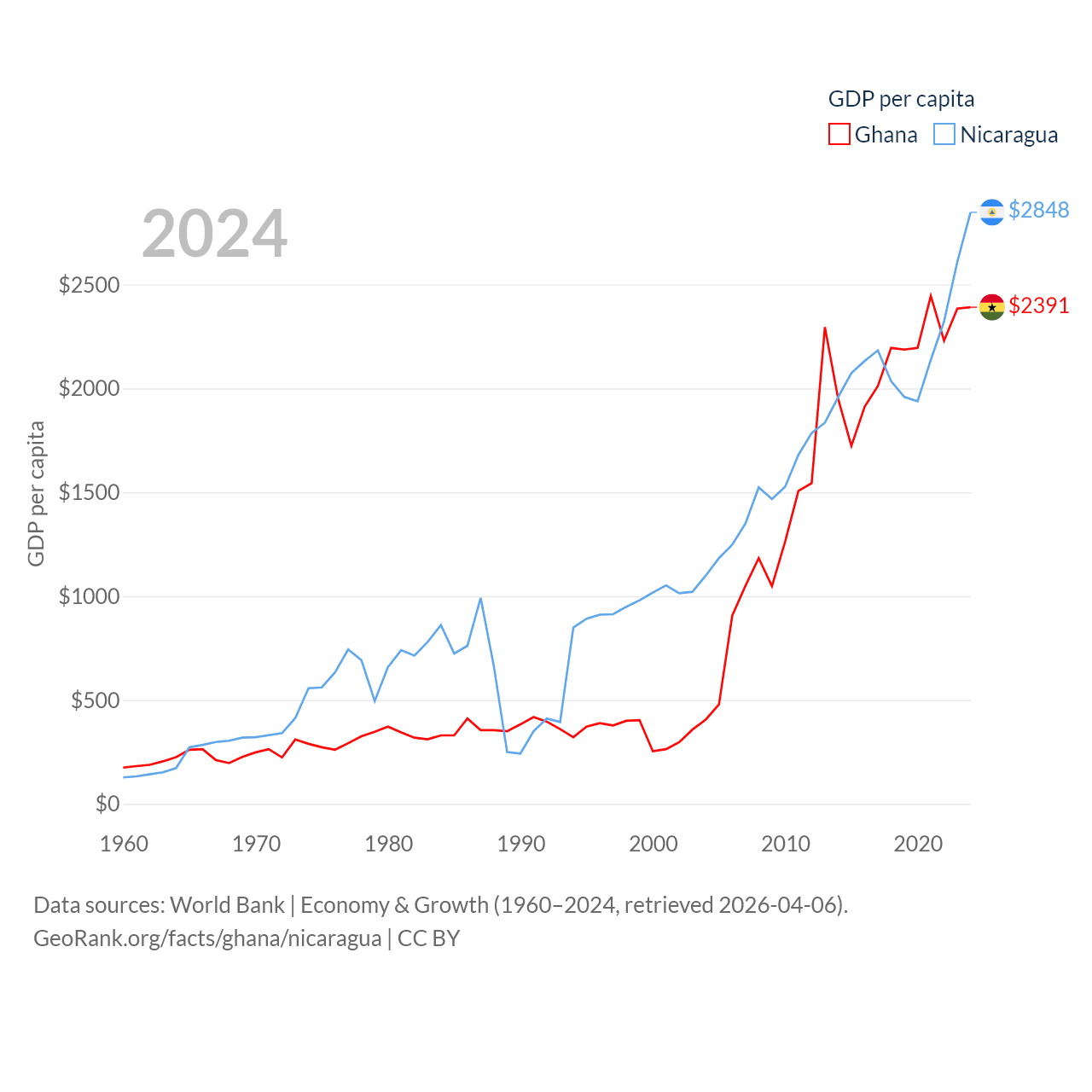 By GDP, Ghana ranks 80/197 ($82.3B) and Nicaragua ranks 131/197 ($19.7B). By GDP per capita, Ghana ranks 151/197 ($2,391), while Nicaragua ranks 141/197 ($2,848).