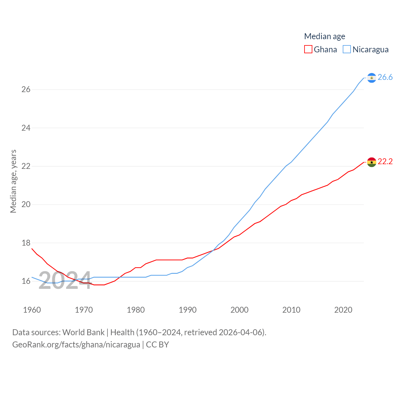 Ghana has a population of 34.4M (ranked 47/197), compared with 6.92M in Nicaragua (ranked 108/197). Ghana's land area is 87,851 sq mi versus 46,464 sq mi for Nicaragua (ranked 81st vs. 98th).