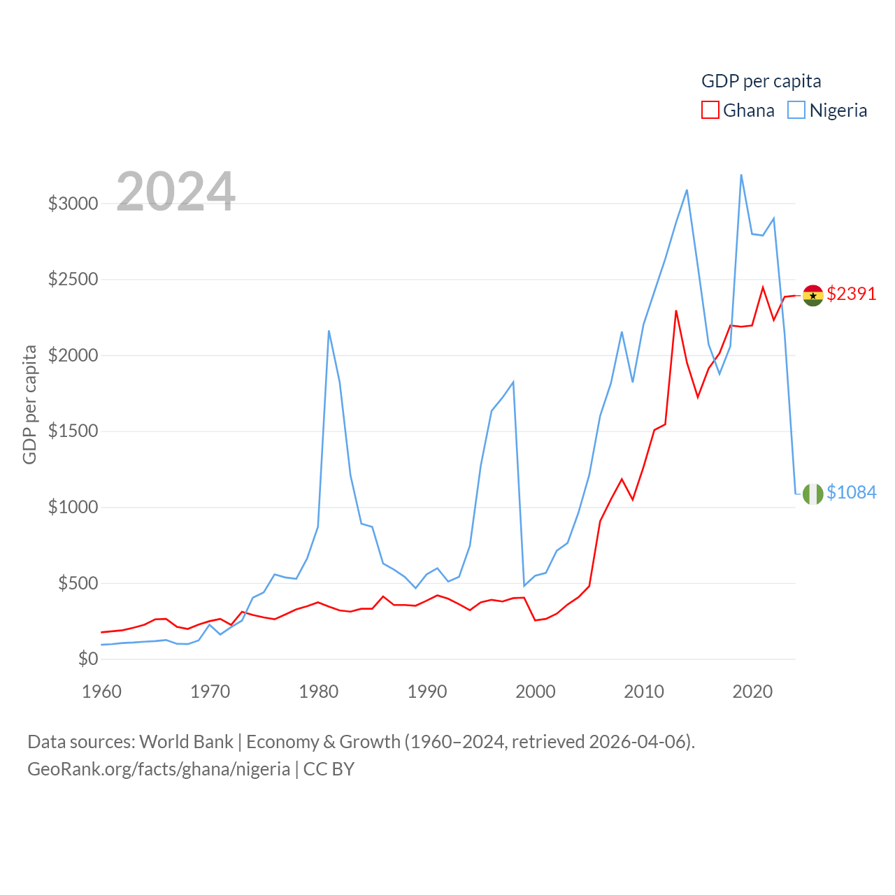 By GDP, Ghana ranks 80/197 ($82.3B) and Nigeria ranks 54/197 ($252B). By GDP per capita, Ghana ranks 151/197 ($2,391), while Nigeria ranks 174/197 ($1,084).