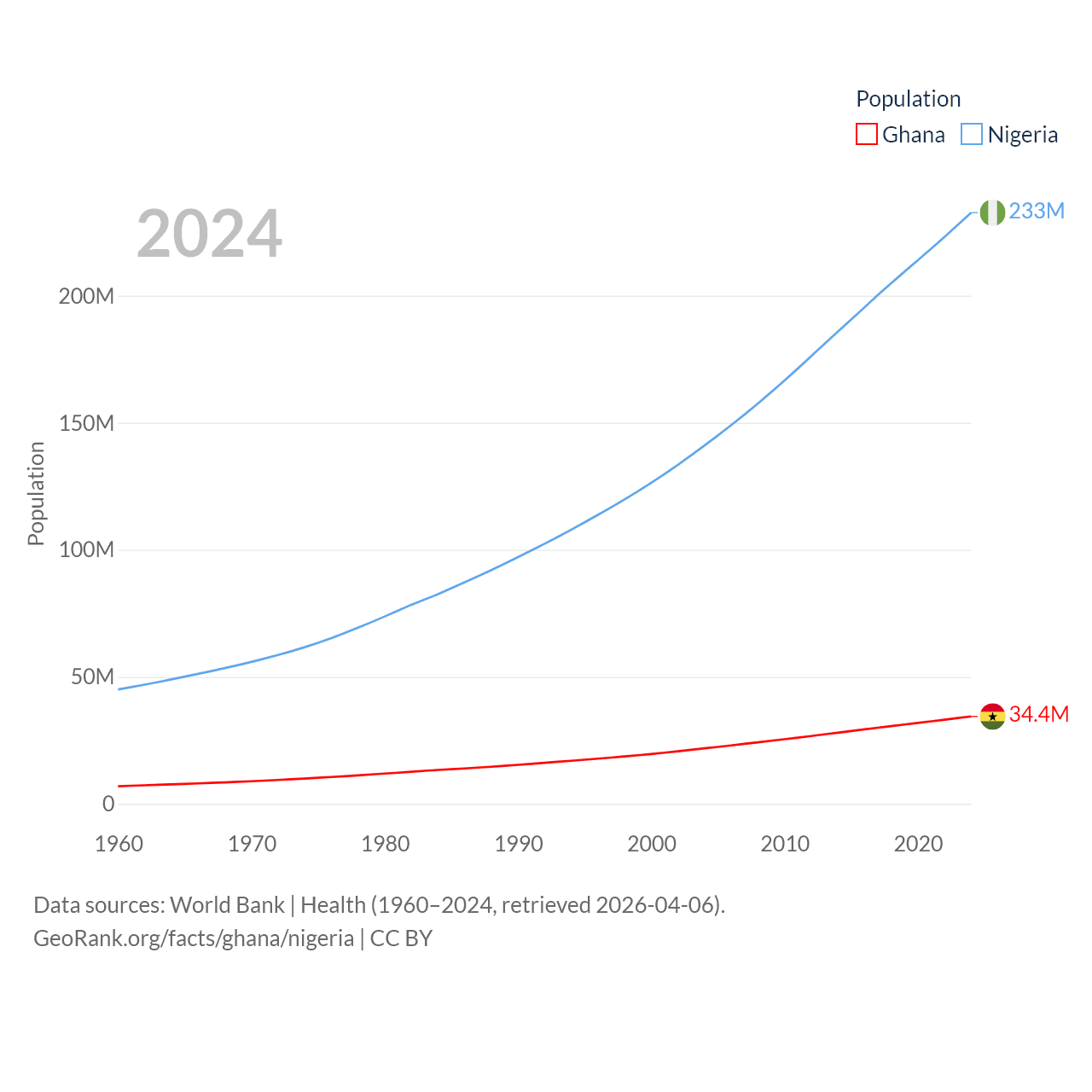 Ghana has a population of 34.4M (ranked 47/197), compared with 233M in Nigeria (ranked 6/197). Ghana's land area is 87,851 sq mi versus 351,650 sq mi for Nigeria (ranked 81st vs. 30th).