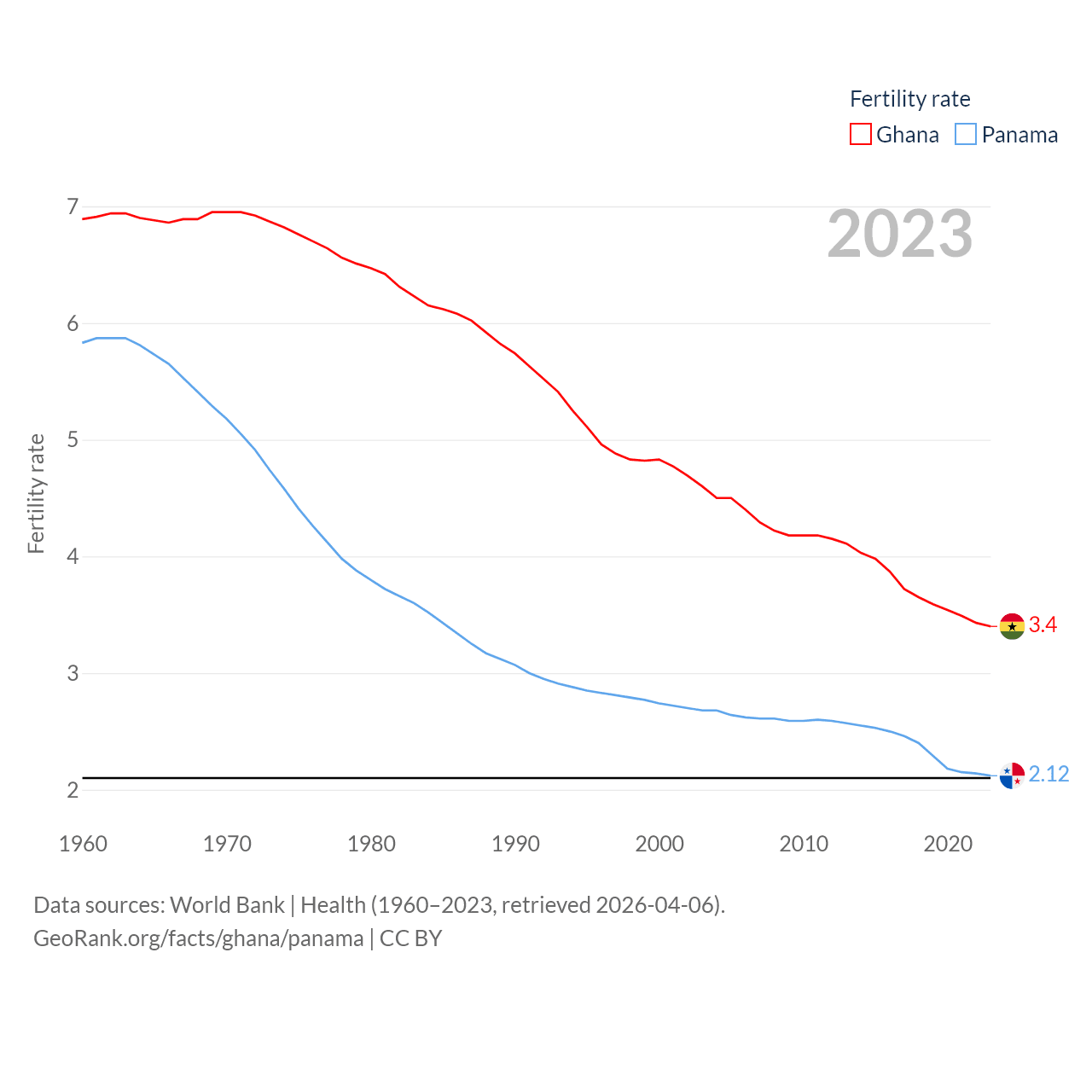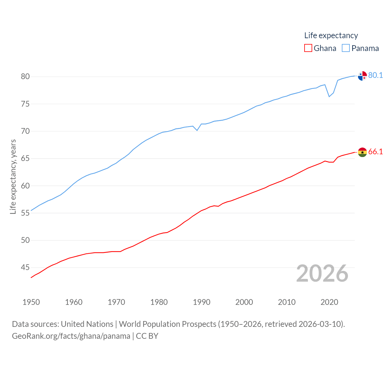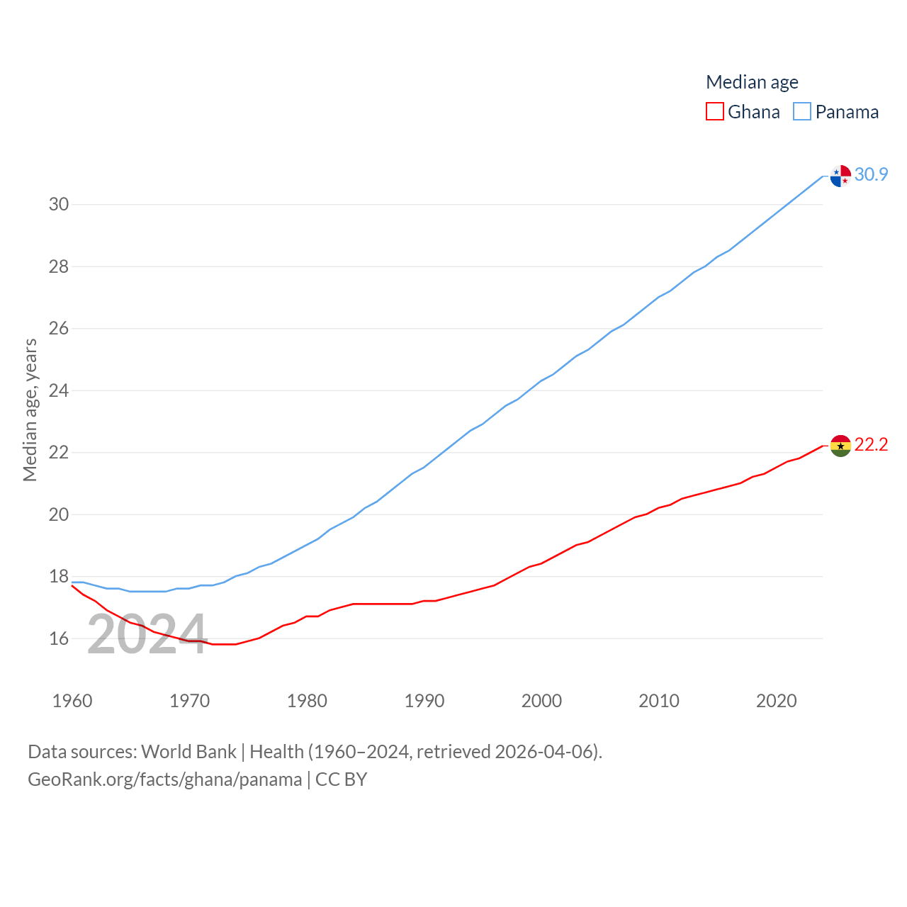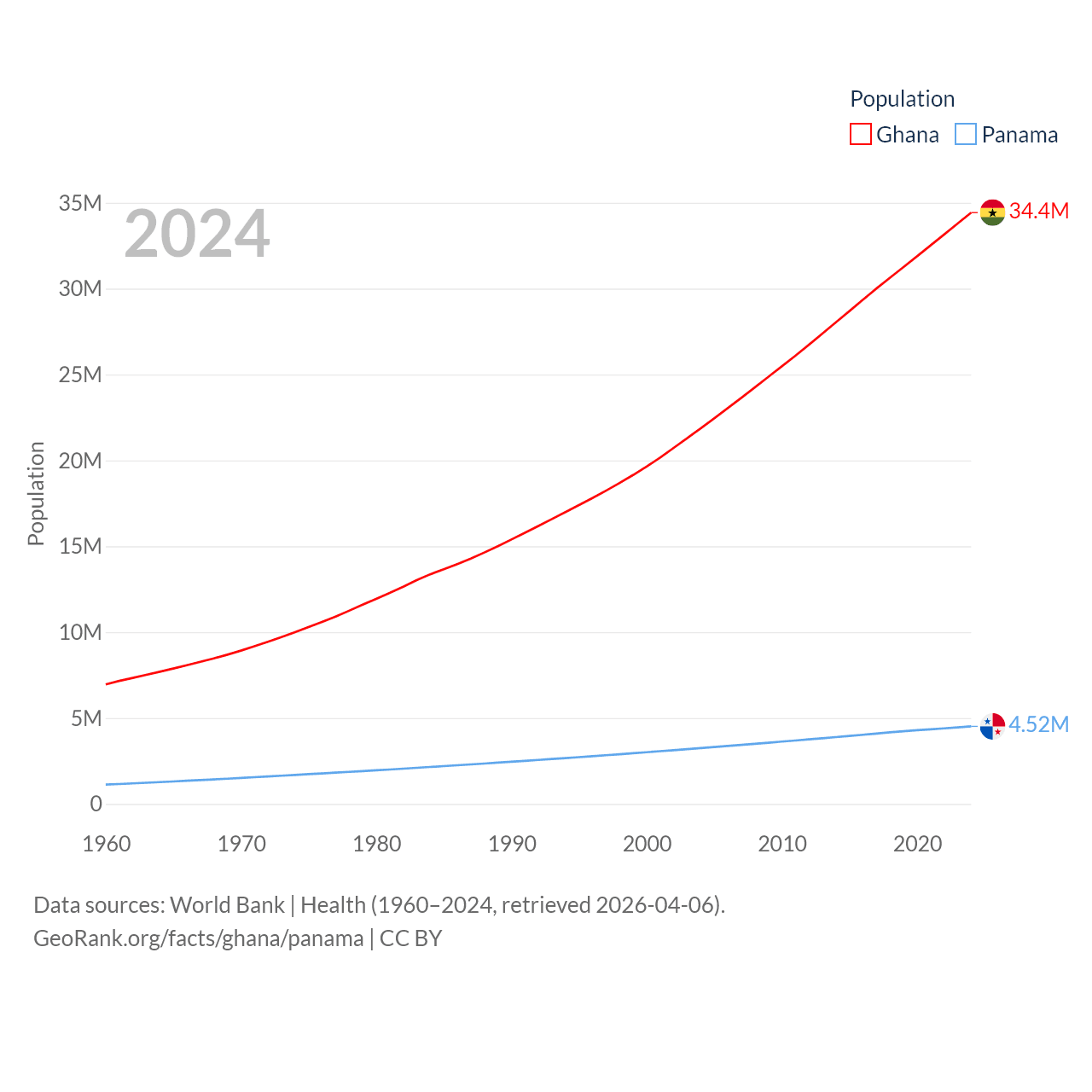 Ghana has a population of 34.4M (ranked 47/197), compared with 4.52M in Panama (ranked 128/197). Ghana's land area is 87,851 sq mi versus 28,641 sq mi for Panama (ranked 81st vs. 115th).
