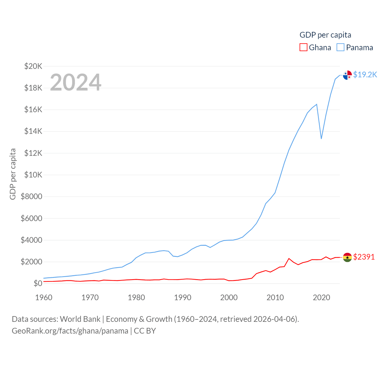 By GDP, Ghana ranks 80/197 ($82.3B) and Panama ranks 78/197 ($86.5B). By GDP per capita, Ghana ranks 151/197 ($2,391), while Panama ranks 60/197 ($19,161).