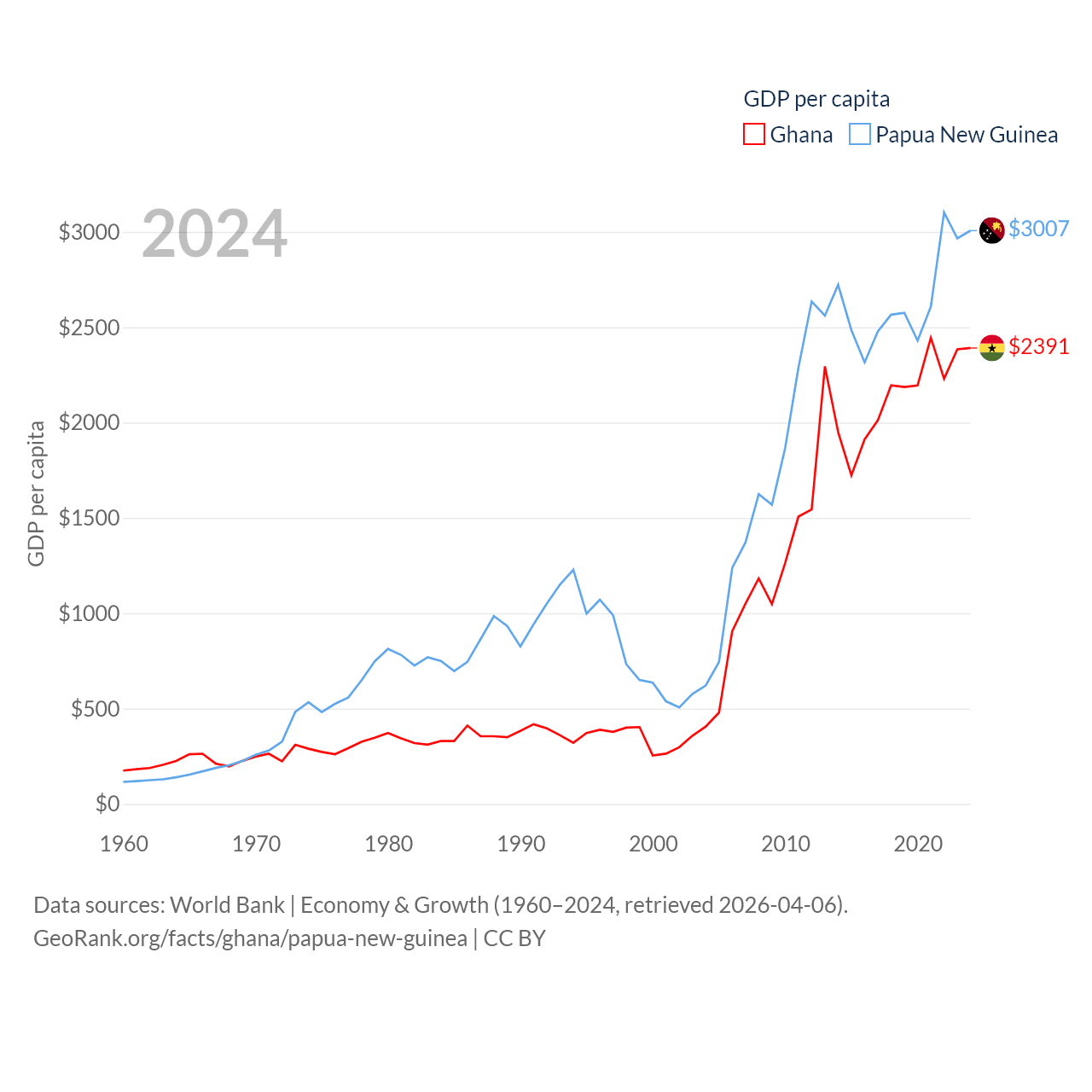 By GDP, Ghana ranks 80/197 ($82.3B) and Papua New Guinea ranks 110/197 ($31.8B). By GDP per capita, Ghana ranks 151/197 ($2,391), while Papua New Guinea ranks 140/197 ($3,007).