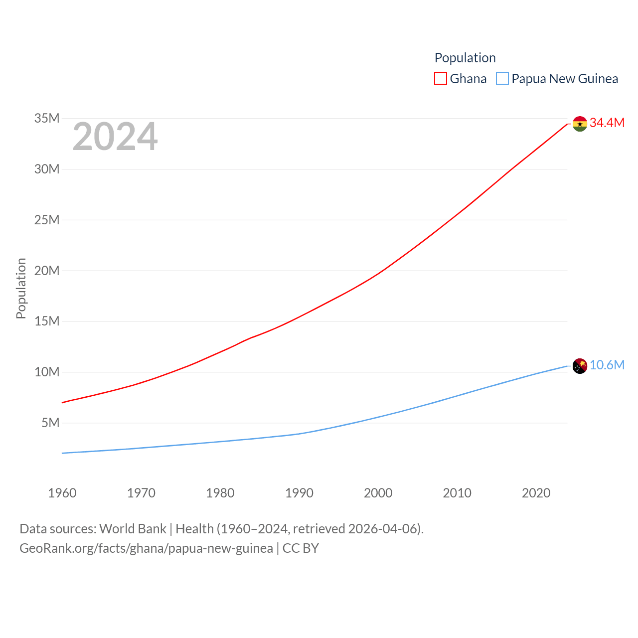 Ghana has a population of 34.4M (ranked 47/197), compared with 10.6M in Papua New Guinea (ranked 92/197). Ghana's land area is 87,851 sq mi versus 174,850 sq mi for Papua New Guinea (ranked 81st vs. 54th).