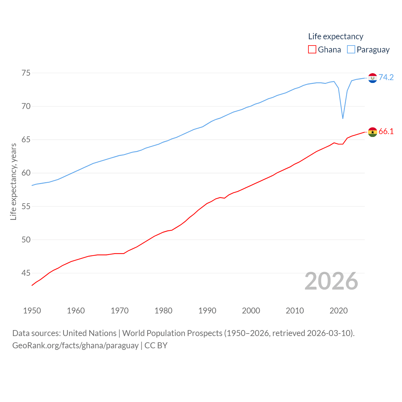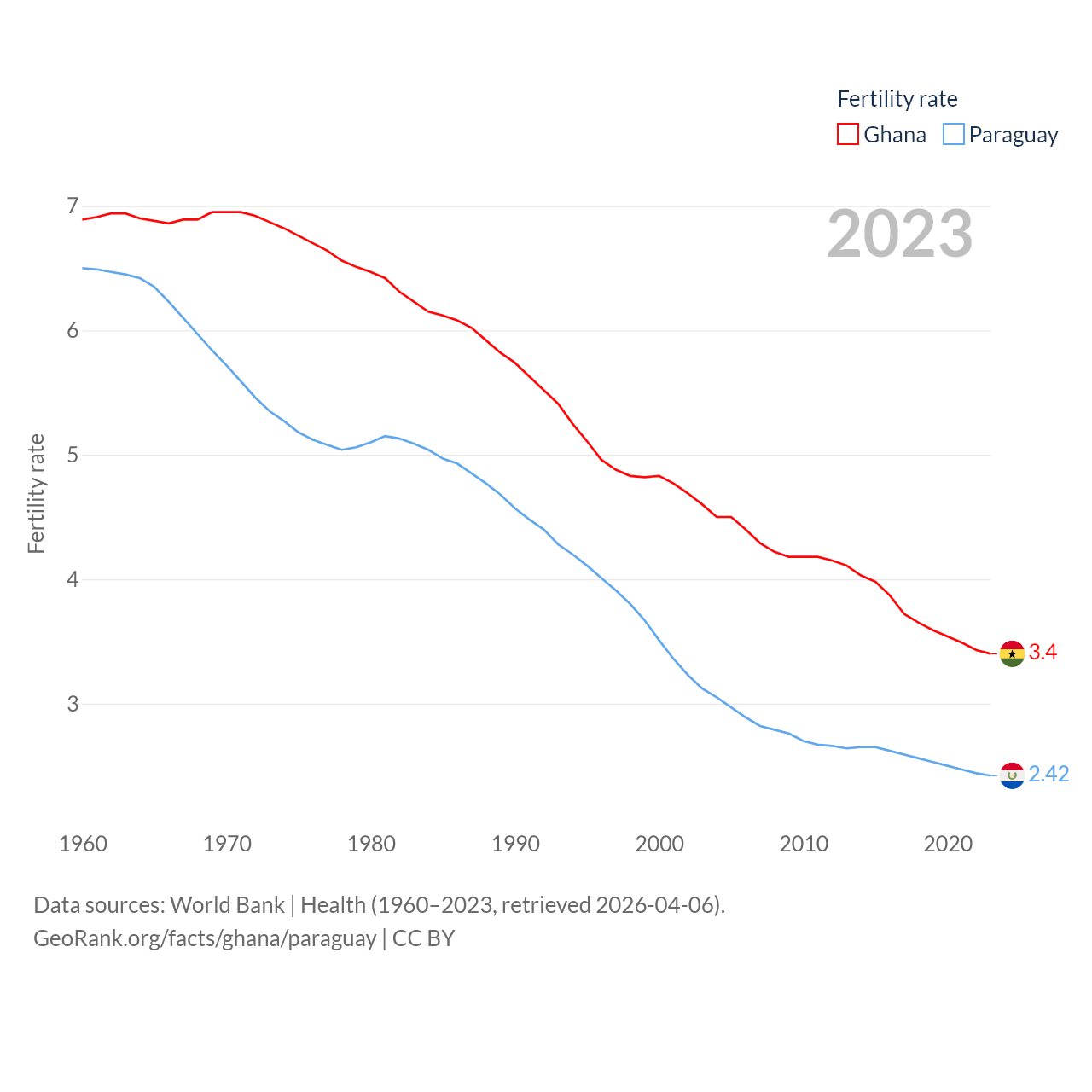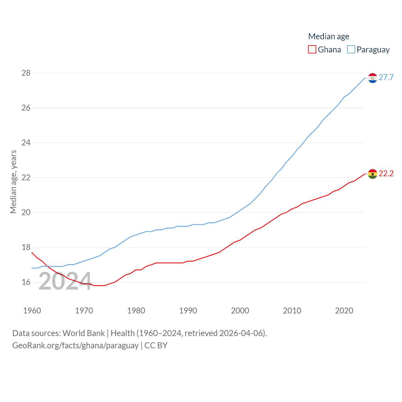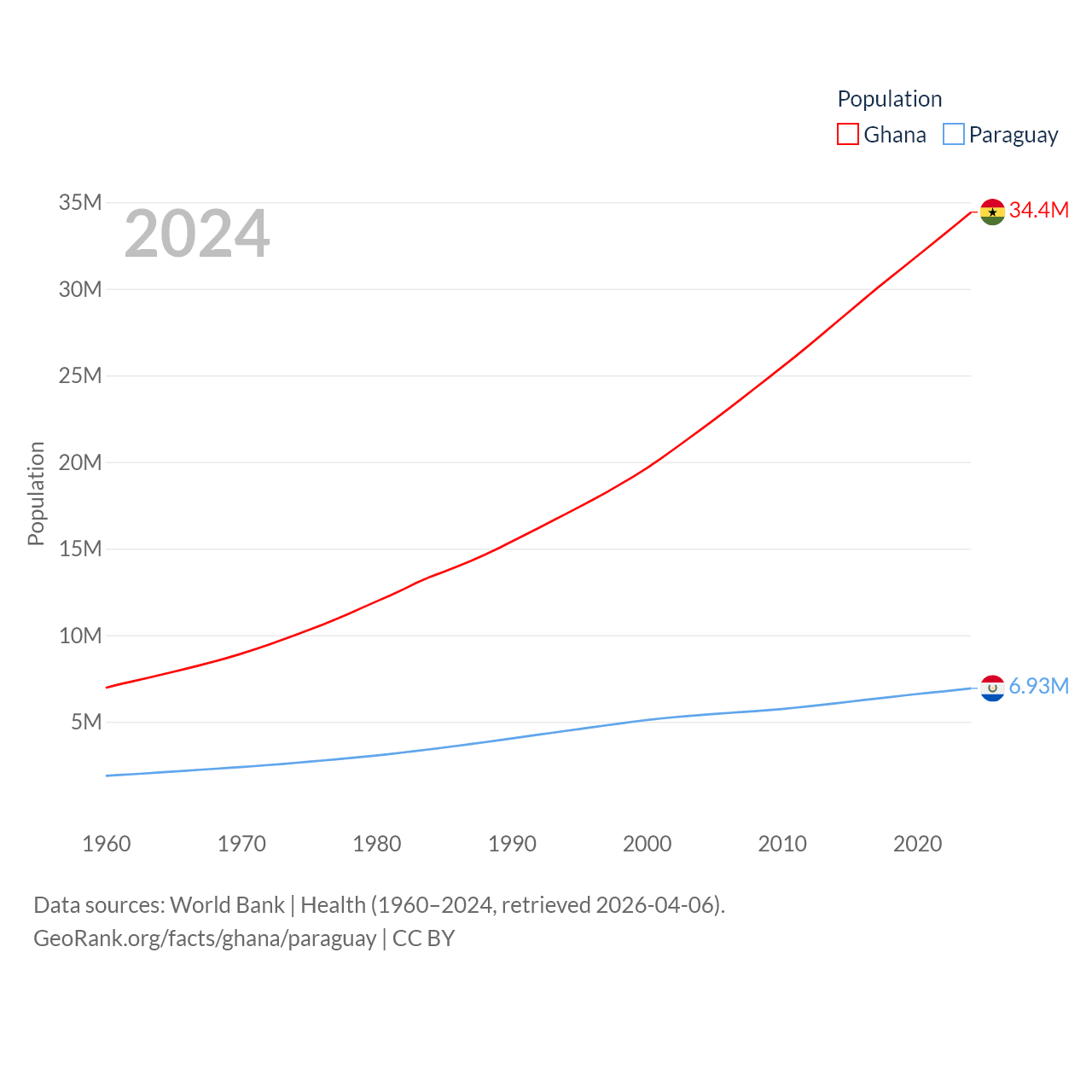 Ghana has a population of 34.4M (ranked 47/197), compared with 6.93M in Paraguay (ranked 107/197). Ghana's land area is 87,851 sq mi versus 152,901 sq mi for Paraguay (ranked 81st vs. 59th).