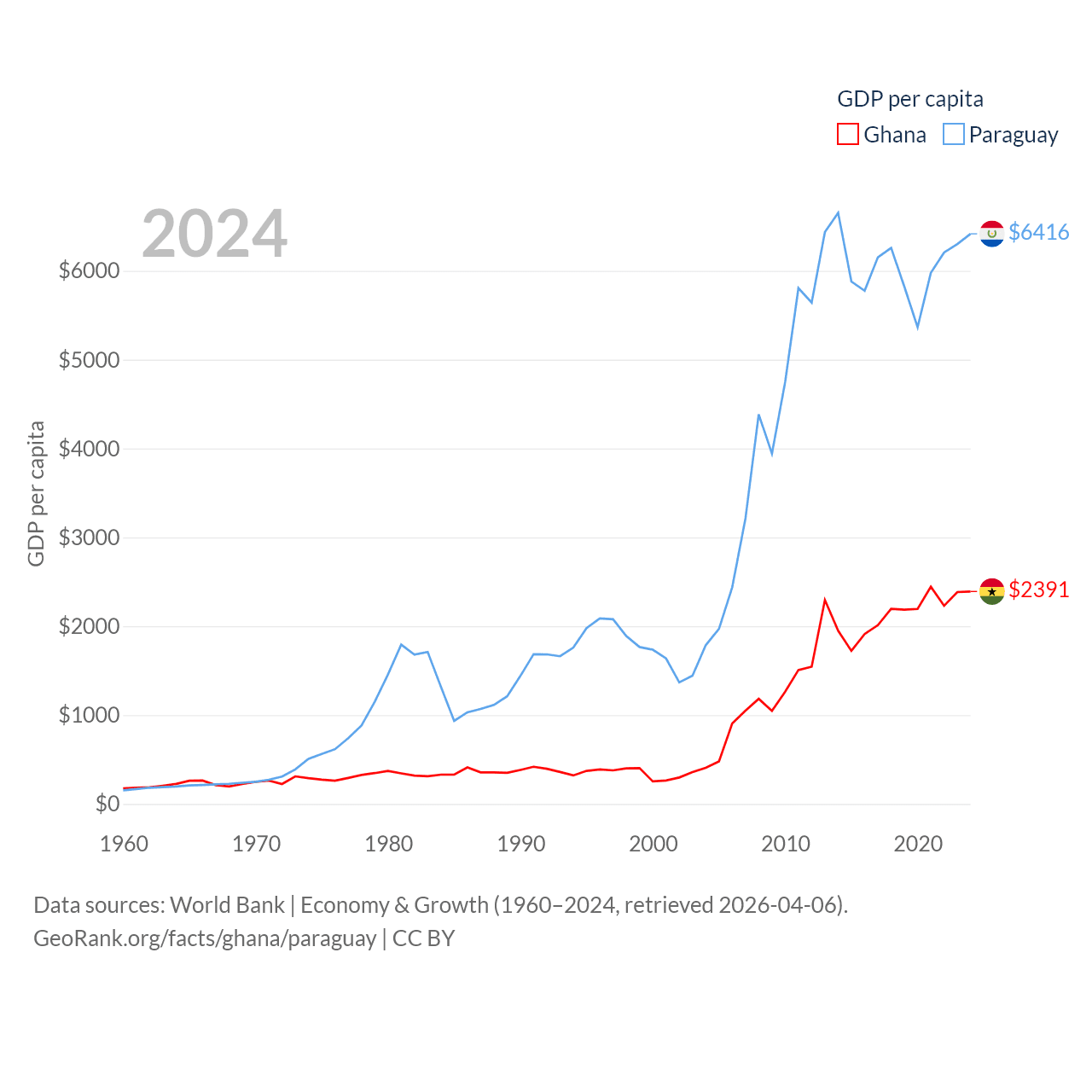 By GDP, Ghana ranks 80/197 ($82.3B) and Paraguay ranks 98/197 ($44.5B). By GDP per capita, Ghana ranks 151/197 ($2,391), while Paraguay ranks 109/197 ($6,416).