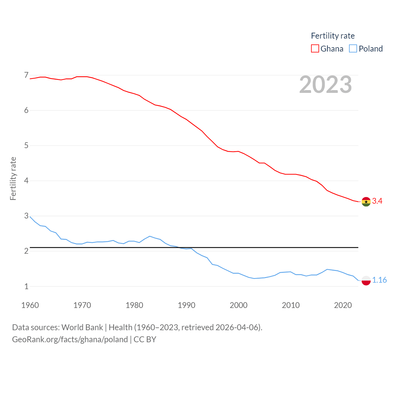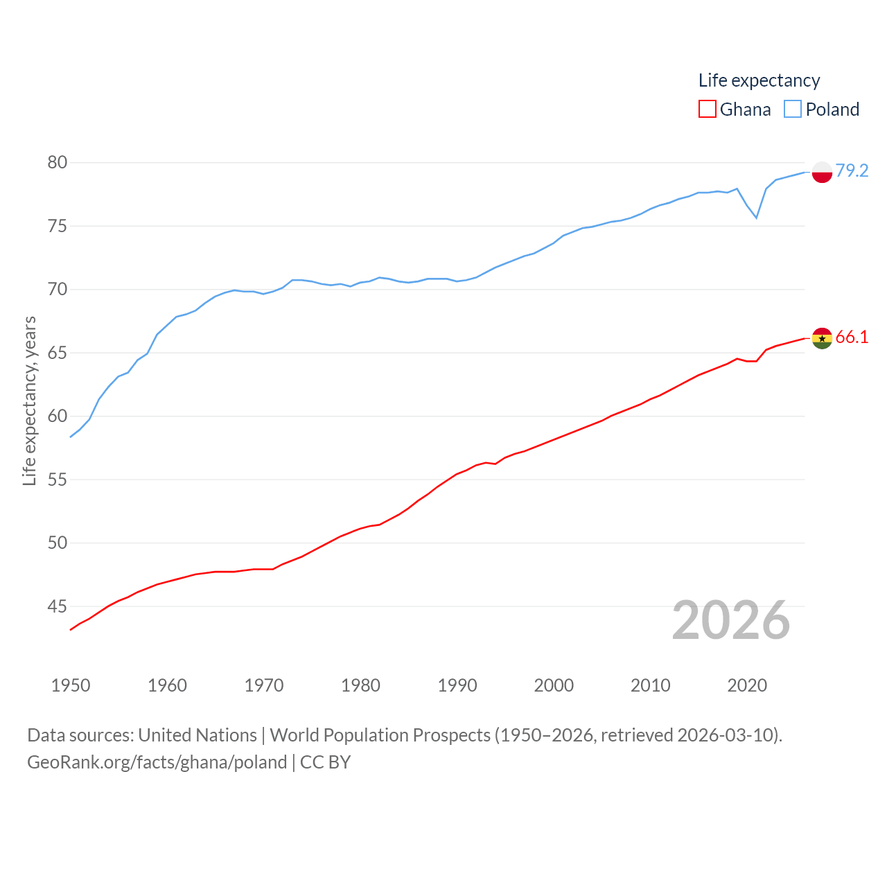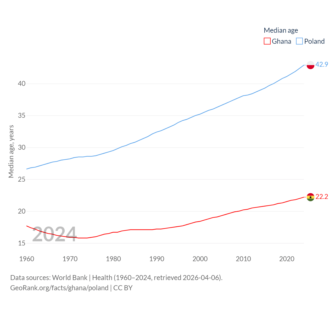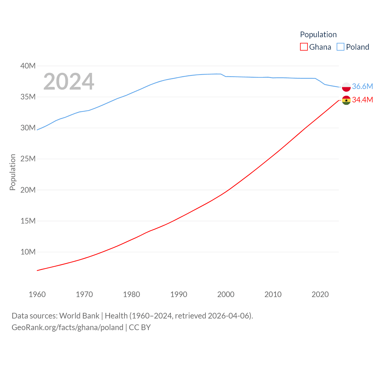 Ghana has a population of 34.4M (ranked 47/197), compared with 36.6M in Poland (ranked 42/197). Ghana's land area is 87,851 sq mi versus 118,252 sq mi for Poland (ranked 81st vs. 69th).