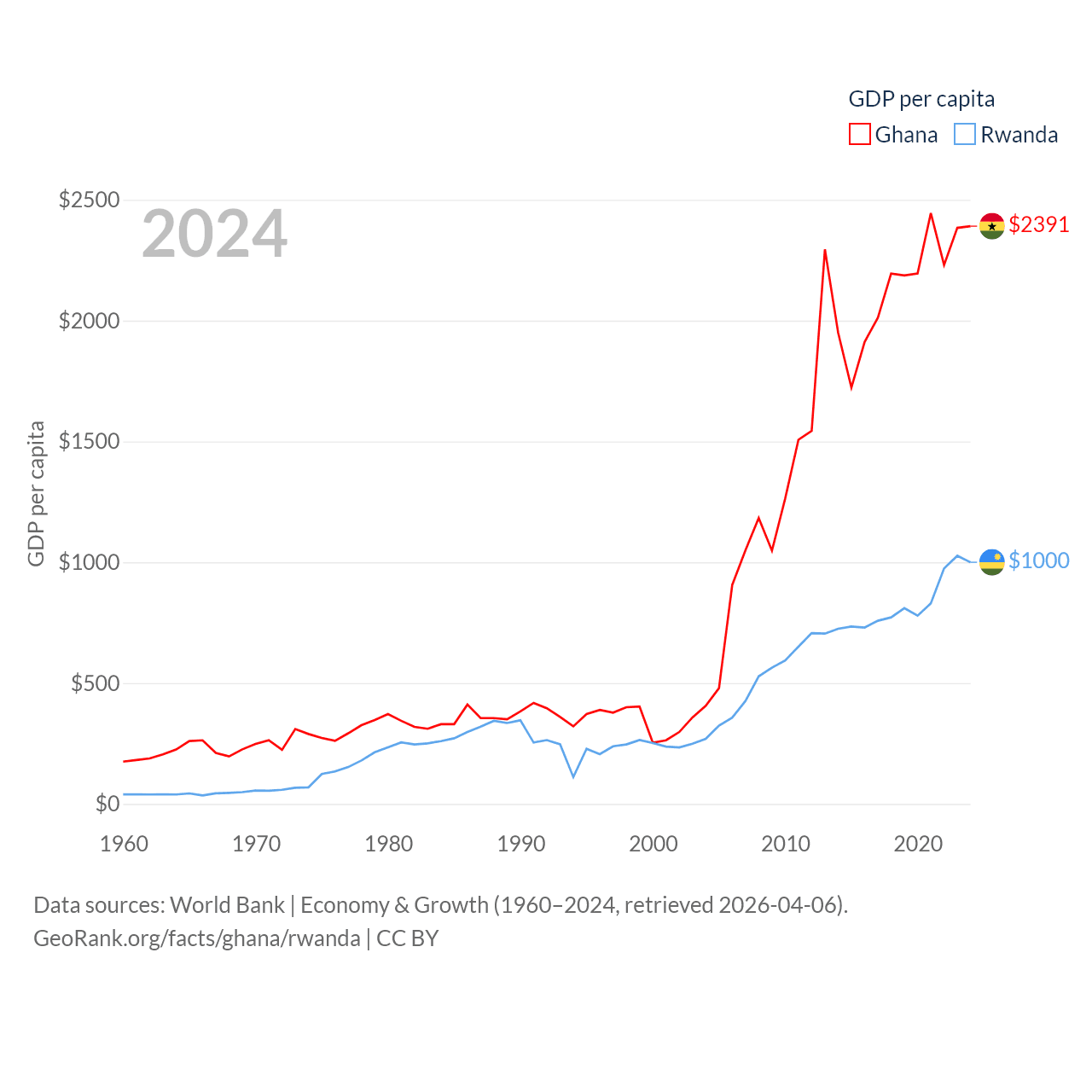 By GDP, Ghana ranks 80/197 ($82.3B) and Rwanda ranks 144/197 ($14.3B). By GDP per capita, Ghana ranks 151/197 ($2,391), while Rwanda ranks 178/197 ($1,000).