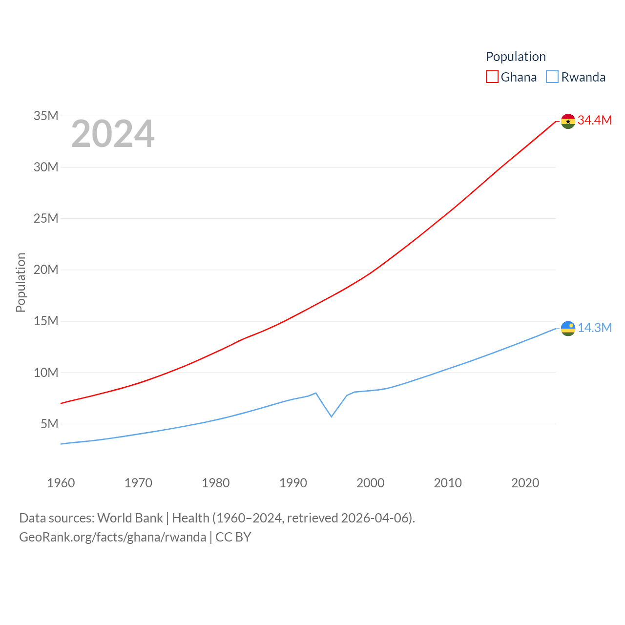 Ghana has a population of 34.4M (ranked 47/197), compared with 14.3M in Rwanda (ranked 77/197). Ghana's land area is 87,851 sq mi versus 9,525 sq mi for Rwanda (ranked 81st vs. 146th).