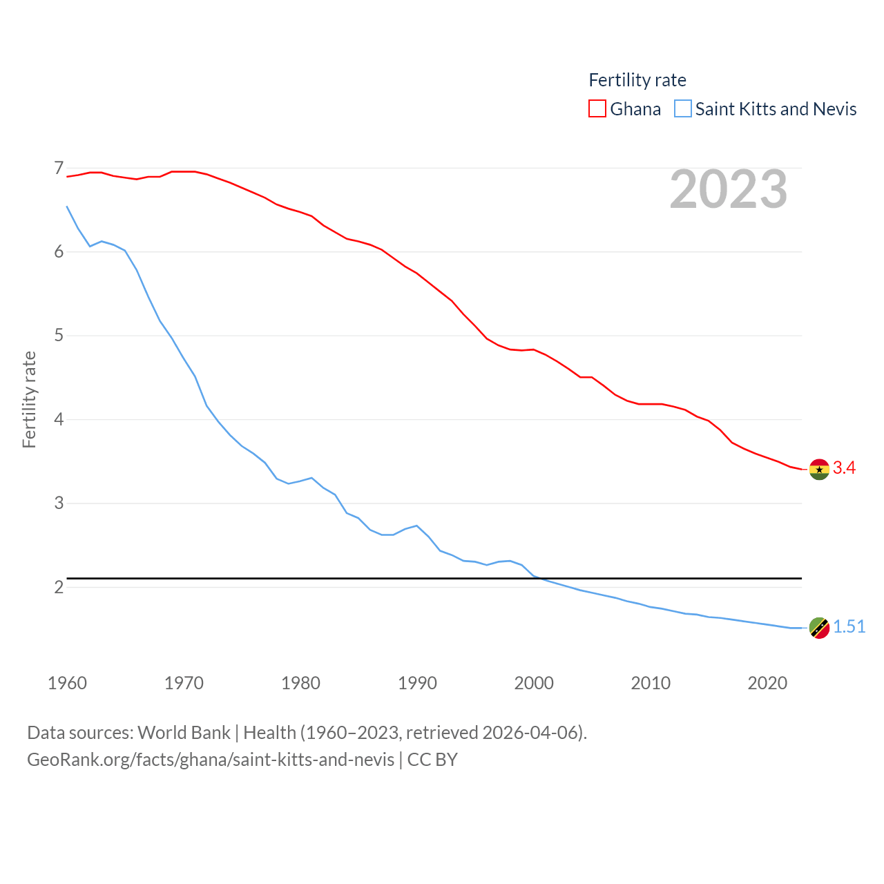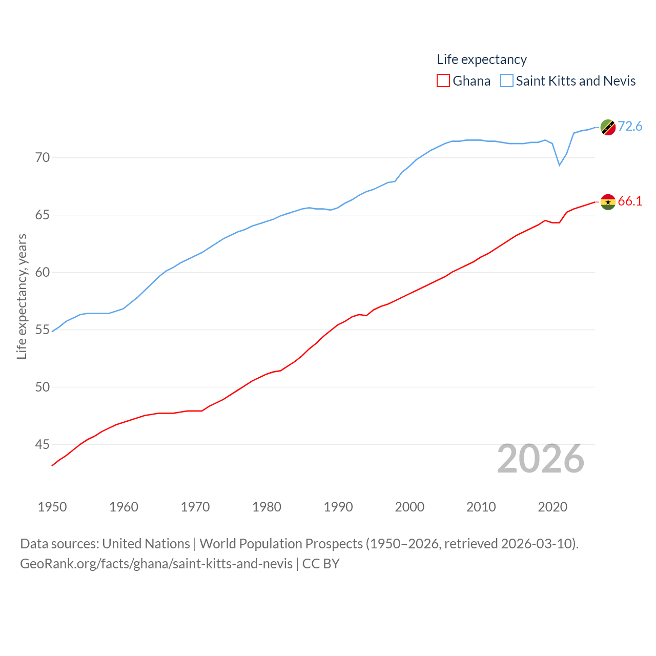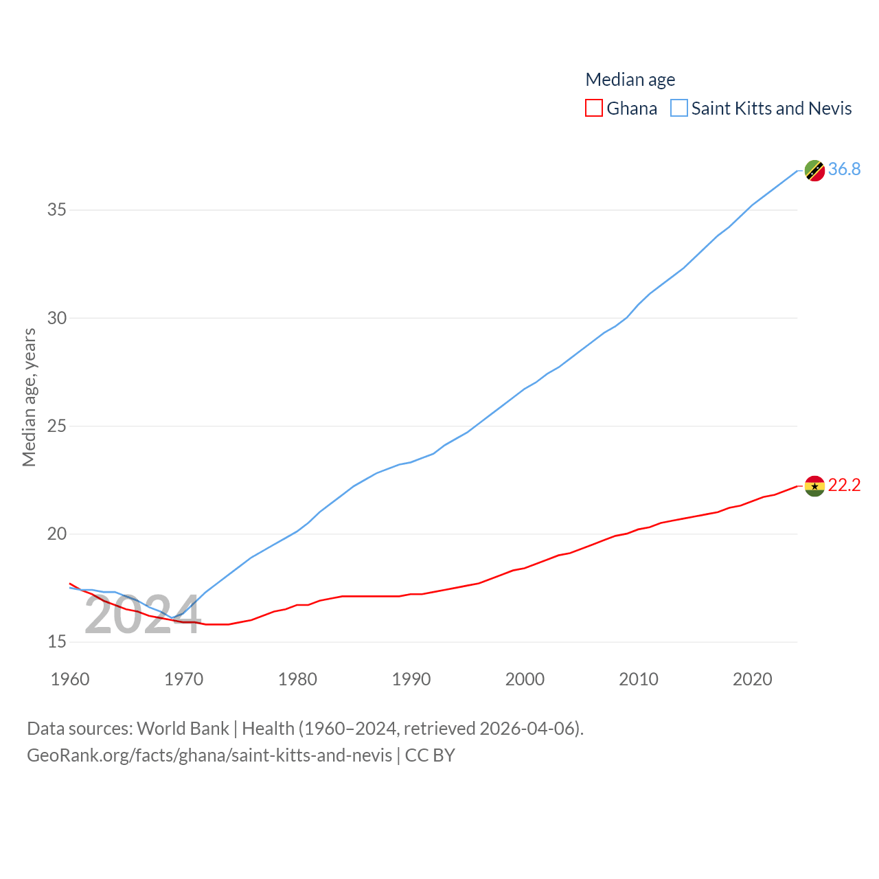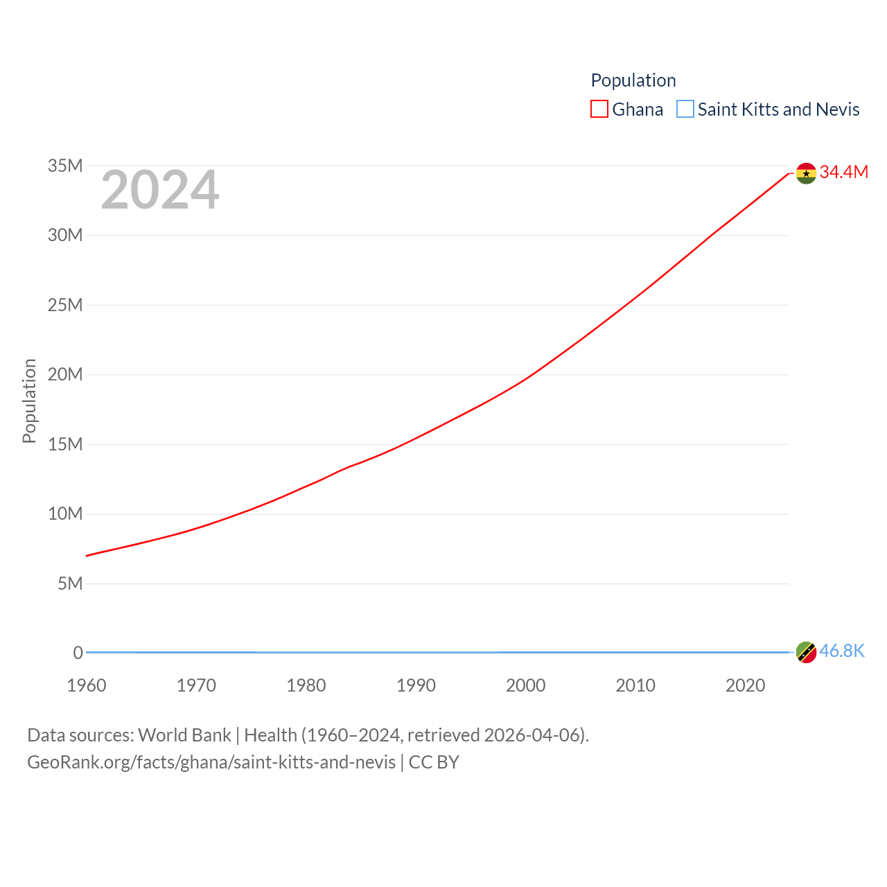 Ghana has a population of 34.4M (ranked 47/197), compared with 46.8K in Saint Kitts and Nevis (ranked 189/197). Ghana's land area is 87,851 sq mi versus 100.4 sq mi for Saint Kitts and Nevis (ranked 81st vs. 189th).