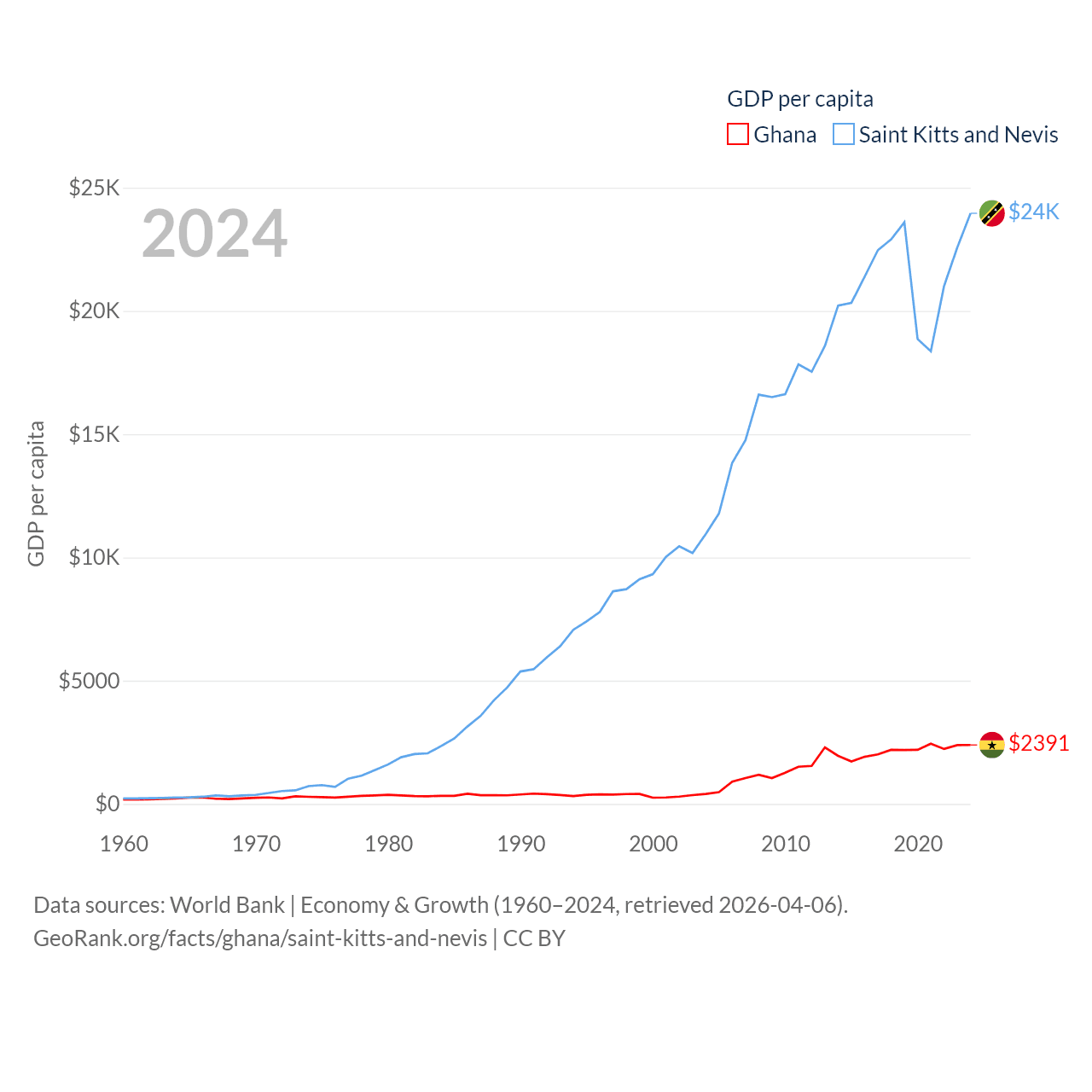 By GDP, Ghana ranks 80/197 ($82.3B) and Saint Kitts and Nevis ranks 187/197 ($1.12B). By GDP per capita, Ghana ranks 151/197 ($2,391), while Saint Kitts and Nevis ranks 51/197 ($23,961).