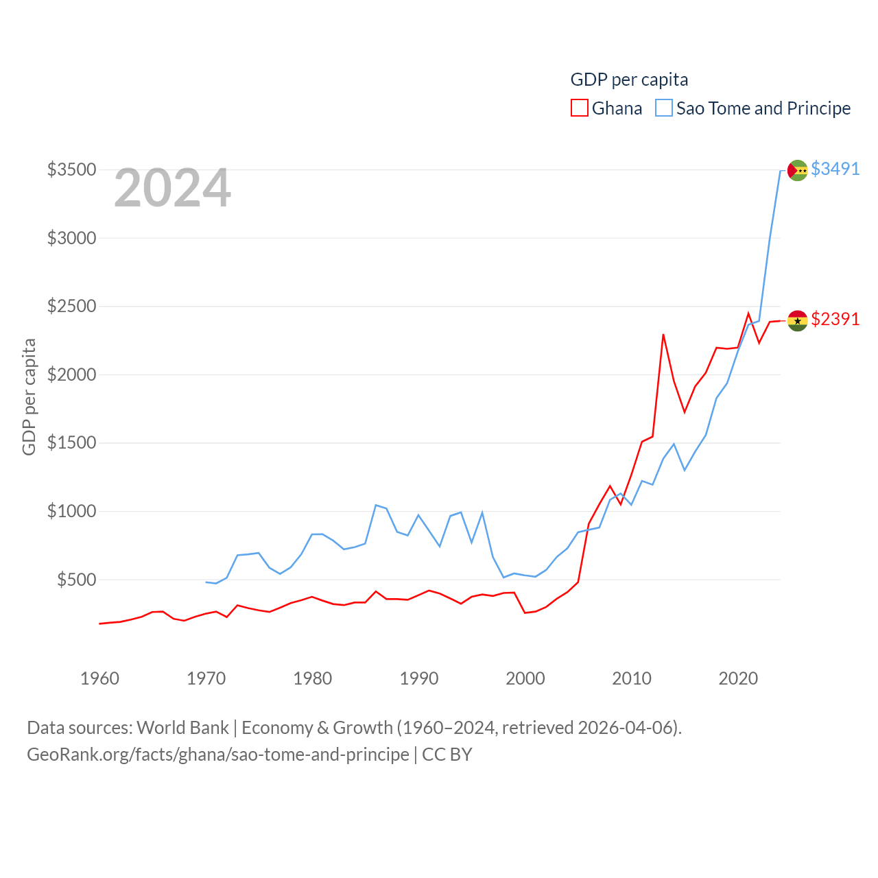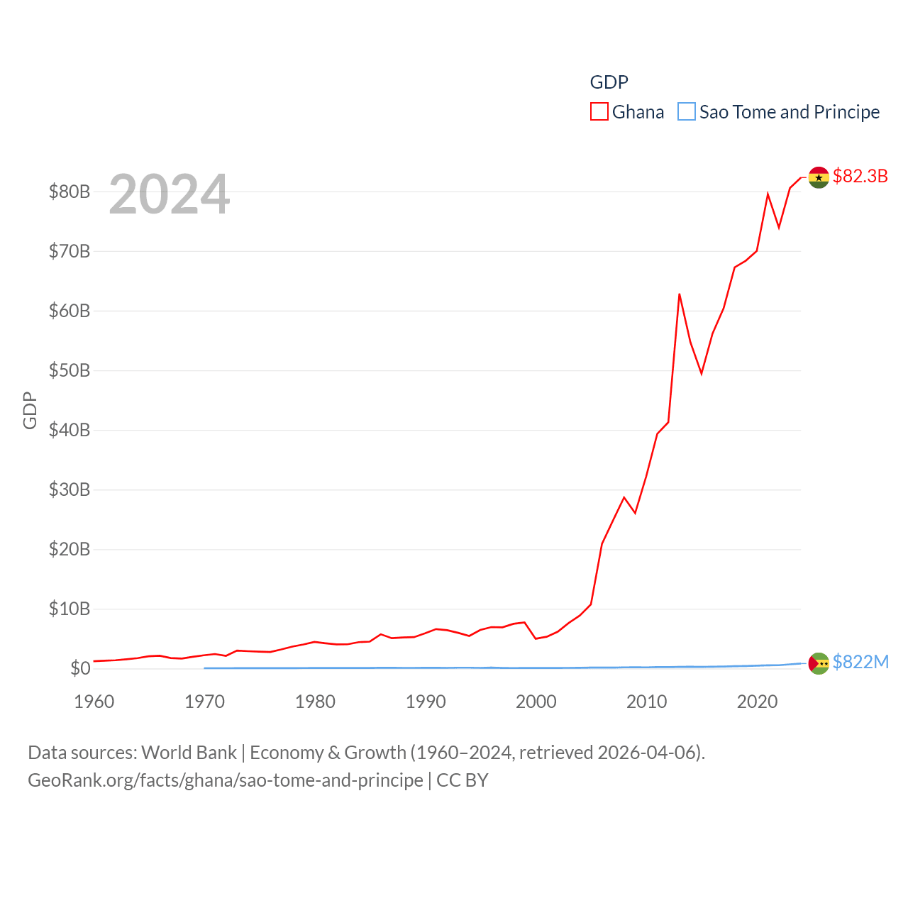 By GDP, Ghana ranks 80/197 ($82.3B) and Sao Tome and Principe ranks 189/197 ($822M). By GDP per capita, Ghana ranks 151/197 ($2,391), while Sao Tome and Principe ranks 134/197 ($3,491).