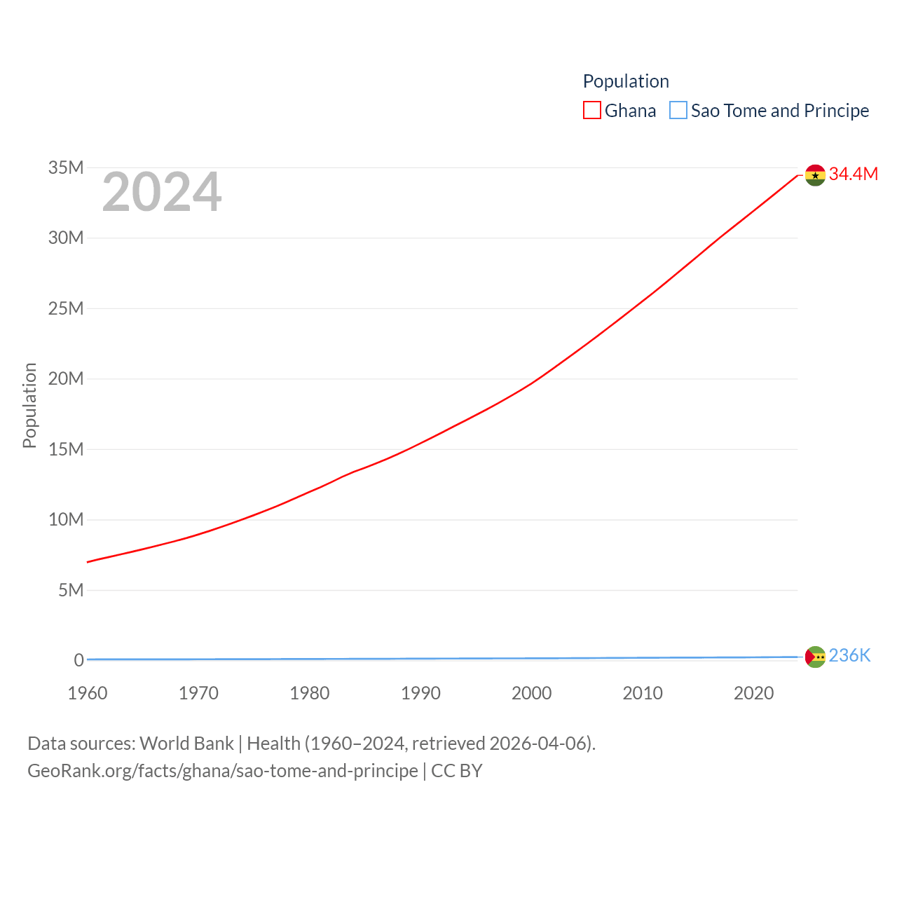 Ghana has a population of 34.4M (ranked 47/197), compared with 236K in Sao Tome and Principe (ranked 176/197). Ghana's land area is 87,851 sq mi versus 371 sq mi for Sao Tome and Principe (ranked 81st vs. 172nd).