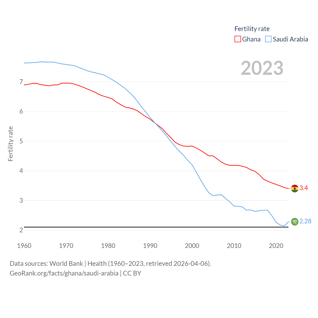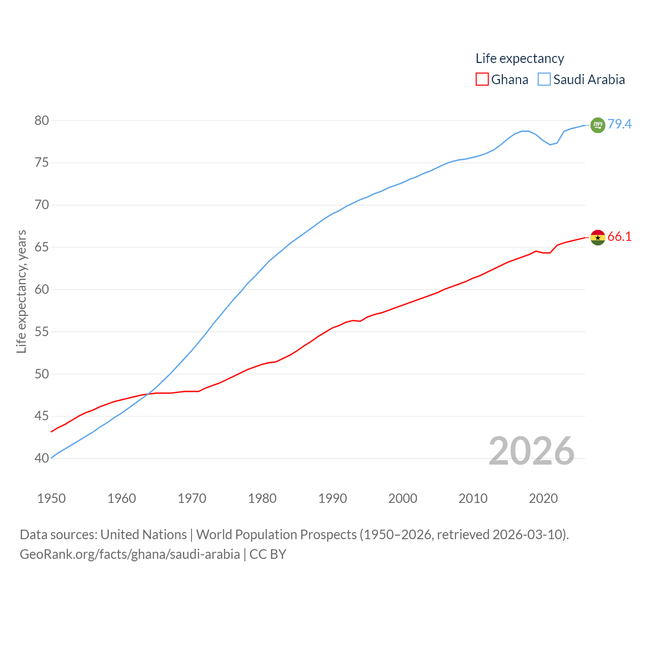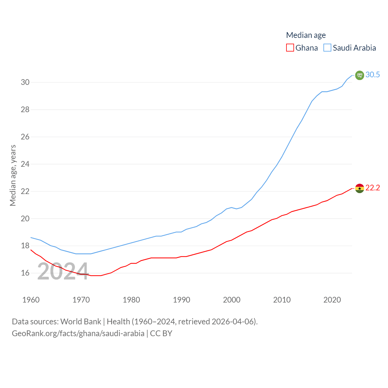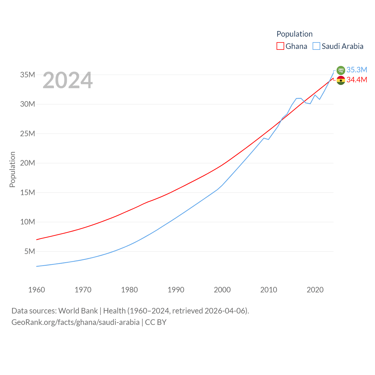 Ghana has a population of 34.4M (ranked 47/197), compared with 35.3M in Saudi Arabia (ranked 45/197). Ghana's land area is 87,851 sq mi versus 830,000 sq mi for Saudi Arabia (ranked 81st vs. 12th).