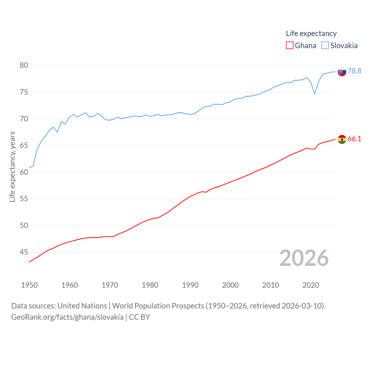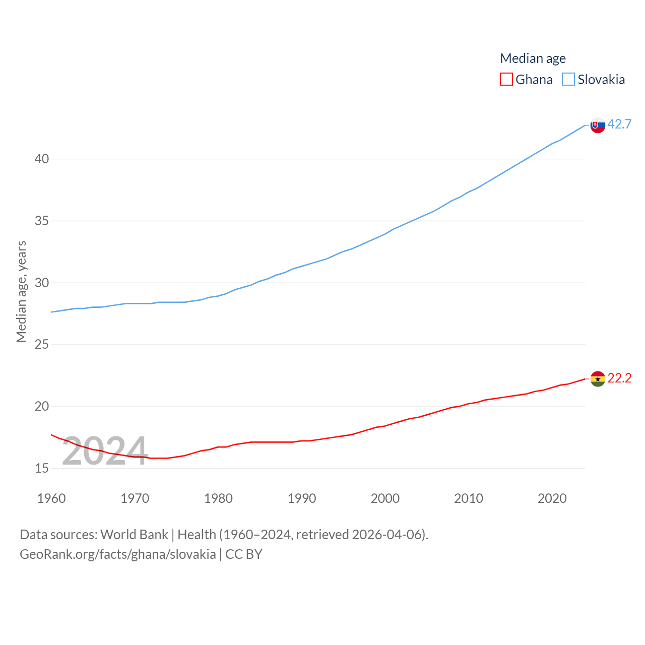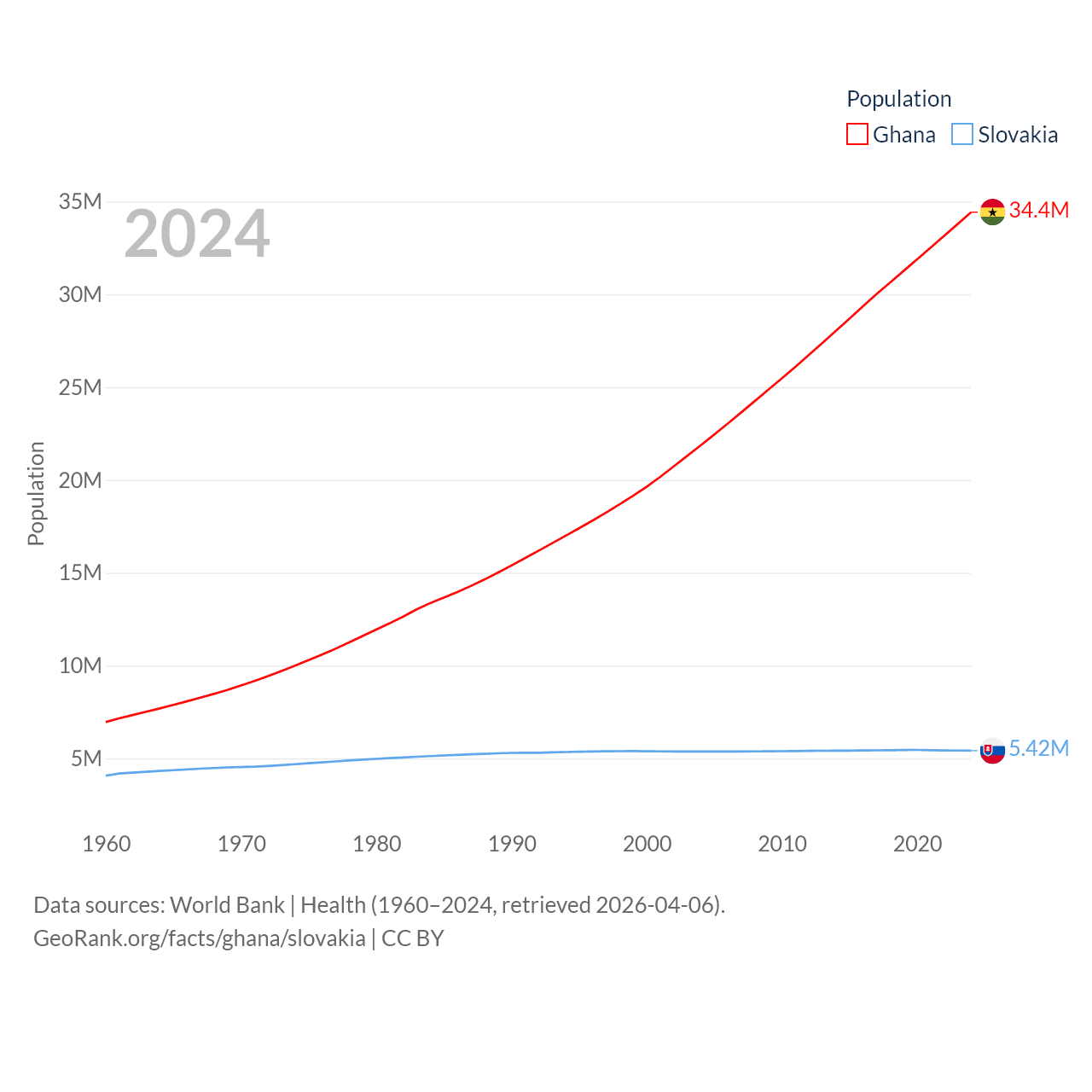 Ghana has a population of 34.4M (ranked 47/197), compared with 5.42M in Slovakia (ranked 119/197). Ghana's land area is 87,851 sq mi versus 18,564 sq mi for Slovakia (ranked 81st vs. 128th).